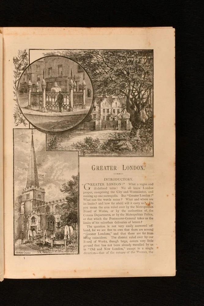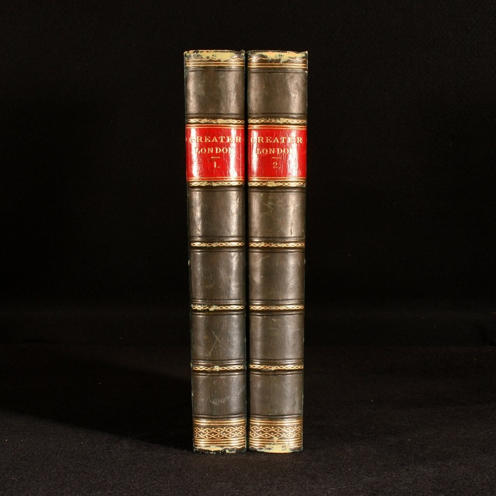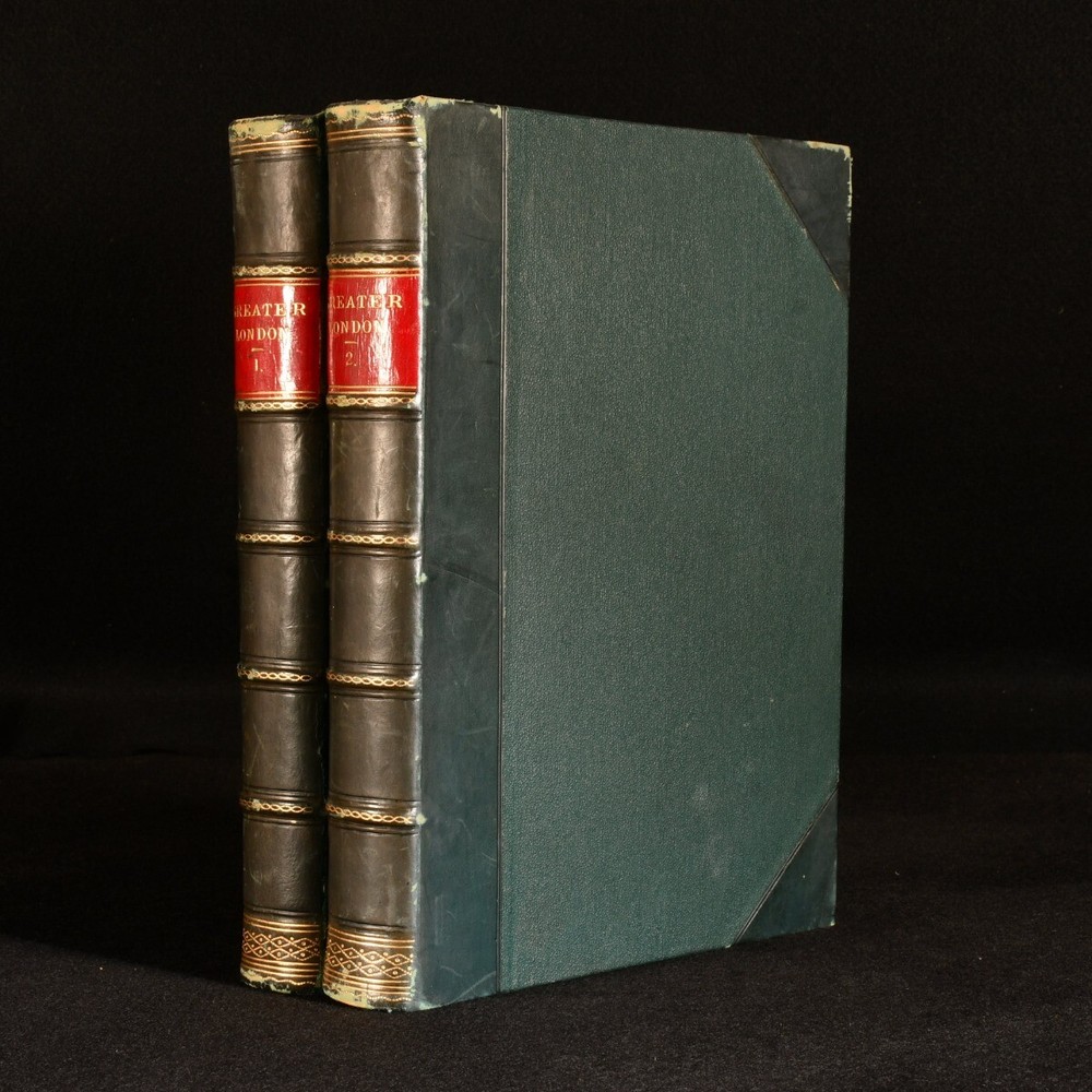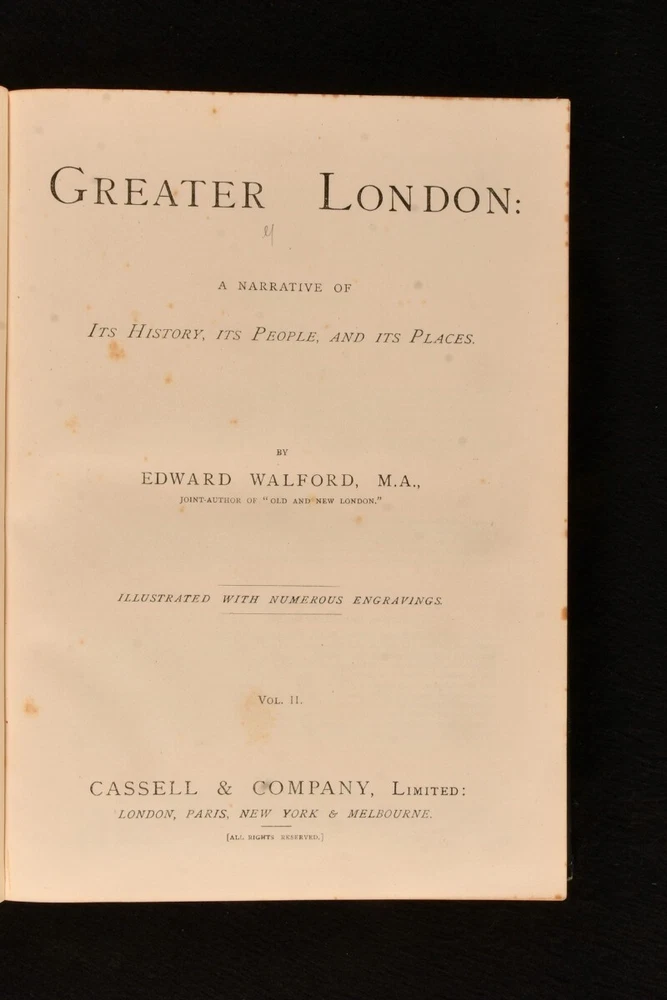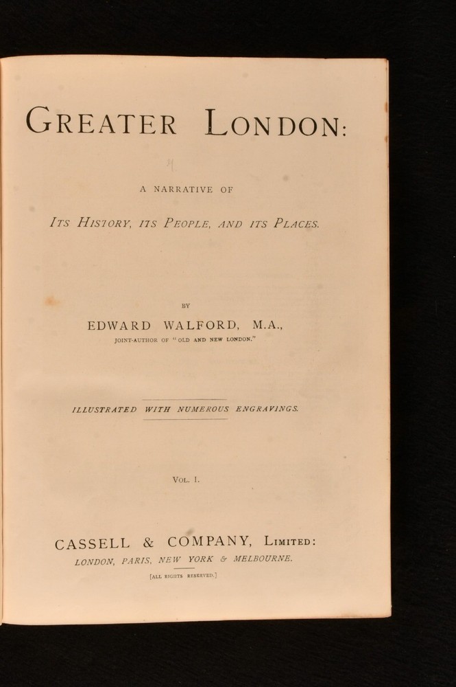 Click here to see our other books! Greater London: A Narrative of its History, its People, and its Places Edward Walford 1898 Cassell and Company Ltd : London 11" by 8" xvi, 576; xv, 560pp. SUMMARY A sweeping illustrated study of the history, topography and inhabitants of Greater London, complete in two volumes. Illustrated,Leather Binding Overall Condition: Very Good This book weighs 3 KG when packed UK Postage: £ 3.99 US Postage: £ 36.99 EU Postage : £ 25.99 European Postage: £ 27.99 Asia Postage: £ 47.99 Worldwide Postage: £ 69.99 DESCRIPTION A two-volume work in half calf bindings. Illustrated with a frontispiece and numerous in-text illustrations to each volume, with a folding map of Greater London to Volume I. Collated, complete. A historical and topographical study of Greater London by Edward Walford (1823–1897), a British magazine editor who also compiled educational, genealogical and tourism works. Illustrated throughout, these two volumes provide information on many towns and areas of Greater London, with notes on their inhabitants. Undated, dated through copies held at the British Library. CONDITION In half calf bindings. Externally generally smart, with rubbing to the spines and extremities. Internally, firmly bound. Pages are generally bright and clean, with spotting to the first and last few pages, and to the fore edge, affecting the occasional page. A few closed tears to the folding map. Overall Condition: Very Good GLOSSARY OF TERMS Overall Condition (Dustwrapper condition rating is shown after that for the book itself, where a dustwrapper is present) Fine - Very well preserved copy showing very little wear Very Good Indeed - Only one or two minor faults, really a very attractive copy Very Good - Quite a wide term meaning no major faults but probably several smaller ones often expected given the age of the book, but still a respectable copy Good - Meaning not very good. Some more serious faults as will be described in the condition report under 'condition' Good Only - Meaning one or more faults that could really do with repair Fair - As with good only above but with other faults leaving a compromised copy even after repair Poor - Really bad and possibly seriously incomplete. We only sell books in this condition where their rarity or value makes them attractive none the less. Major defects will be described. GUARANTEE We offer a full money back guarantee on our descriptions. Please ask for details and conditions. We prefer PAYPAL. If you pay via PAYPAL we will post the item off the same or the next working day with the postage you have selected. Please note we cannot accept USD cheques