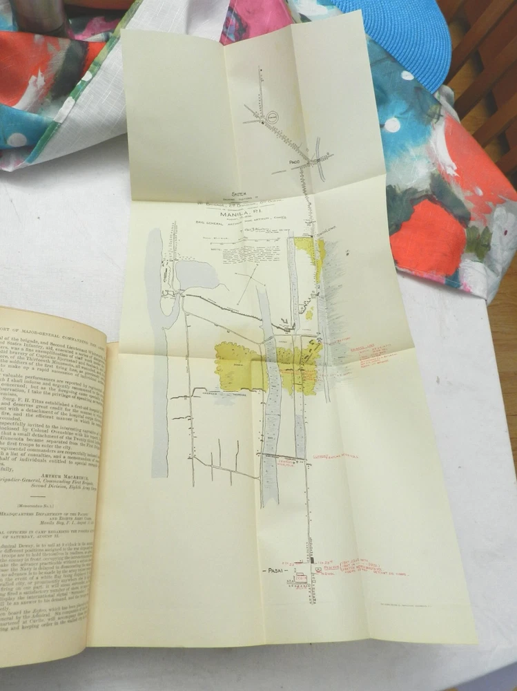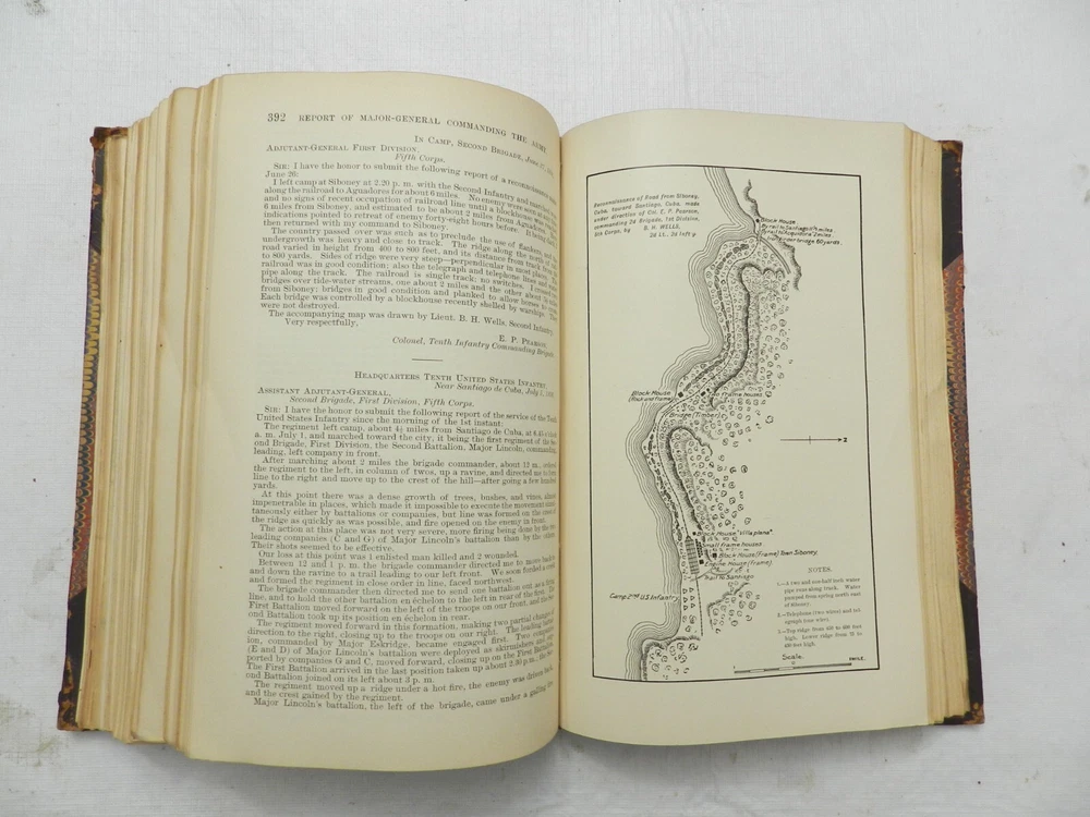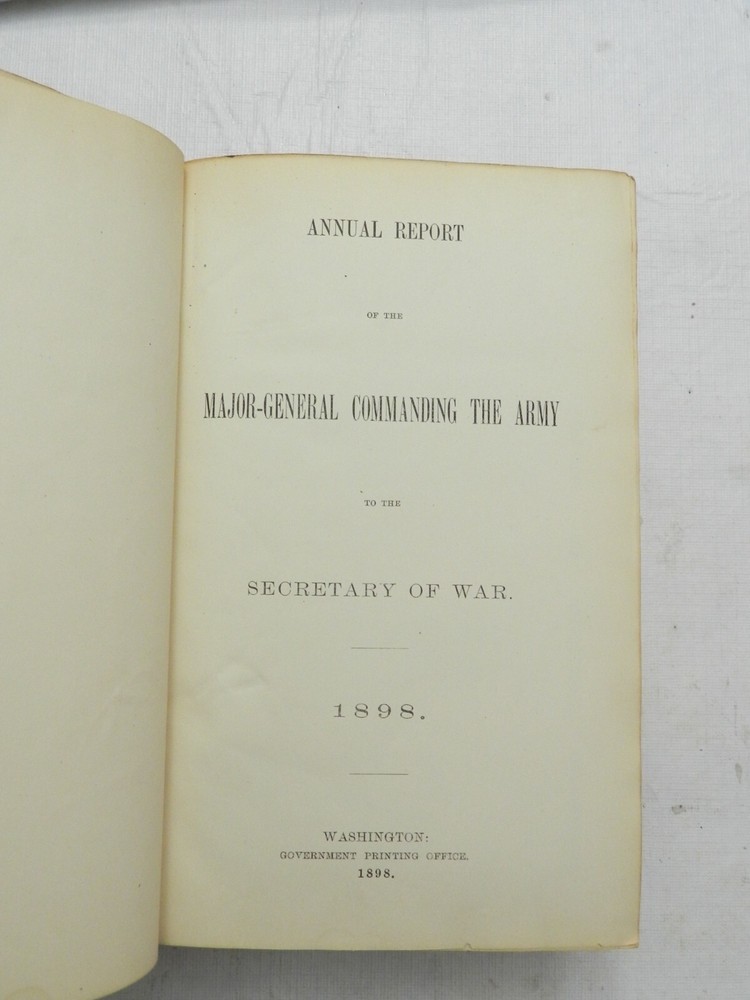 Fully titled, Annual Report of the Major-General Commanding the Army to Secretary of War. Published in 1898 by the US Government Printing Office. No author identified, but some have listed Major General Nelson A. Miles, who is identified at the end of the Preface to the book. Overall in VERY GOOD CONDITION. The original spine titling on leather has been refurbished to still appear on the spine, nice and shiny, although it is cracked and may flake off over time. 3/4 Leather with marbled boards, matching marbled endpapers. Very solidly bound, 676 clean pages with no marks, MANY STUNNING MAPS AND FOLD-OUTS IN SUPERB CONDITION! Especially a large map of Cuba which is one of the first maps of the book - see listing photos. Cliff's Books B132