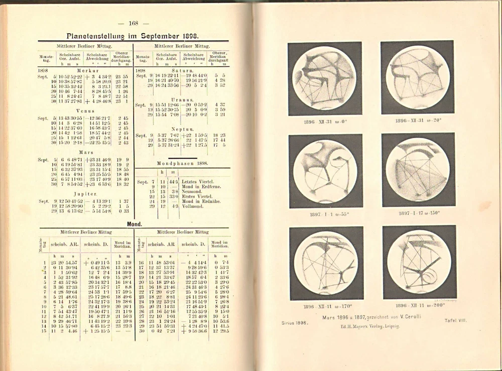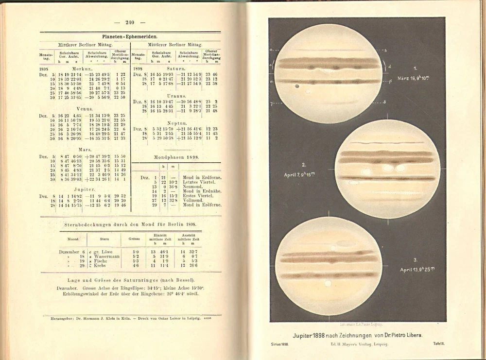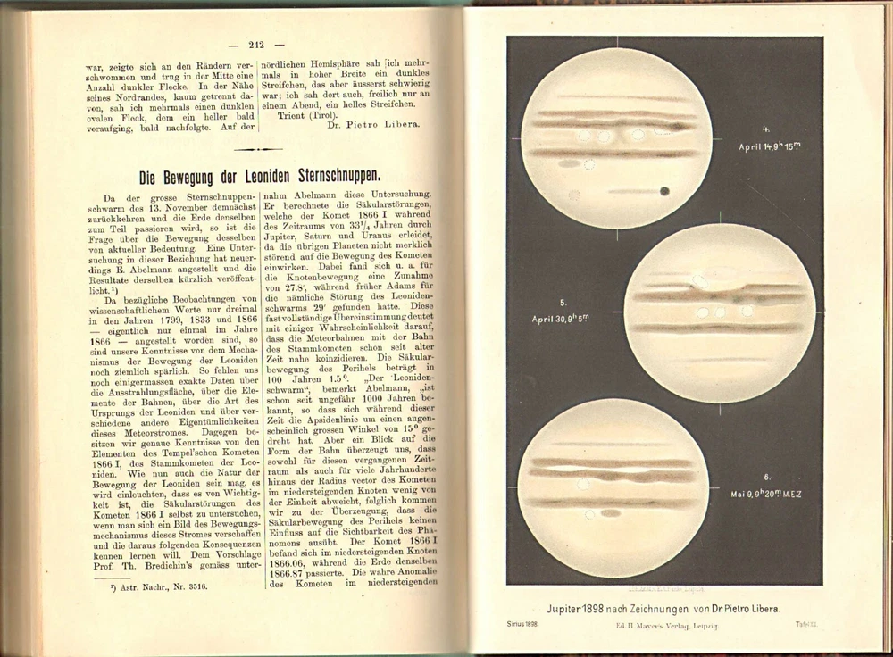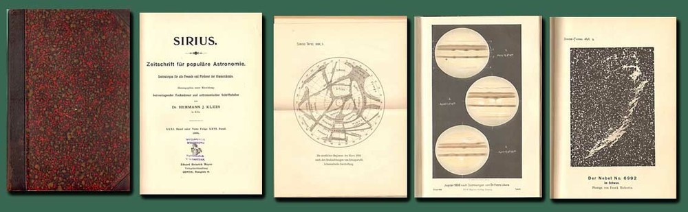 SCARCE 125 YEAR OLD GERMAN AMATEUR ASTRONOMY MAGAZINE WITH ILLUSTRATIONS A BOUND YEAR OF SIRIUS MAGAZINE 1898 Includes 12 Plates including a 2 page north polar map of Mars after Schiaparelli, several Lunar phots, color drawings of Jupiter, and a photo of the Cygnus Loop nebula (NGC 6992) by pioneer astrophotographer Isaac Roberts , etc. Description: Dr. Hermann Klein, editor: SIRIUS: Zeitschrift für Populäre Astronomie, V 26, 12 monthly issues, Leipzig. 1898; 6.5 x 9 in; Pages numbered from 1-288. 12 full page plates. A few charts, mostly of positions of the Jovian or Saturnian Moons. Condition: Hardbound in quarter leather over marbled boards. There is a library stamp on the title page, but otherwise no library marks. Only slight wear at extremities of cover. Interior is clean, tightly bound, and unmarked throughout with crisp page edges and all 12 plates in good condition. Overall VG++. Information: An informative and unusual old compilation of popular astronomy articles from Germany, in German, with some seldom-seen illustrations. Articles about lunar features, eclipses, meteors, nebulae and star clusters, observatories (Lowell observatory and the Baden observatory), Venus, Jupiter, the sun, , etc.. Variable stars, comets, astronomical instruments, etc.. A nice addition to any library on astronomy, stars, galaxies, astrophotography, amateur astronomy, history of astronomy, planets, astronomical instruments, telescopes, etc. etc. I have other volumes of this magazine available—please inquire if interested. VISIT MY EBAY STORE FOR OTHER ITEMS OF INTEREST(Click This Link) Please inquire about discounts for purchases of multiple items. Shipping: Free media rate shipping in US. Higher international postage as appropriate (See shipping and payments tab on this listing page for details). We make every attempt to describe items clearly and completely. Please read our listings carefully, inspect posted images of the item, and let us know if you have any questions before you bid. All buyers must pay according to Ebay policies. If you have any questions about this, please email me. International bidders should contact me for a quote on shipping before bidding. Whenever possible, international shipping will be in Priority flat rate envelopes. Import duties, taxes and charges are not included in the item price or shipping charges. These charges are the buyer's responsibility. Please check with your country's customs office to determine what these additional costs will be prior to bidding/buying .