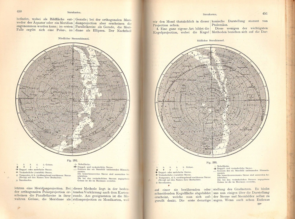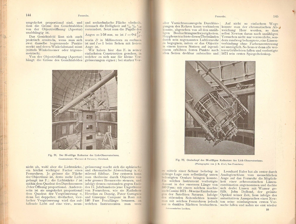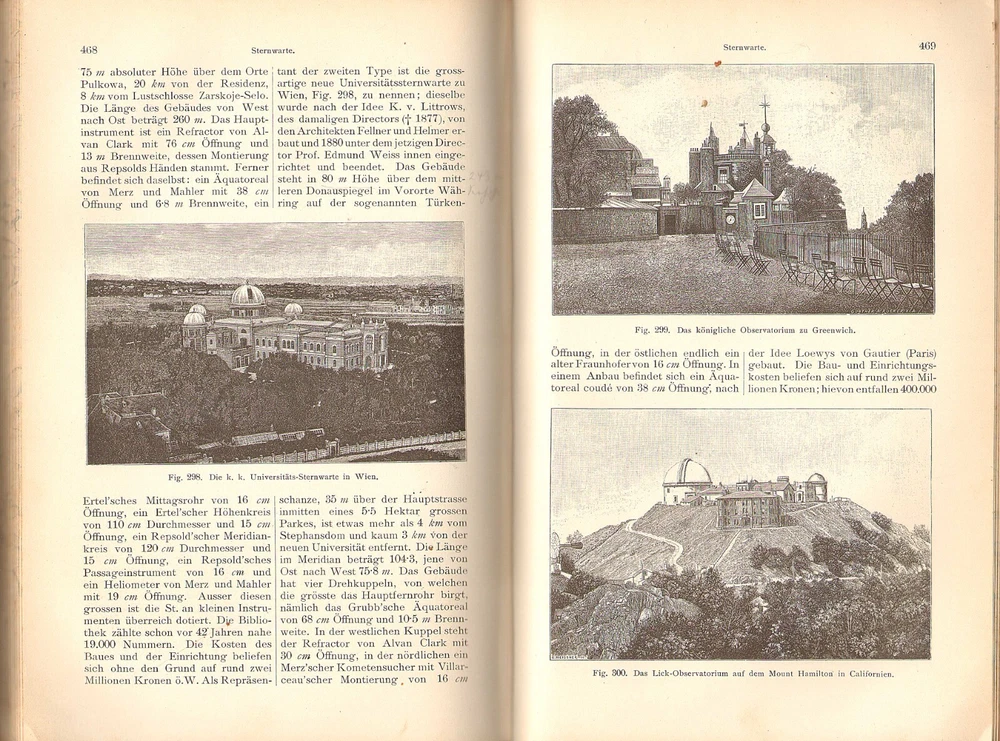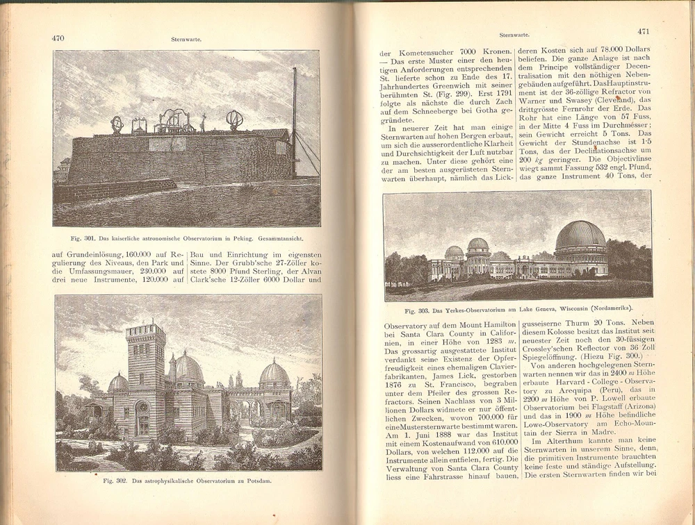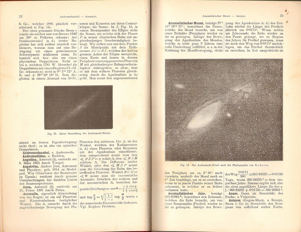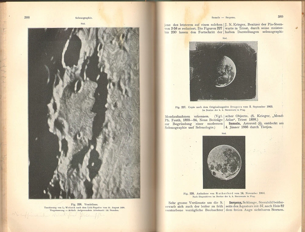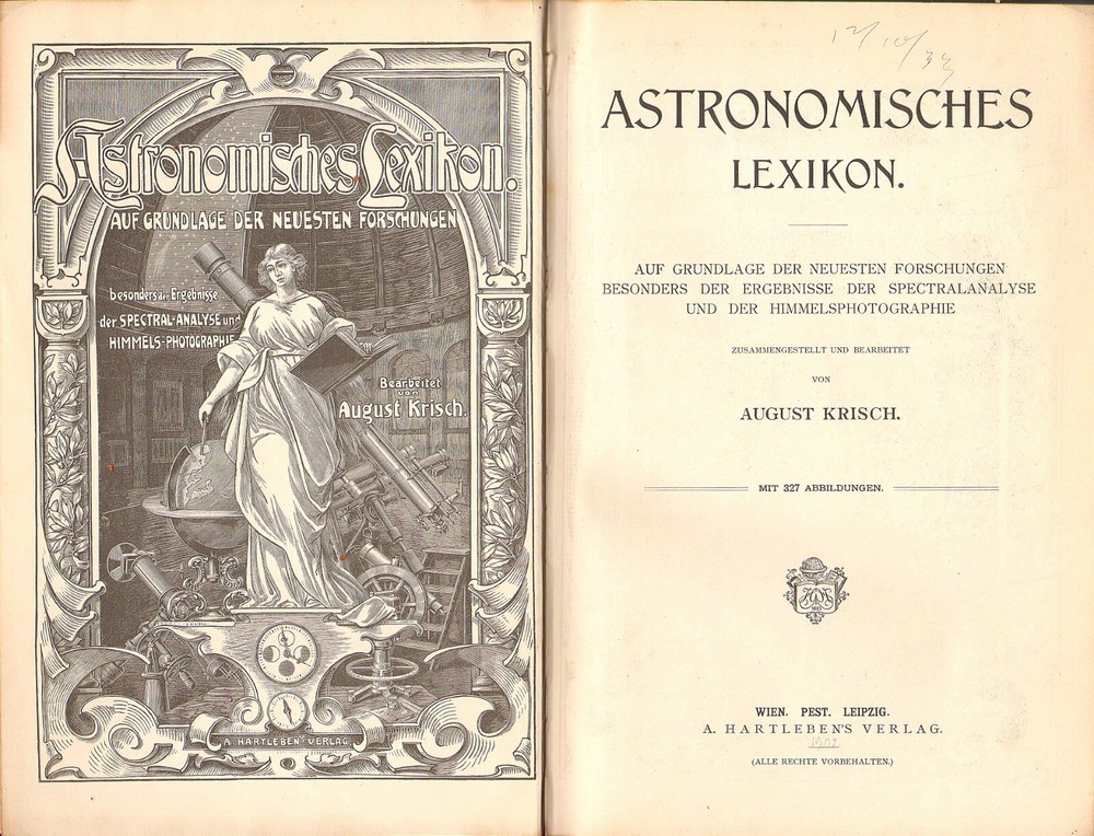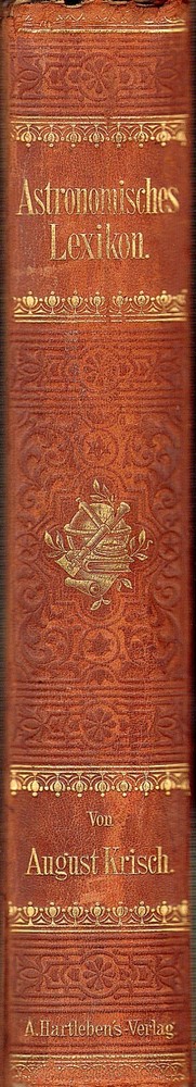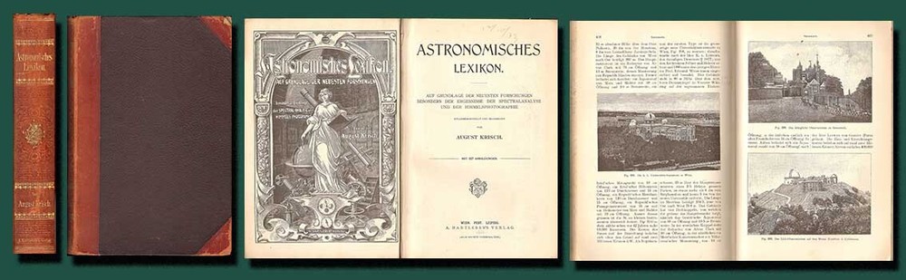 A WELL ILLUSTRATED COMPENDIUM OF GERMAN ASTRONOMY TERMS FROM A CENTURY AGO ASTRONOMISCHES LEXICON By August Krisch 1902 Vienna publication in a nice quarter leather binding; 327 engravings in text. Description: August Krisch ASTRONOMISCHES LEXIKON auf Grundlage der Neuesten Forschunge Besonders der Ergebnisse der Spectralanalyse und der Himmelsphotographie [ An Astronomical Dictionary based on the latest research, especially the revelations of spectral analysis and astrophotography ] Wien: A. Hartleben's Verlag, 1904, 10 x 7 in., 629 pp. . 327 illustrations. Condition: Hardbound in quarter leather over black pebbled boards. Gilt title on spine. Page edges marbled and endpapers patterned. Corner worn to boards and spine ends slightly frayed. A few light marginal pencil notes. Otherwise clean, tightly bound, and unmarked throughout. (See photos) Information: Though presented as a dictionary or lexicon, this serves as a summary of astronomical knowledge at the beginning of the 20th century. Virtually every topic is covered, including telescopes, observatories, maps of the constellations and of Mars (Schiaparelli's map of the canals), astrophotos of the moon, spectra, etc. Richly illustrated . A great addition to a collection of seminal antiquarian astronomy books. VISIT MY EBAY STORE FOR OTHER ITEMS OF INTEREST(Click This Link) Please inquire about discounts for purchases of multiple items. Shipping: Free media rate shipping in US. Higher international postage as appropriate (See the Shipping and Payment tab on this listing for an estimate and contact us before bidding if you have questions). We make every attempt to describe items clearly and completely. Please read our listings carefully, inspect posted images of the item, and let us know if you have any questions before you bid. All buyers must pay according to Ebay policies. If you have any questions about this, please email me. International bidders should contact me for a quote on shipping before bidding. Whenever possible, international shipping will be via Ebay Standard International Delivery. Import duties, taxes and charges are not included in the item price or shipping charges. These charges are the buyer's responsibility. Please check with your country's customs office to determine what these additional costs will be prior to bidding/buying.