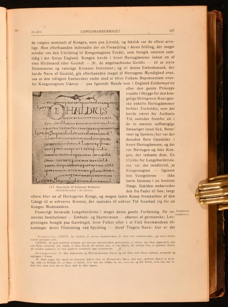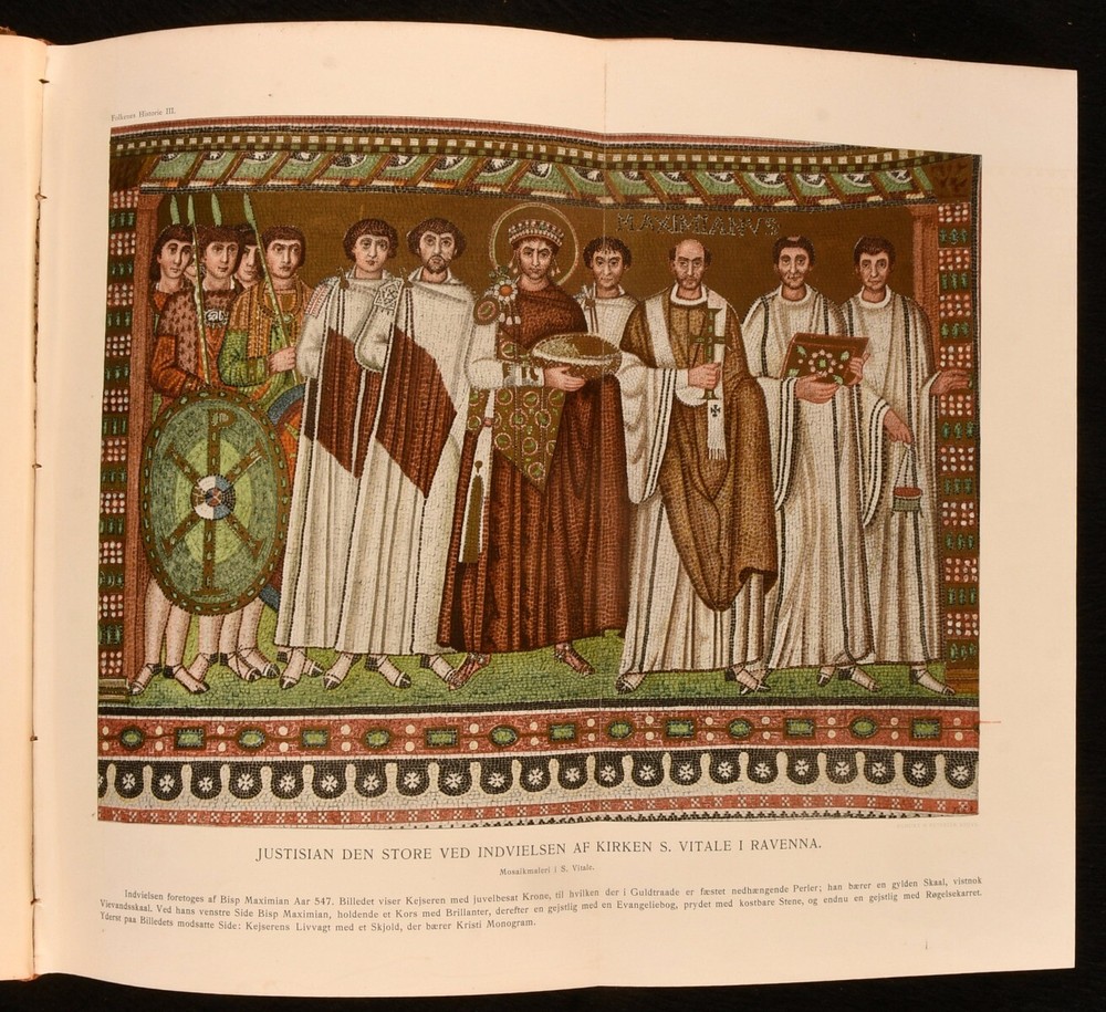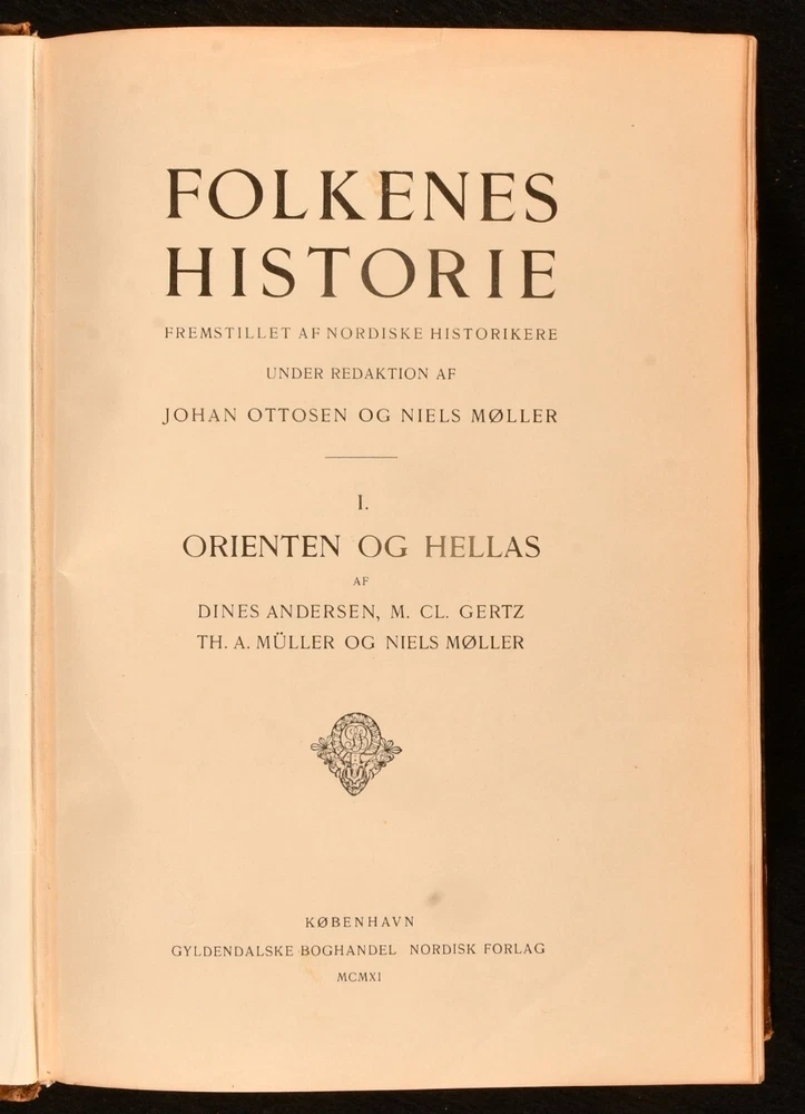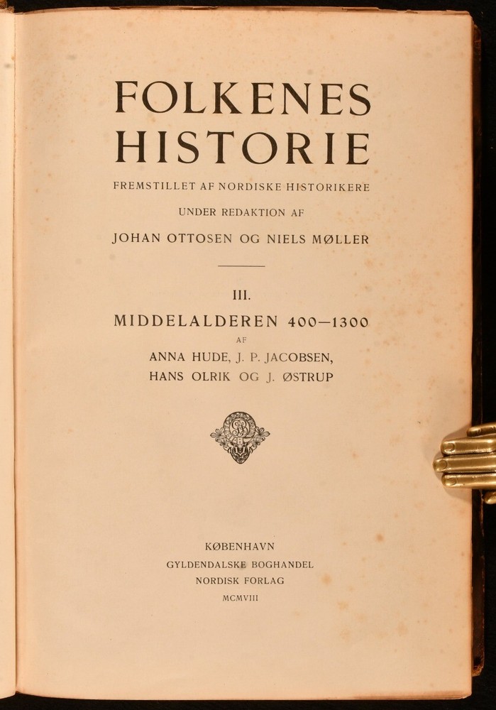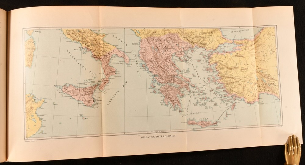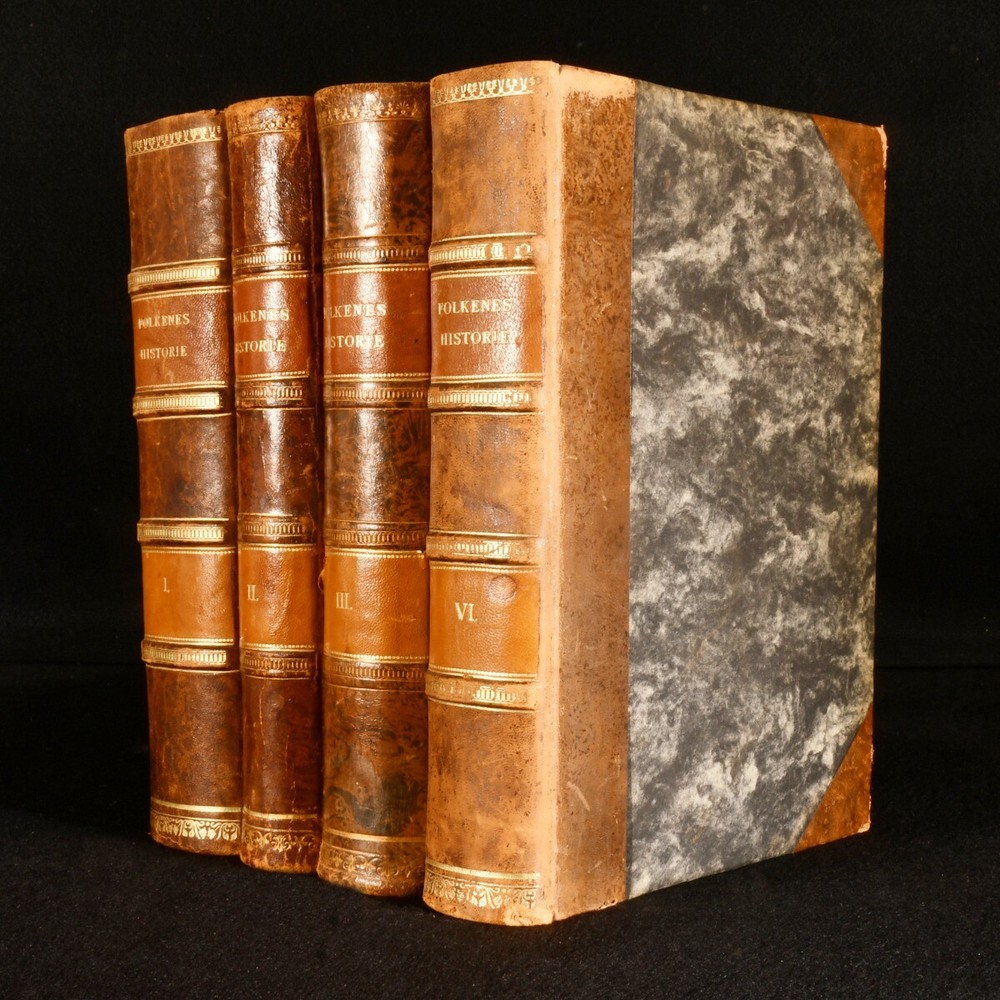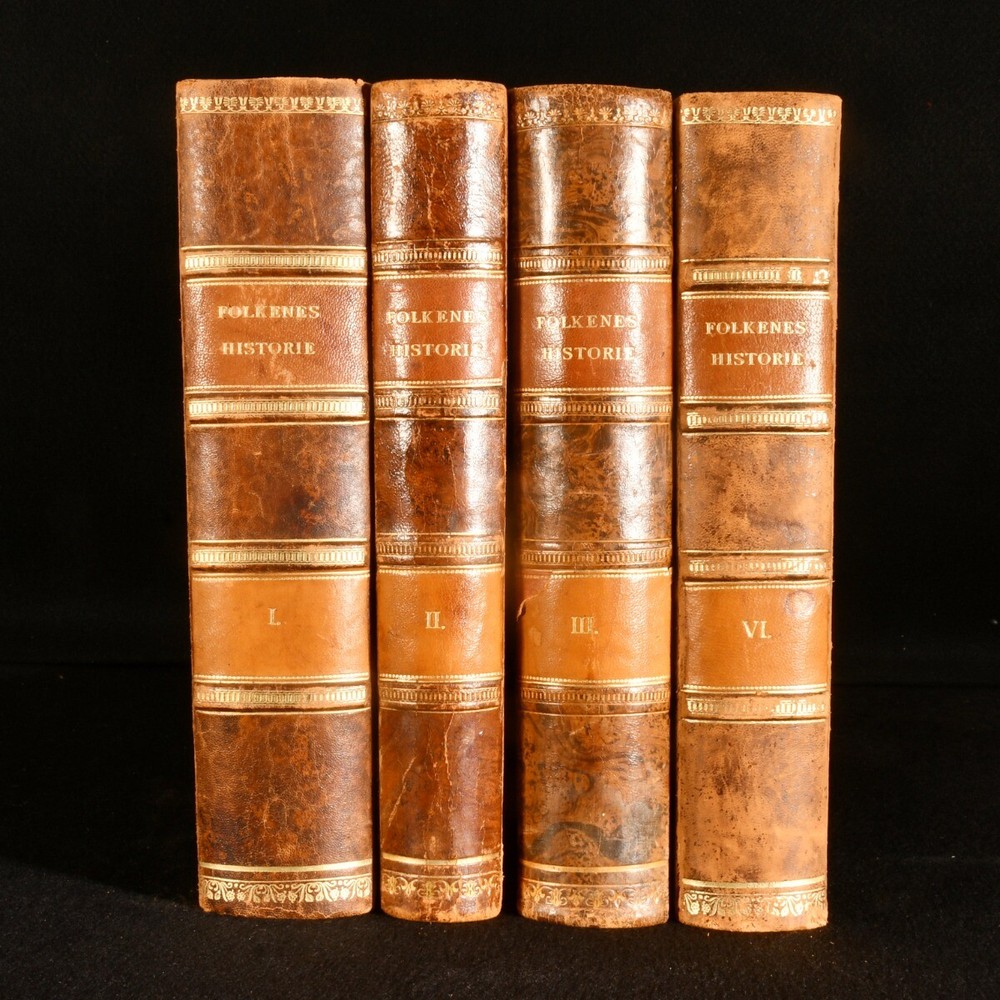 Click here to see our other books! Folkenes Historie: Fremstillet af Nordiske Historikere Johan Ottosen [ed.]; Niels Moller [ed.] 1904-1911 Gyldendalske Boghandel Nordisk Forlag : Kobenhavn [Copenhagen] 11" by 8" 962; 591; 781; 770 pp SUMMARY Four volumes of this very scarce Danish language examination of European history, covering subjects including the Roman Empire, Enlightenment, and Middle Ages. Folding Maps,Illustrated,Leather Binding,Very Scarce Overall Condition: Very Good This book weighs 7 KG when packed UK Postage: £ 4.49 US Postage: £ 52.99 EU Postage : £ 30.99 European Postage: £ 55.99 Asia Postage: £ 89.99 Worldwide Postage: £ 189.99 DESCRIPTION In the original Danish. Four volumes only from this very scarce, seven volume, early twentieth century work on the history of Europe and Denmark. Collected from the work of various Nordic historians, and edited by Johan Ottosen and Niels Moller, present here are volumes I, II, III and VI out of seven, each illustrated throughout with vignette and full plate illustrations. Consisting of volume I, published in 1911, 'Orienen og Hellas', illustrated with two folding maps and a double page plate. Volume II, 1904, examining the Roman Empire, with two folding maps and one folding plate. Volume III, 1908, discussing the Middle Ages from 400-1300, with one folding colour plate, and one folding monochrome plate. Volume VI, 1911, covering the Enlightenment, with two folding facsimile plates, and two folding maps, one of which is in colour. CONDITION In half calf bindings, with paper covered boards. Light rubbing to back strip head and tails, and joints. Externally, smart. Internally, bindings a little loose, but still firmly held. Small tear at the tail of gutter to first few pages of volumes I, II and III. Pages age toned to perimeters, with instances of spotting to each volume, usually concentrated to page perimeters. Overall Condition: Very Good GLOSSARY OF TERMS Overall Condition (Dustwrapper condition rating is shown after that for the book itself, where a dustwrapper is present) Fine - Very well preserved copy showing very little wear Very Good Indeed - Only one or two minor faults, really a very attractive copy Very Good - Quite a wide term meaning no major faults but probably several smaller ones often expected given the age of the book, but still a respectable copy Good - Meaning not very good. Some more serious faults as will be described in the condition report under 'condition' Good Only - Meaning one or more faults that could really do with repair Fair - As with good only above but with other faults leaving a compromised copy even after repair Poor - Really bad and possibly seriously incomplete. We only sell books in this condition where their rarity or value makes them attractive none the less. Major defects will be described. GUARANTEE We offer a full money back guarantee on our descriptions. Please ask for details and conditions. We prefer PAYPAL. If you pay via PAYPAL we will post the item off the same or the next working day with the postage you have selected. Please note we cannot accept USD cheques