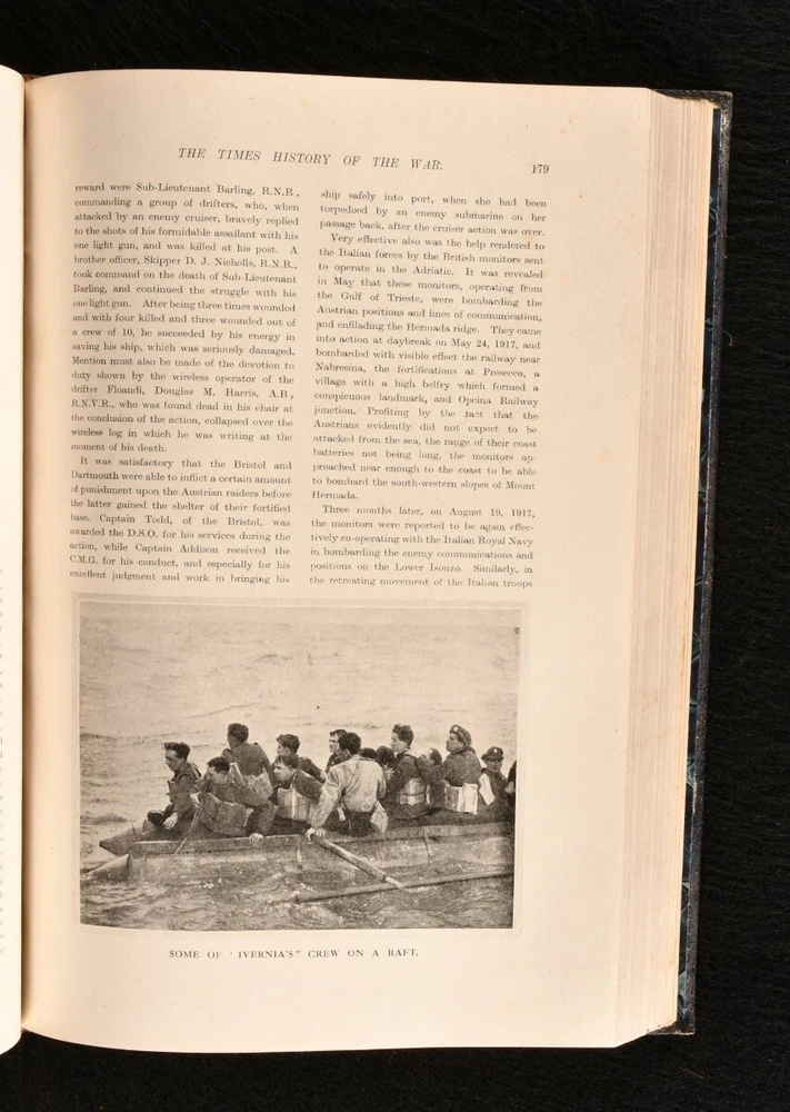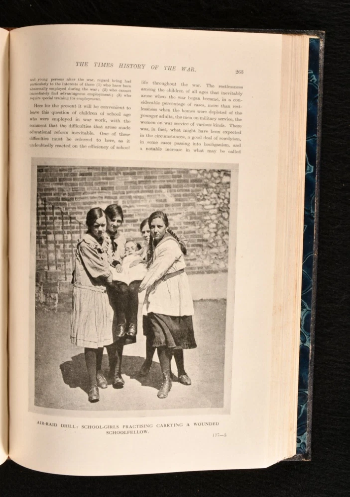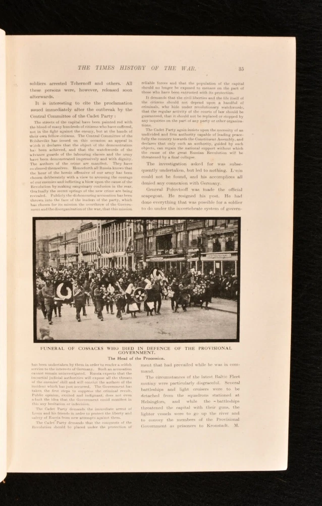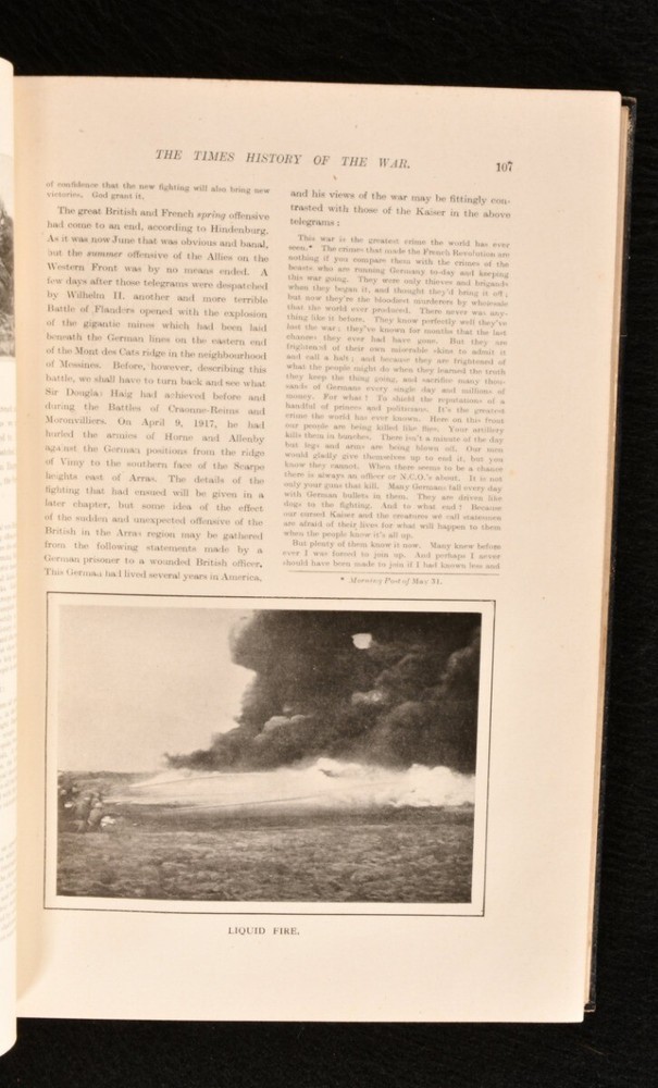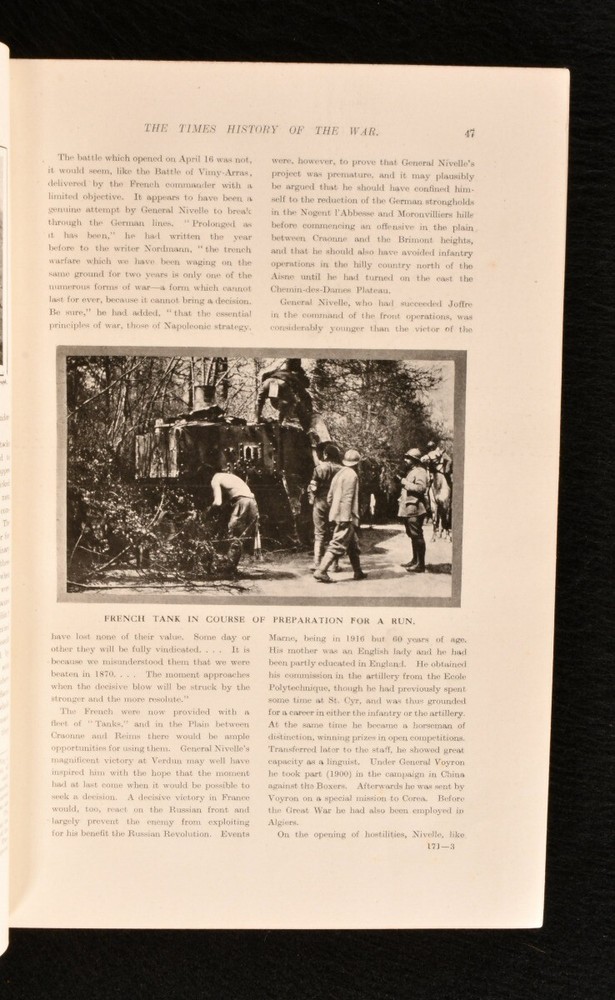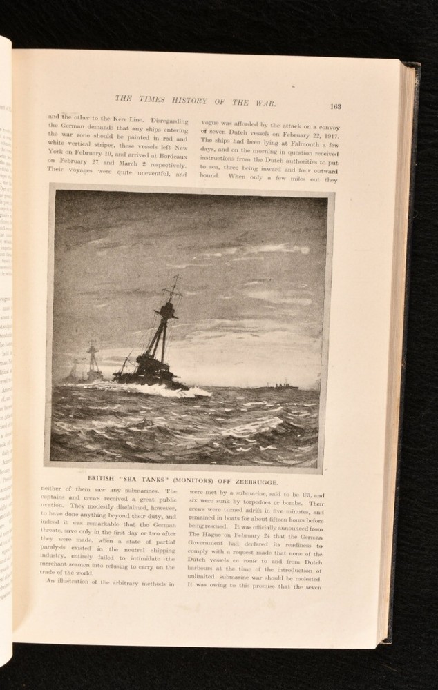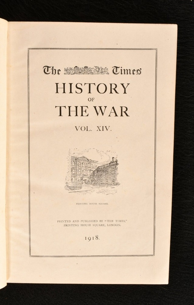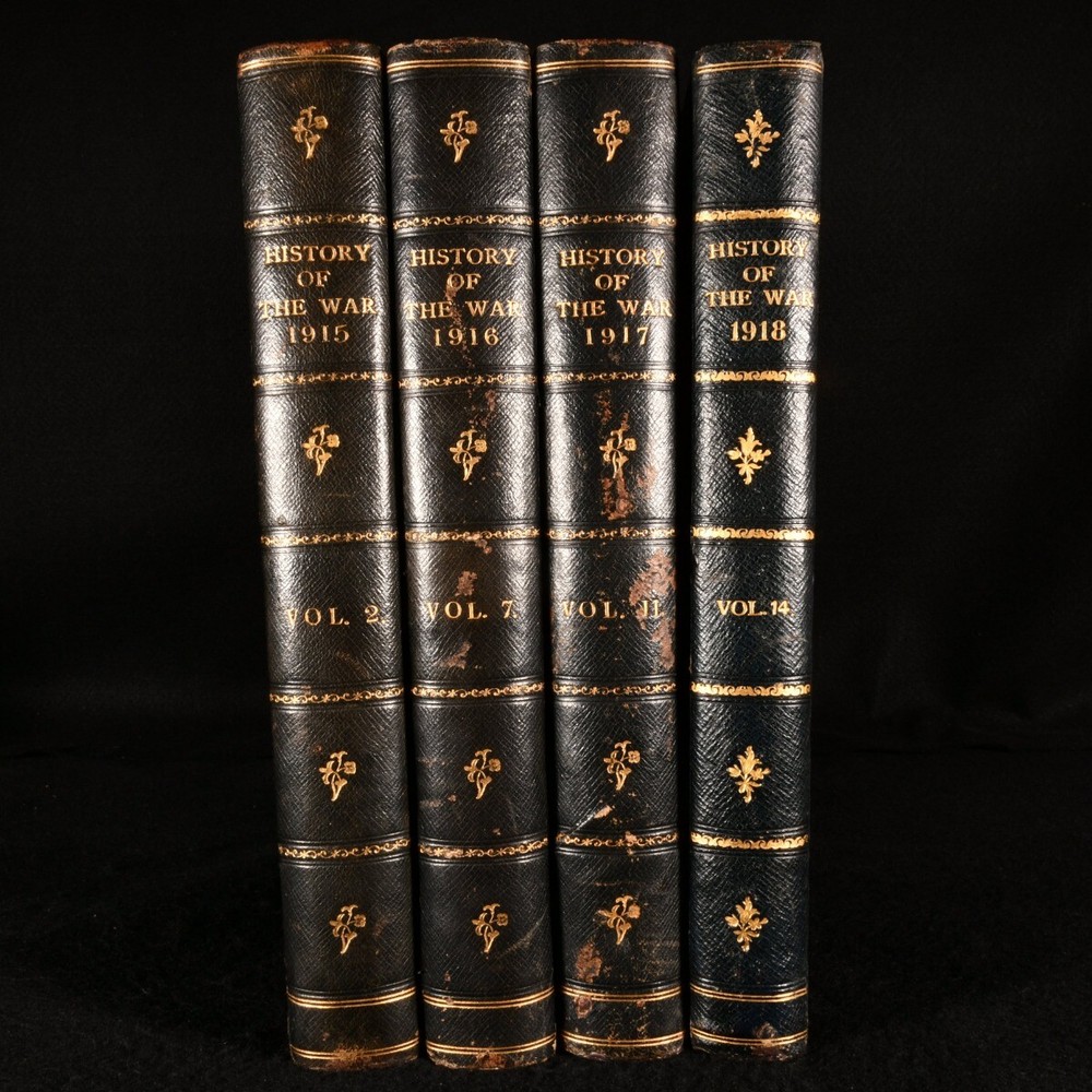 Click here to see our other books! The Times History of the War The Times 1915-1918 The Times : London 12" by 8" [5], 2-516; 504; 512; 472pp SUMMARY A finely bound, set of four volumes from The Times' popular periodical regarding the First World War. Fine Binding,Illustrated Overall Condition: Very Good Indeed This book weighs 4 KG when packed UK Postage: £ 4.49 US Postage: £ 39.99 EU Postage : £ 26.99 European Postage: £ 36.99 Asia Postage: £ 65.99 Worldwide Postage: £ 99.99 DESCRIPTION With a folding map frontispiece to volume II. With black and white in-text illustrations throughout. Comprising volumes II, VII, XI and XIV issued from 1915 to 1918. Battles discussed include the Battle of Jadar, The Fall of Antwerp and the The Aisne Battles. CONDITION In uniform full morocco bindings. Externally, very smart. Repair to the rear board of volume XIV. Light rubbing . Rear joint to volume II strained but firm. Patches of rubbing to the front board of volume VII. Overall Condition: Very Good Indeed GLOSSARY OF TERMS Overall Condition (Dustwrapper condition rating is shown after that for the book itself, where a dustwrapper is present) Fine - Very well preserved copy showing very little wear Very Good Indeed - Only one or two minor faults, really a very attractive copy Very Good - Quite a wide term meaning no major faults but probably several smaller ones often expected given the age of the book, but still a respectable copy Good - Meaning not very good. Some more serious faults as will be described in the condition report under 'condition' Good Only - Meaning one or more faults that could really do with repair Fair - As with good only above but with other faults leaving a compromised copy even after repair Poor - Really bad and possibly seriously incomplete. We only sell books in this condition where their rarity or value makes them attractive none the less. Major defects will be described. GUARANTEE We offer a full money back guarantee on our descriptions. Please ask for details and conditions. We prefer PAYPAL. If you pay via PAYPAL we will post the item off the same or the next working day with the postage you have selected. Please note we cannot accept USD cheques