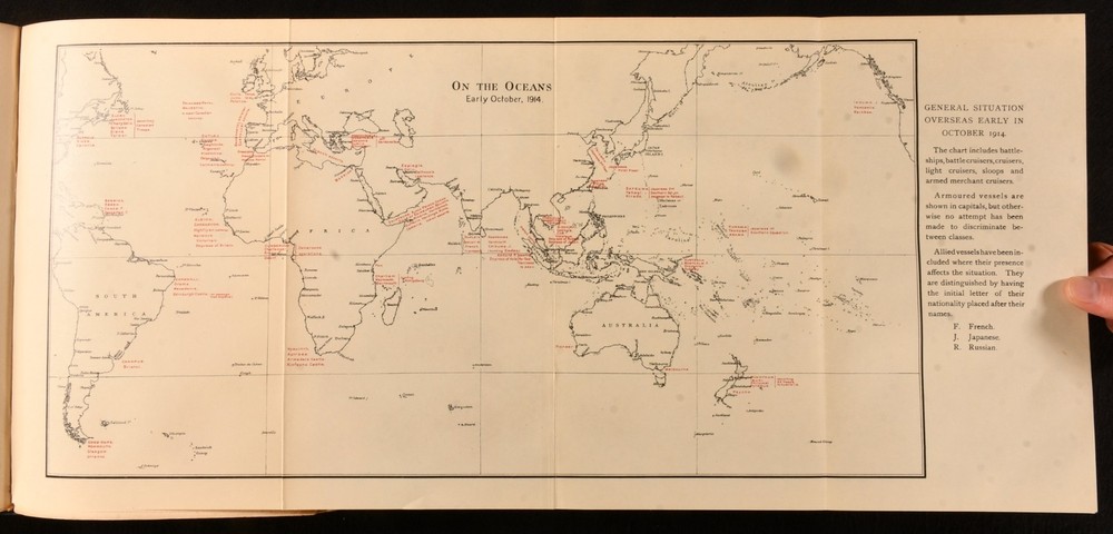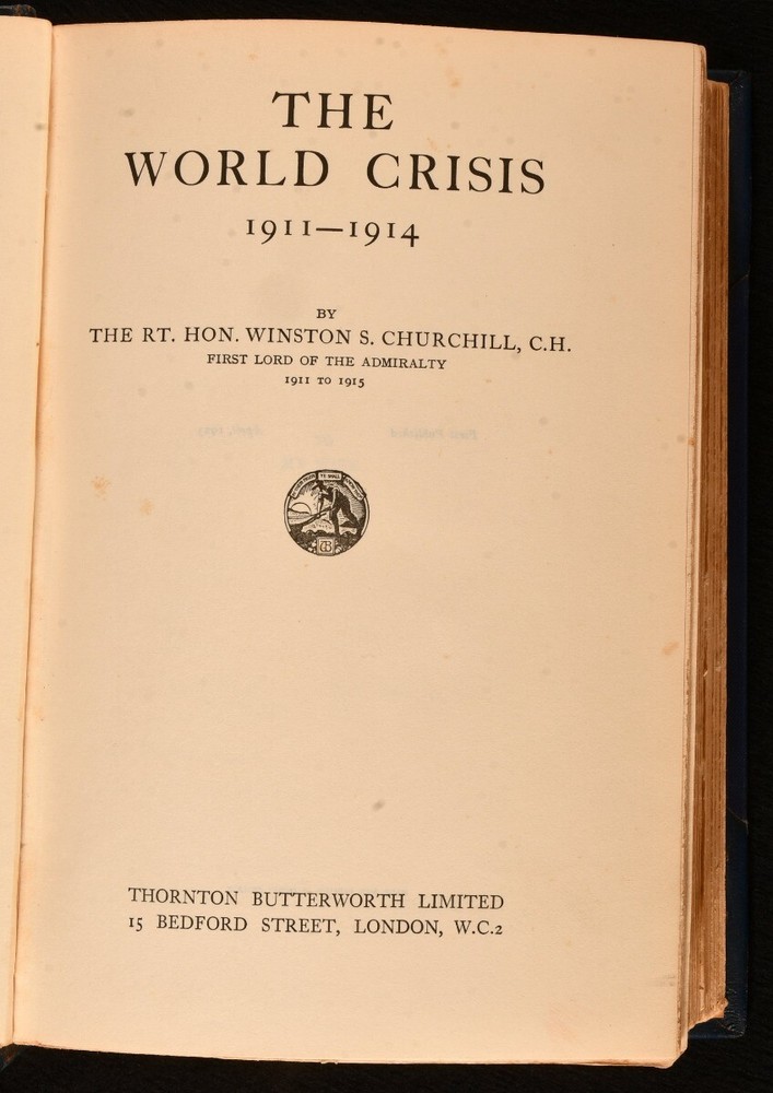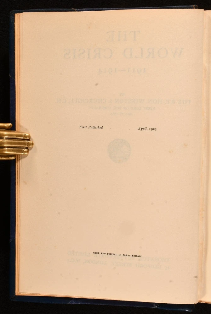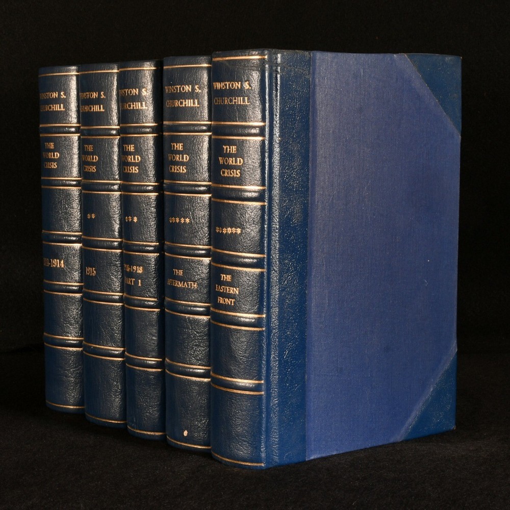Click here to see our other books! The World Crisis Winston Churchill 1923-31 Thornton Butterworth Limited : London 9.5" by 6.5" [6], 536; [6], 9-557; [6], 9-291, [1]; [6], 9-474; 368pp SUMMARY A first impression set of Winston Churchill's influential account of the First World War, illustrated with many folding maps. First Edition,Folding Maps,Illustrated,Leather Binding Overall Condition: Very Good Indeed This book weighs 5 KG when packed UK Postage: £ 4.49 US Postage: £ 42.99 EU Postage : £ 27.99 European Postage: £ 45.99 Asia Postage: £ 74.99 Worldwide Postage: £ 129.99 DESCRIPTION The first editions, first impressions. In five volumes, containing Volumes I, II, III, V, and VI, of a total of six volumes, lacking volume IV published later. Churchill's detailed first-hand work discussing the First World War, and the events that led up to the War from 1911. This is an important and much acclaimed first-hand account of the war, written by Churchill before his fame as the wartime Prime Minister. In this work, Churchill defends his Gallipoli policy, and criticises Haig's strategy. Rebound in a navy half rexine binding. Volume I illustrated with five folding maps, one map, and two plates. Volume II illustrated with five folding maps, two map, and two plates. Volume III illustrated with four folding maps, two folding tables, six maps and charts, and in-text illustrations. Volume V illustrated with four folding maps, and in-text illustrations. Volume VI illustrated with a frontispiece, ten folding maps, seven plates, and in-text illustrations. Collated, complete. CONDITION Rebound in a half rexine binding with cloth to the boards, with renewed endpapers. Externally smart. Very light rubbing to the extremities. A few light marks to the boards and spines, including to the tail of the spine of Volume V. A small amount of loss of leather to the head of the spine and front joint of Volume VI. Internally, firmly bound. Pages are bright and clean, with a few occasional scattered spots to the first and last few pages. Overall Condition: Very Good Indeed GLOSSARY OF TERMS Overall Condition (Dustwrapper condition rating is shown after that for the book itself, where a dustwrapper is present) Fine - Very well preserved copy showing very little wear Very Good Indeed - Only one or two minor faults, really a very attractive copy Very Good - Quite a wide term meaning no major faults but probably several smaller ones often expected given the age of the book, but still a respectable copy Good - Meaning not very good. Some more serious faults as will be described in the condition report under 'condition' Good Only - Meaning one or more faults that could really do with repair Fair - As with good only above but with other faults leaving a compromised copy even after repair Poor - Really bad and possibly seriously incomplete. We only sell books in this condition where their rarity or value makes them attractive none the less. Major defects will be described. GUARANTEE We offer a full money back guarantee on our descriptions. Please ask for details and conditions. We prefer PAYPAL. If you pay via PAYPAL we will post the item off the same or the next working day with the postage you have selected. Please note we cannot accept USD cheques