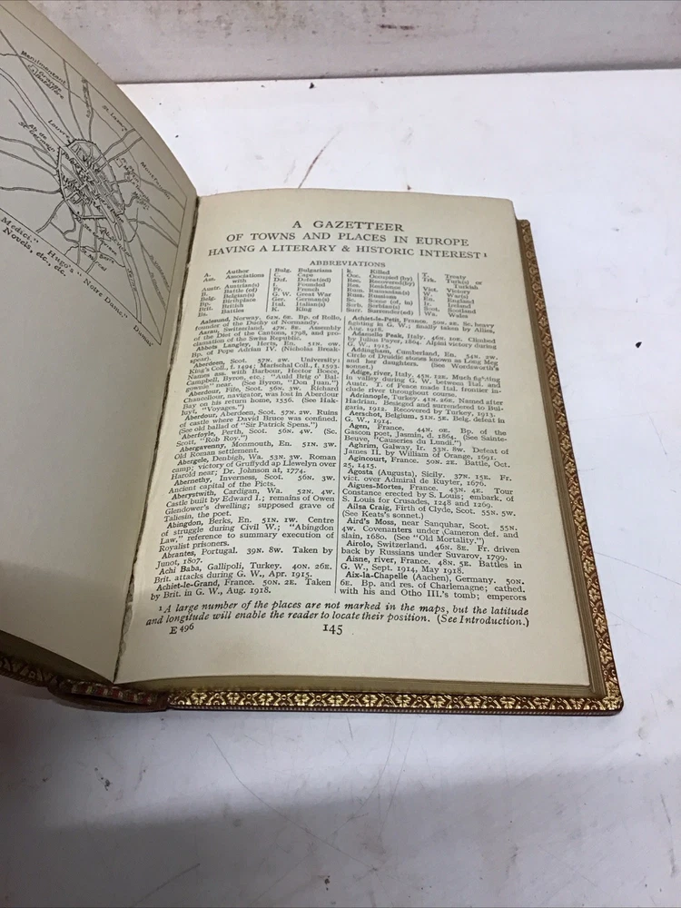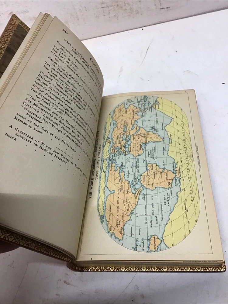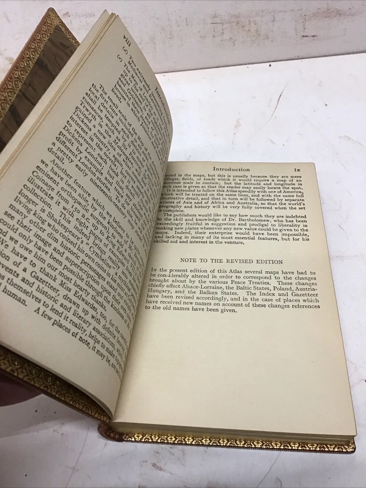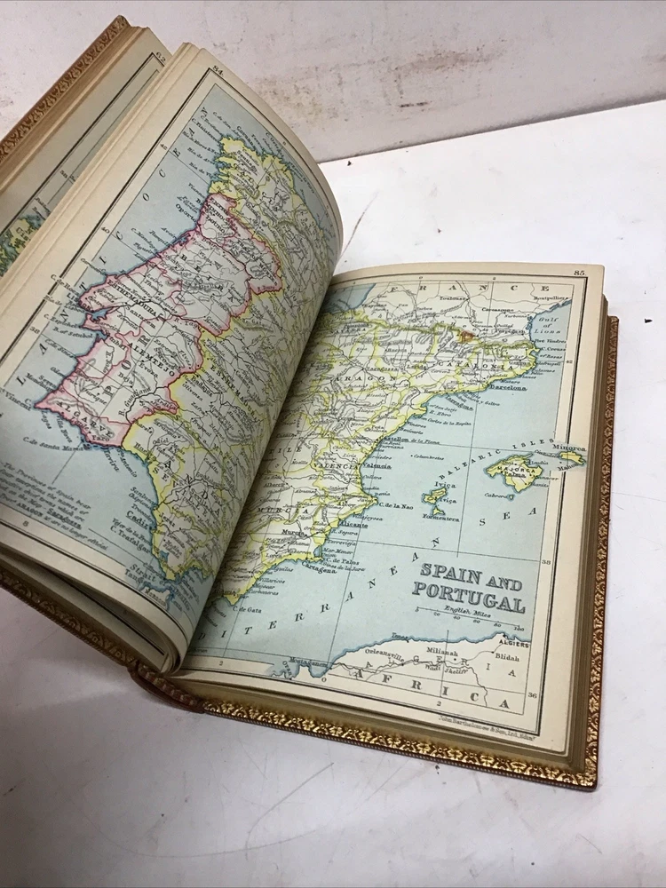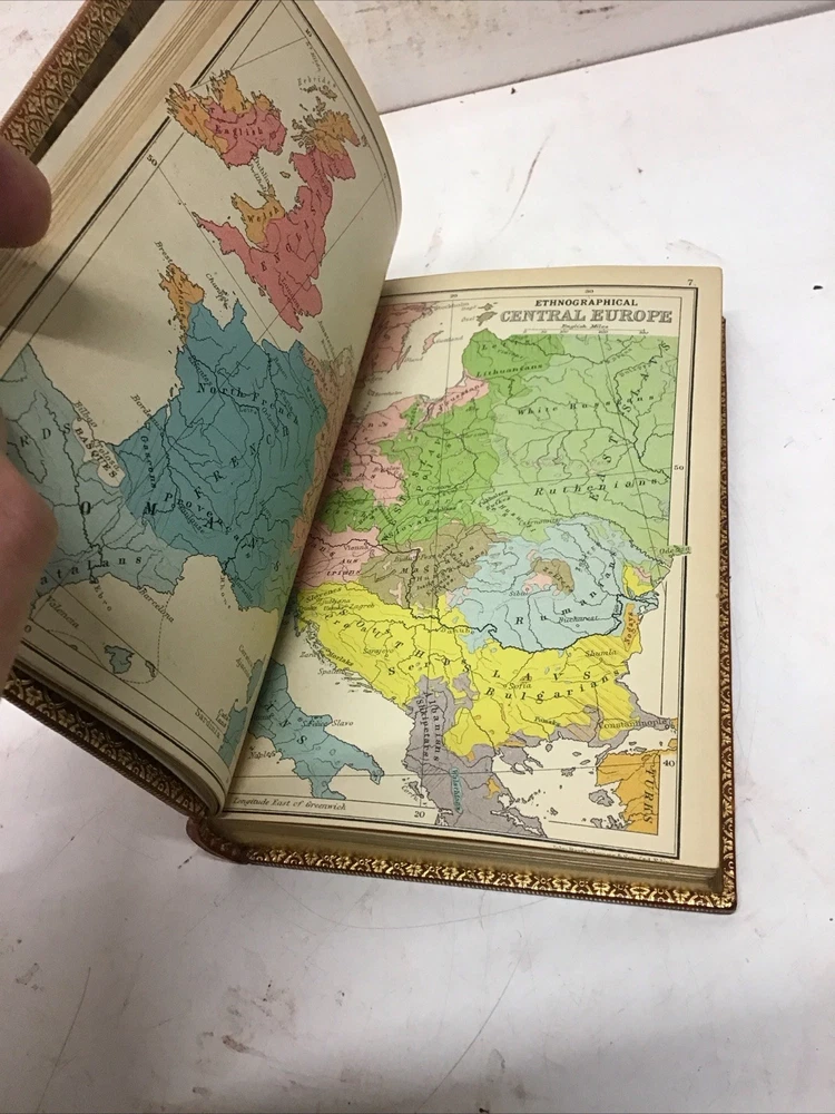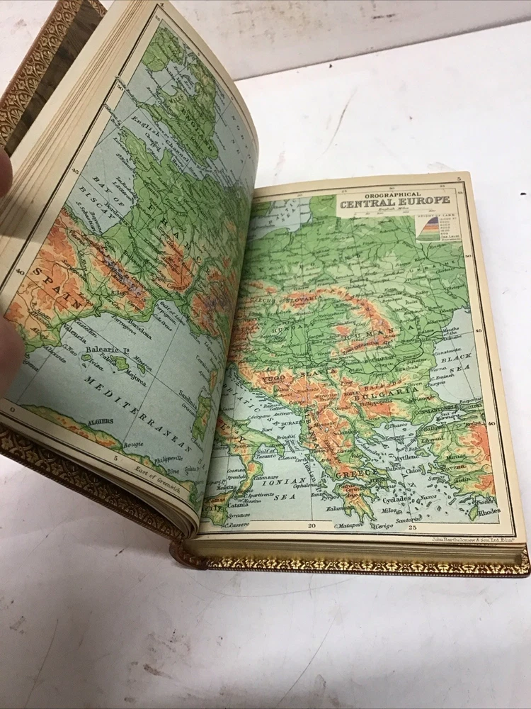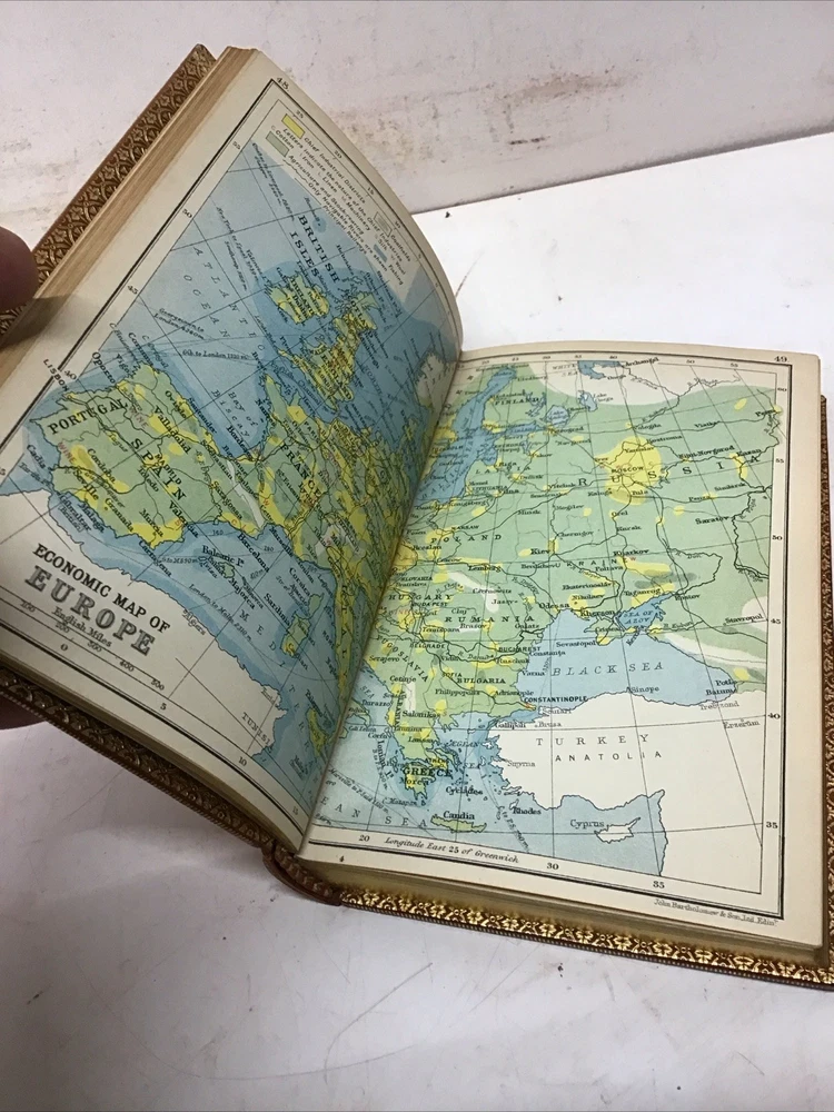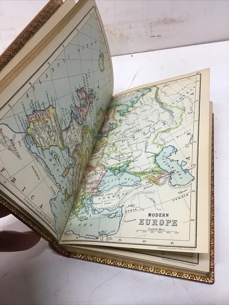 The 1925 Leather Atlas of Europe published in London by Robert Rivière & Son is a rare and valuable collectible book that provides a comprehensive reference guide to the region of Europe. The beautifully crafted leather binding adds to its aesthetic appeal, while the detailed illustrations and maps enhance its functionality as an informative tool for exploration and reference. This antique atlas, printed in English and published by Robert Rivière & Son in the United Kingdom, is a unique piece of history that showcases the craftsmanship and knowledge of the time period. Thanks to Ebayer who provided additional information. Just a little more provenance on this set, if I may. Robert Rivière was a prominent bookbinder in London for wealthy clientele, including the Royal Family. It appears like he rebound/re-published the Everyman's Library series of 1915 for a private client. You probably won't find another edition bound in this format outside of this private series 1925 The Reference Library- Atlas of Europe published in London by Robert Rivière & Son Size 4.5” x 6.5/8” 254 pages Has no copyright date in book and is a rarer book as at time of listing I found not locate this book. Has some wear being 100 years old as seen in pictures. Has Marbleized endpapers and retains gold borders. Nice clean copy with no writing in book. See table of contents for maps which is pictured. See our other beautiful books Keep in mind the shipping price also covers handling fees, packaging materials & time, not just postage. See our eBay store for thousands of our other items. B16