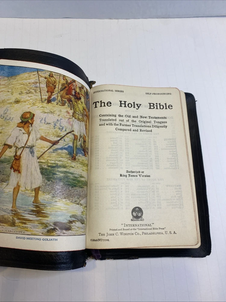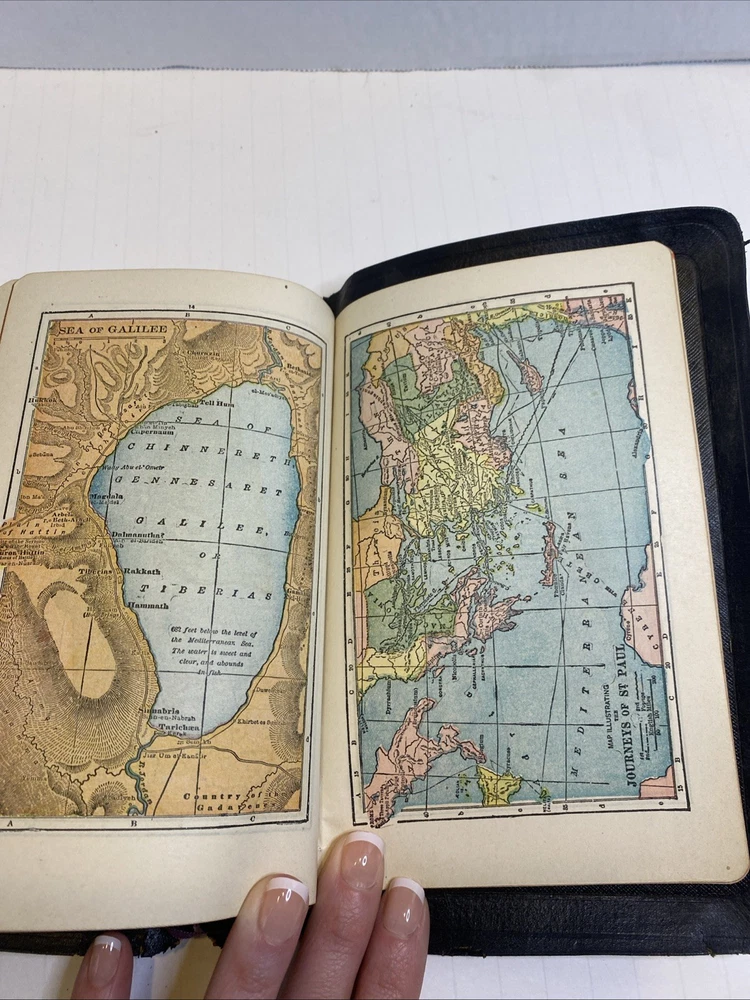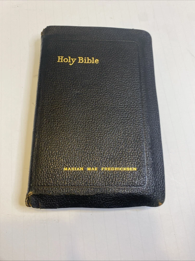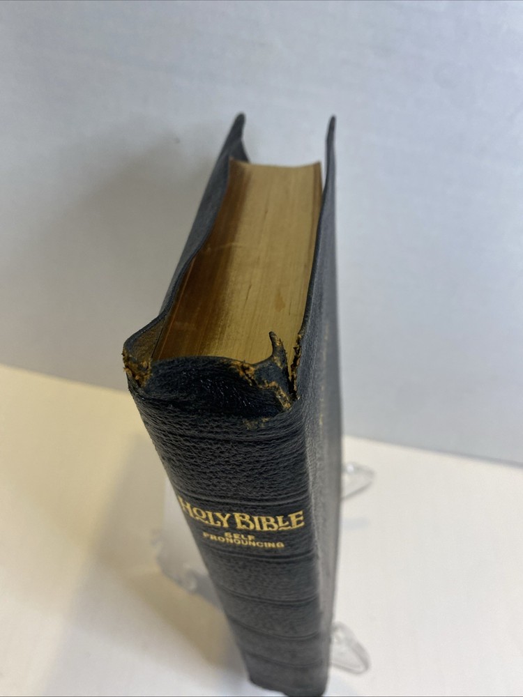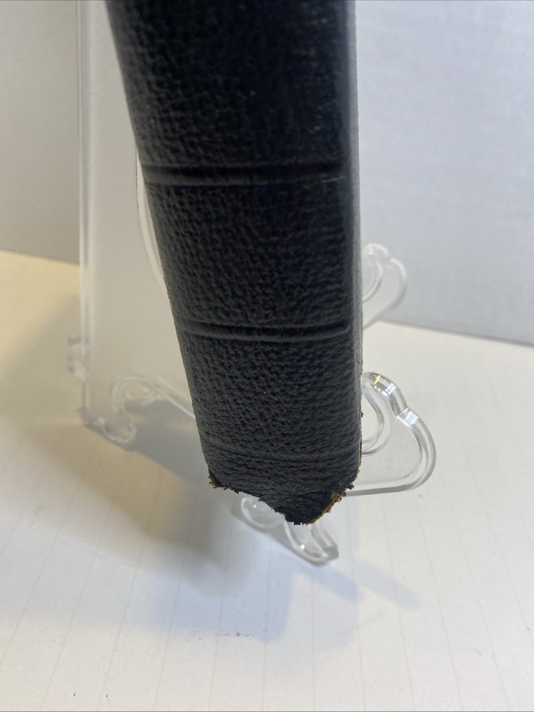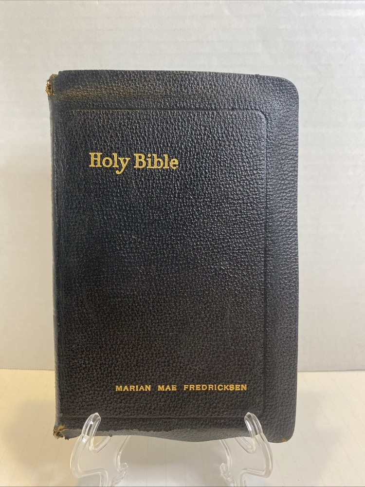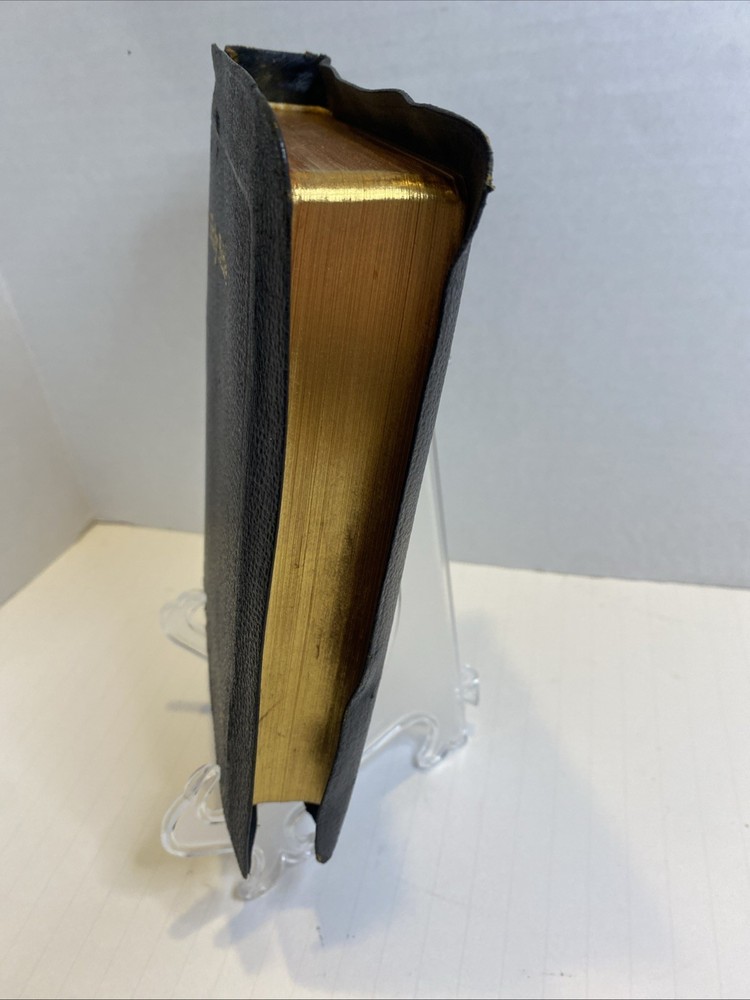 This beautiful 1938 edition of the Holy Bible is a King James Version, printed and bound by The John C. Winston Co., Philadelphia. Featuring both Old and New Testaments, this self-pronouncing “International Series” Bible is filled with historical charm and reverence. The black leatherette cover has gold-embossed lettering with the name Marian Mae Fredricksen and shows wear at the corners and edges, especially at the spine. Inside, you’ll find clean pages with vibrant color maps at the back, and shimmering gold gilt edges on all sides. Whether you’re a collector of vintage religious texts or searching for a meaningful display piece, this Bible is a soulful and timeless artifact. Details: • Published in 1938 • Authorized King James Version • Self-pronouncing edition • Measures approx. 8 x 5.5 inches • Black leatherette cover with gold embossing • Gold gilded page edges • Features full-color maps • Bound by The John C. Winston Co., Philadelphia • Name personalization on cover • Some exterior wear (see photos) Shipping & Notes: Ships via USPS, FedEx, or UPS—whichever is most affordable for your location. Please see all photos to assess condition before purchasing. Feel free to message with questions—I’m always happy to help!