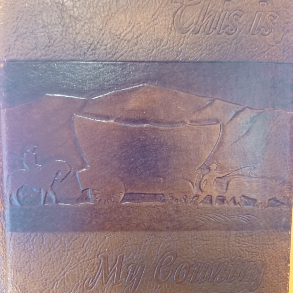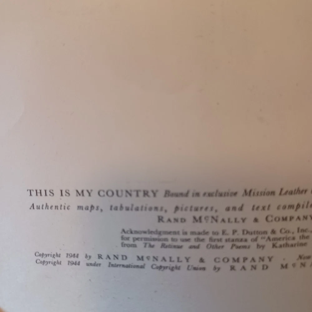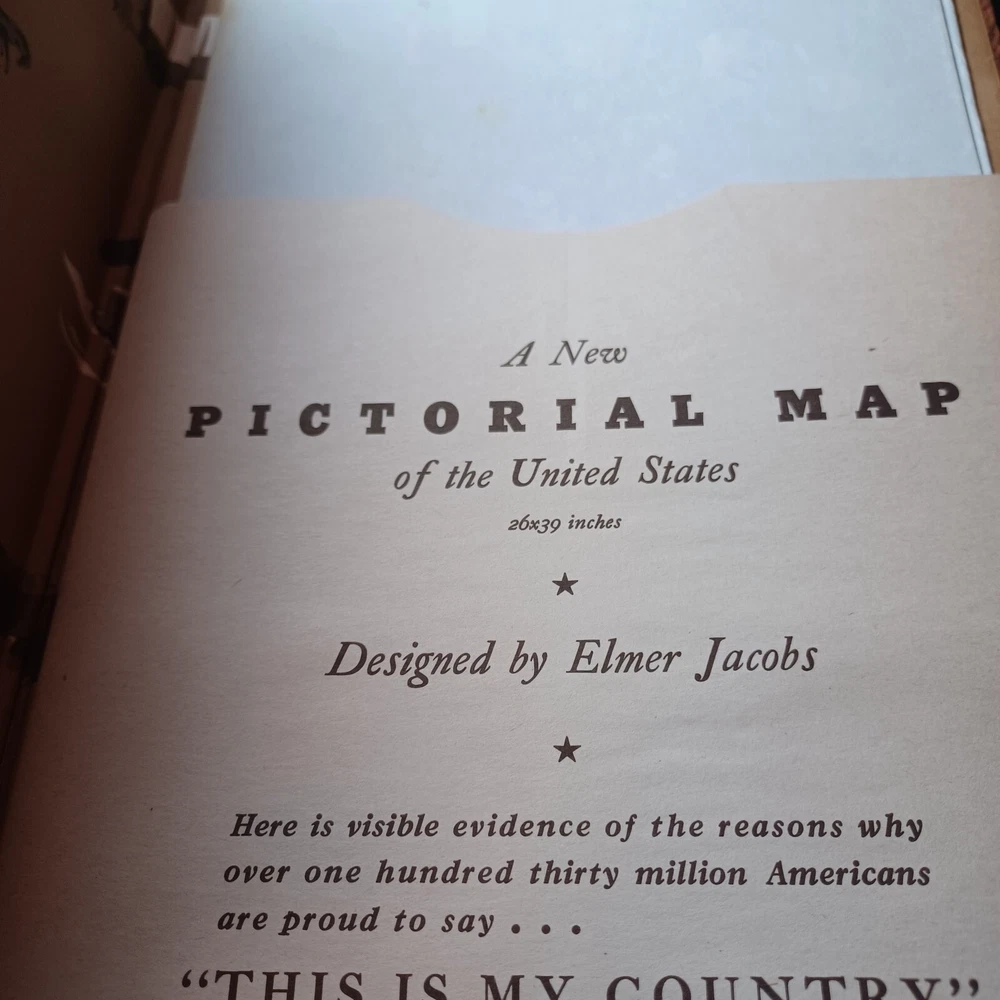 1944 Rand Mcnally, This Is My Country Photographic Illustrations, information, map Each state (no Hawaii not state yet) addl maps, railroad with original pictorial map in pocket back cover (26 x 39) by Elmer Jacobs good 1944--brown leather, includes original map, wear, bumps, edge issues to spine, edges leather