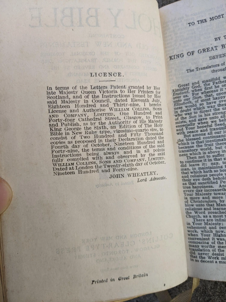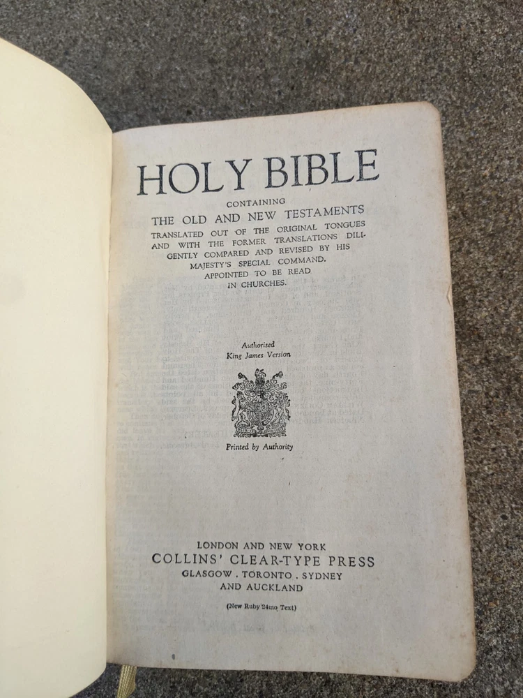 Vintage Book Hallmarks: Collins Condition: The bible has a stain on the outside cover. It is in otherwise good condition....