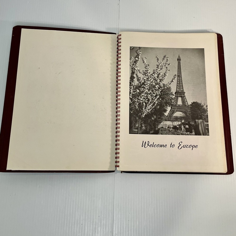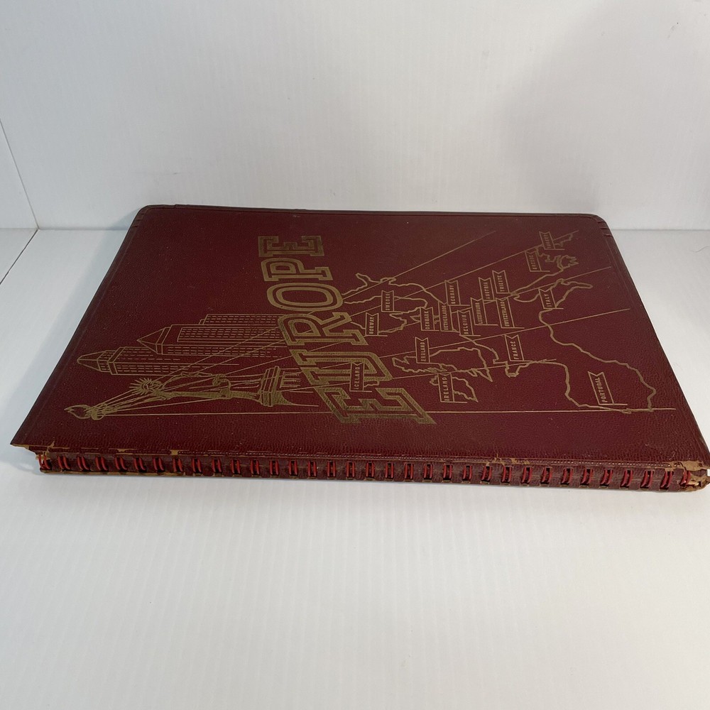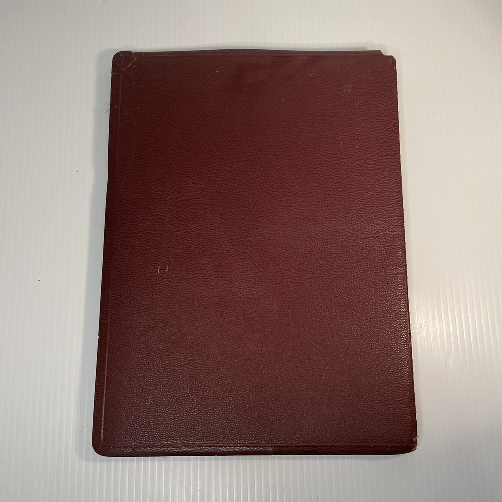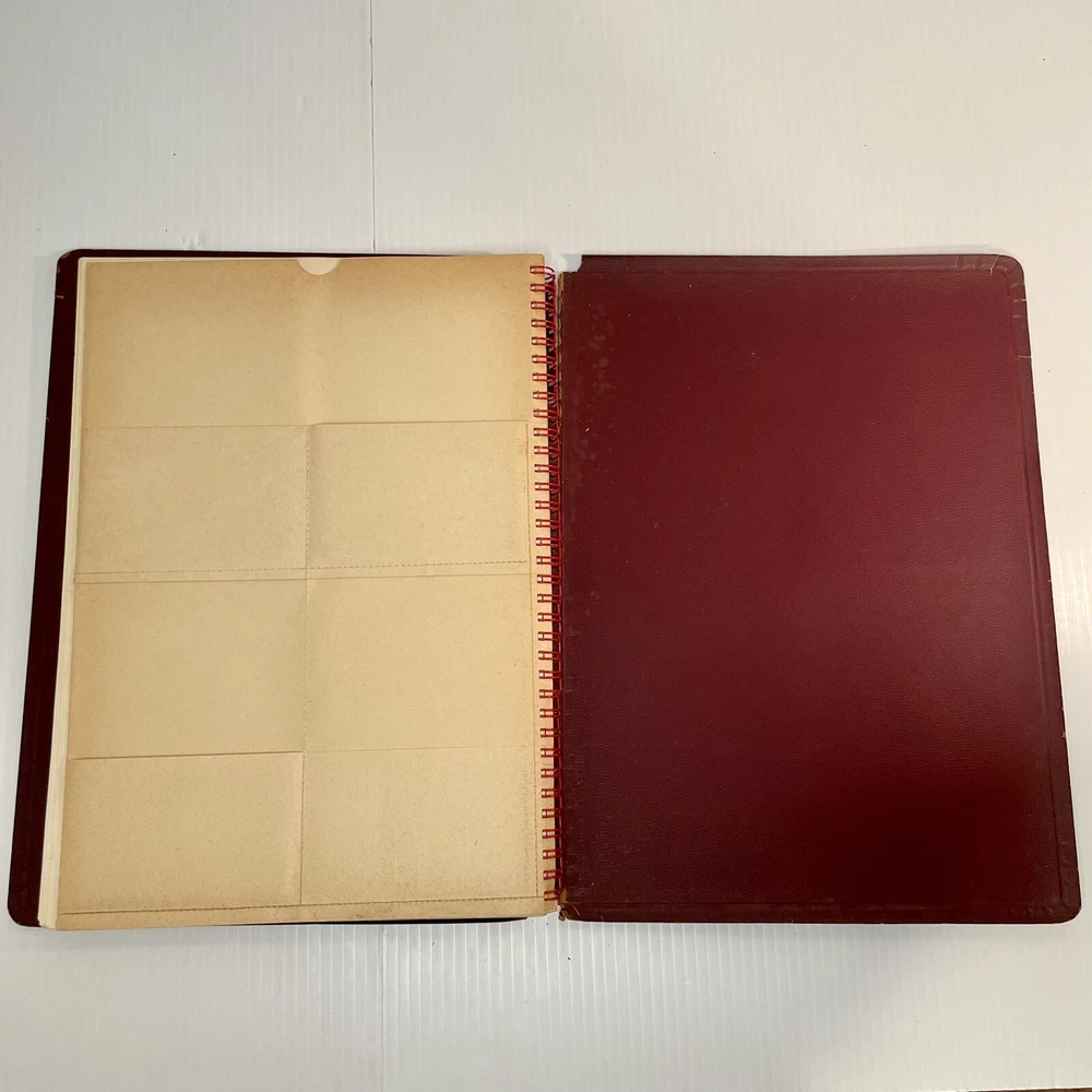 Very good condition overall with minimal yellowing to pages, no writing, spiral binding functioning well. The leather has cracked a bit along the spiral, and has a little spotting on the inside covers. Rare item. 222 pages. Measures 12” x 8 1/2” x 1/2”.
