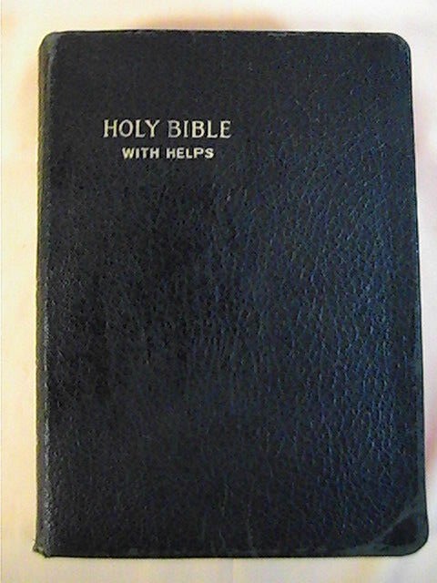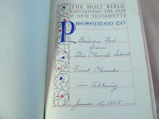 The bible is in fair vintage condition. Intact binding, nice clean pages with no highlights or writing. Subscription on presentation page. Black leather cover has age-related wear to the edges. Bible measures 7.5" x 5.25".