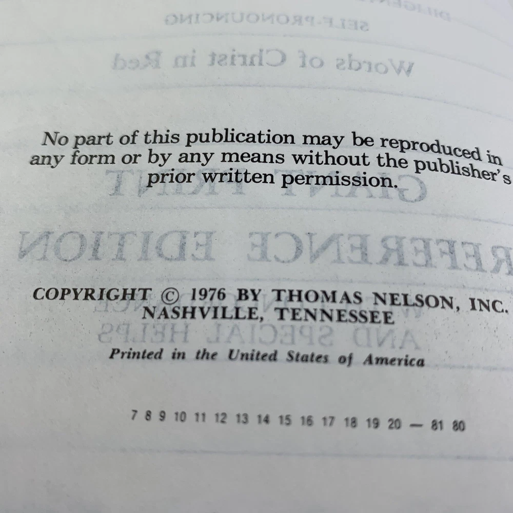 1976 OLD TIME GOSPEL HOUR KJV Giant Print Bible Faith Partners Edition Falwell Red Letter Very clean, unmarked (no underlining or highlighting and front inscription pages unused). Binding in good, strong condition. Please see pictures.