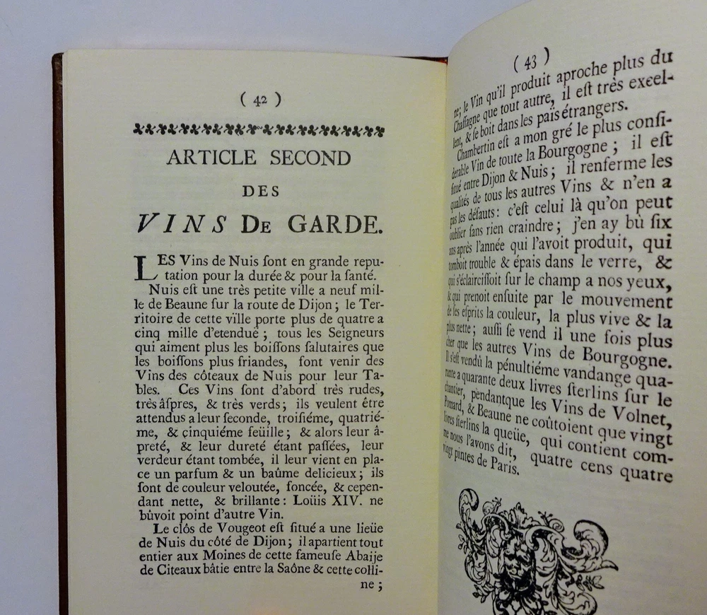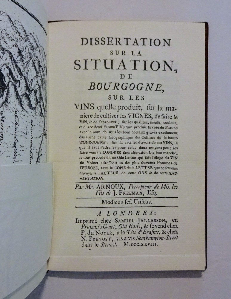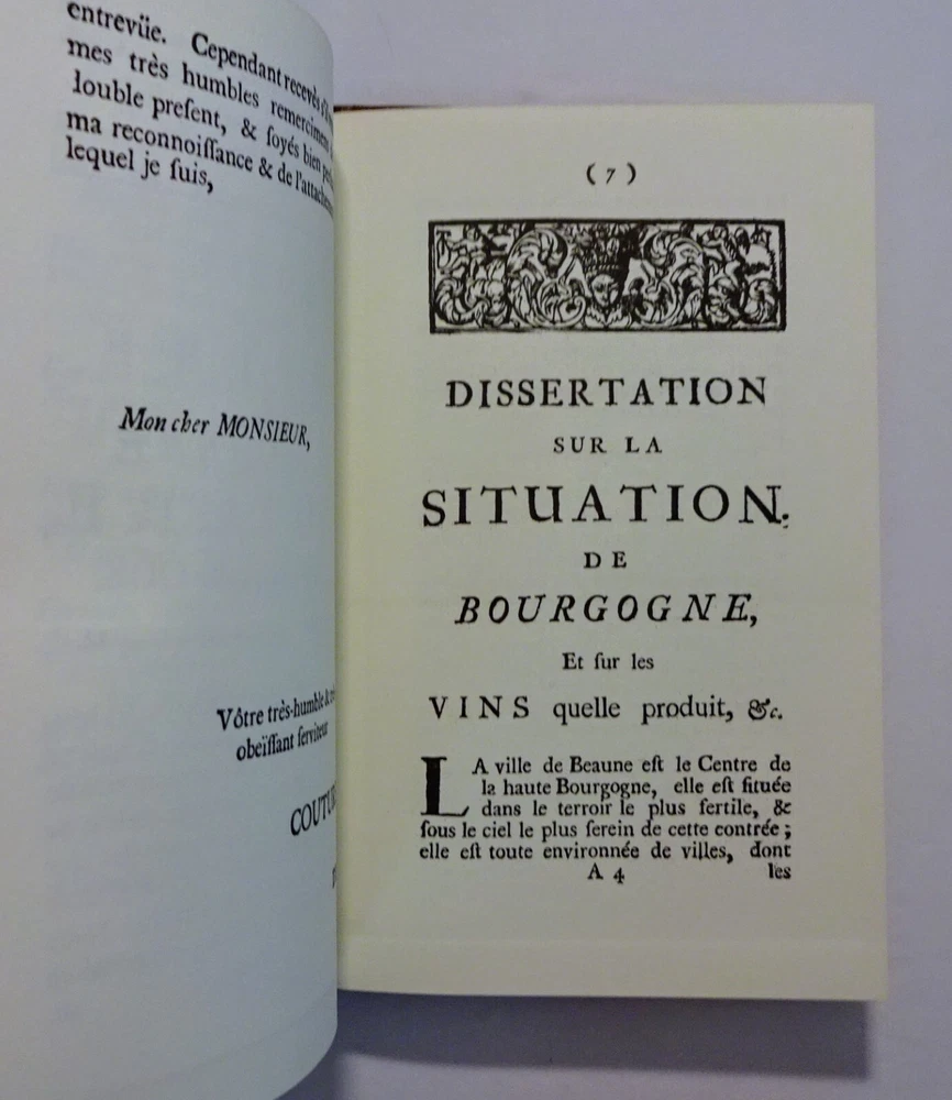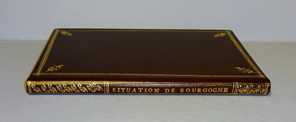 This is a handsome, facsimile copy of the wine book "Dissertation Sur la Situation de Bourgogne" ("Dissertation on the Situation of Burgundy") by Mr. (Claude) Arnoux. This copy is a facsimile of the original 1728 1st edition. Limited edition - No. 89 of only 150 copies printed. 1978; Daniel Morcrette; Limoges, France. The book is written entirely in French. Beautifully bound in full leather with gilt decorations and lettering on the covers and spine, as well as gilt accents along the edges of the covers. Marbled end papers. Gilt top page edges. Ribbon page marker. There is a fold-out map of the Burgundy vineyards at the front. The book discusses Burgundy and its wines, its climates, the way of managing the vines, vinifying the grapes, testing and marketing wines, and offers a plea for the export of bottled wine to be authorized.