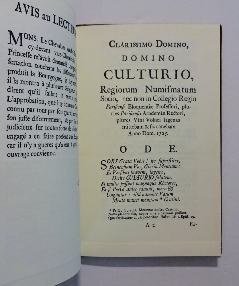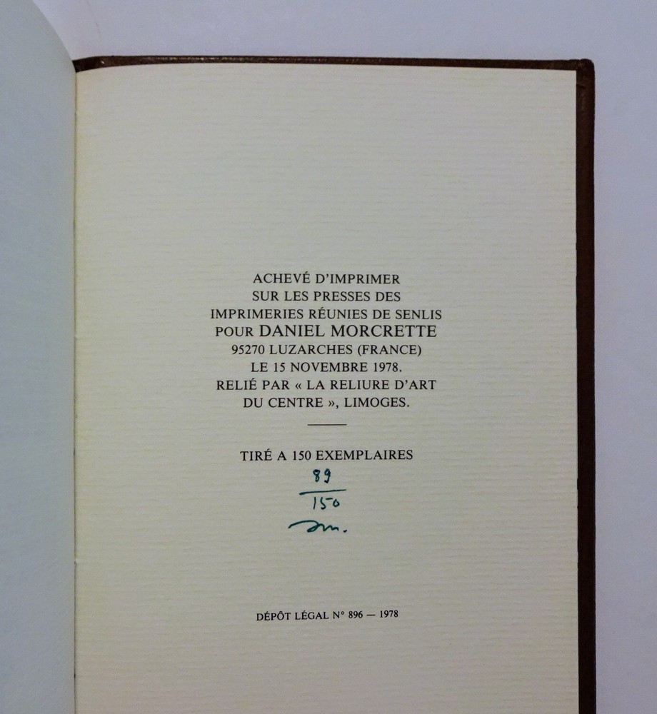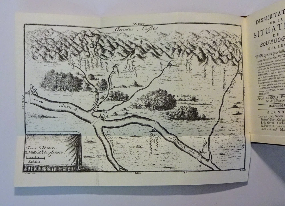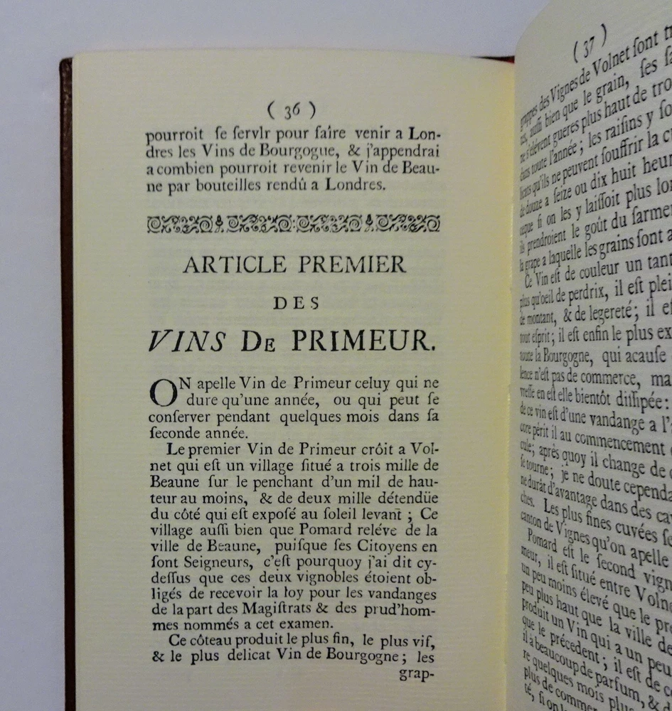 This is a handsome, facsimile copy of the wine book "Dissertation Sur la Situation de Bourgogne" ("Dissertation on the Situation of Burgundy") by Mr. (Claude) Arnoux. This copy is a facsimile of the original 1728 1st edition. Limited edition - No. 89 of only 150 copies printed. 1978; Daniel Morcrette; Limoges, France. The book is written entirely in French. Beautifully bound in full leather with gilt decorations and lettering on the covers and spine, as well as gilt accents along the edges of the covers. Marbled end papers. Gilt top page edges. Ribbon page marker. There is a fold-out map of the Burgundy vineyards at the front. The book discusses Burgundy and its wines, its climates, the way of managing the vines, vinifying the grapes, testing and marketing wines, and offers a plea for the export of bottled wine to be authorized.