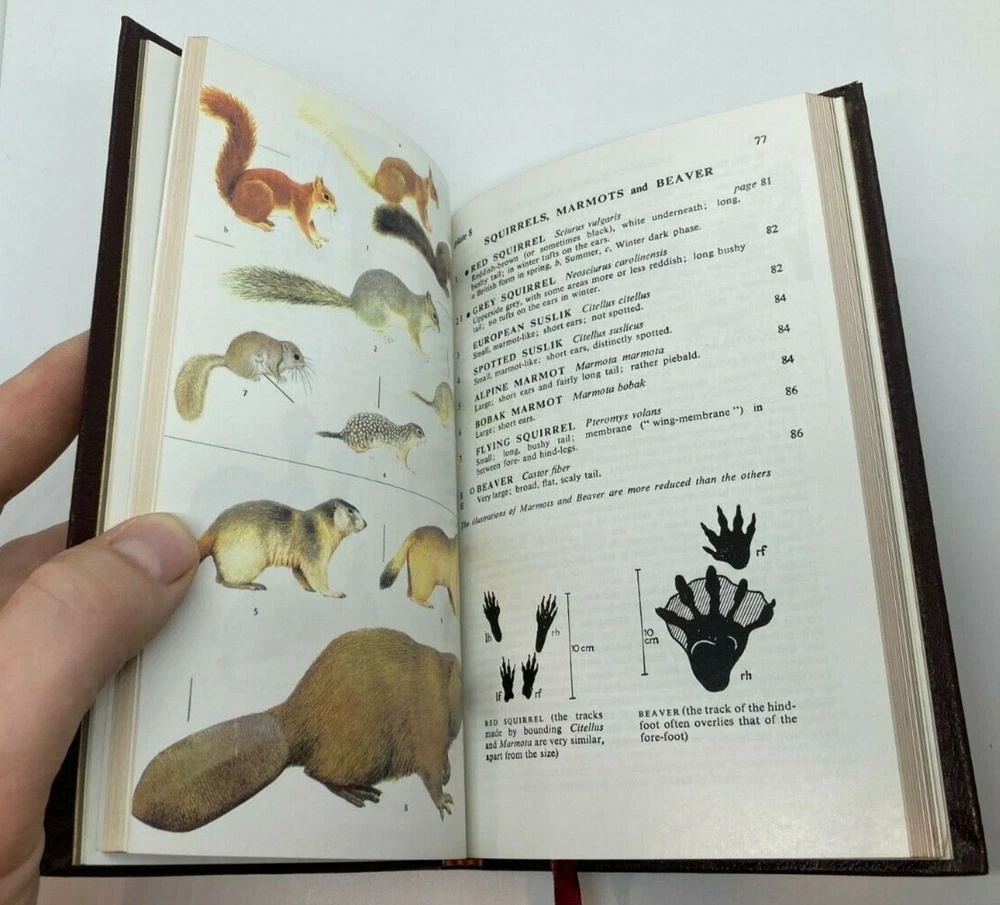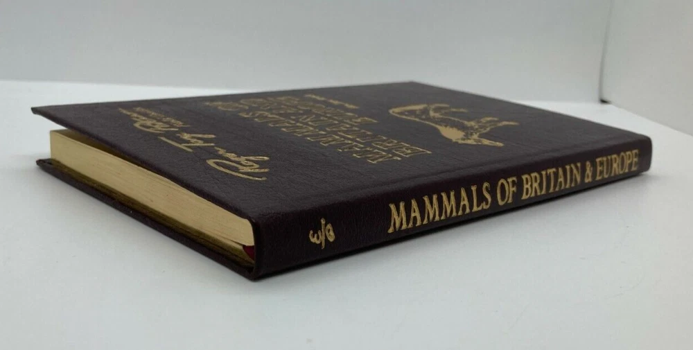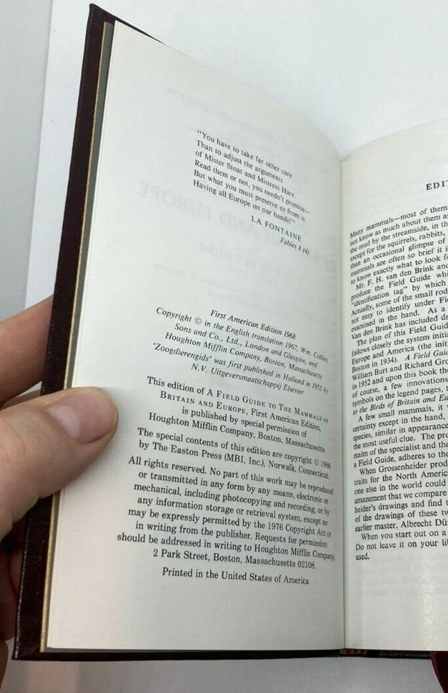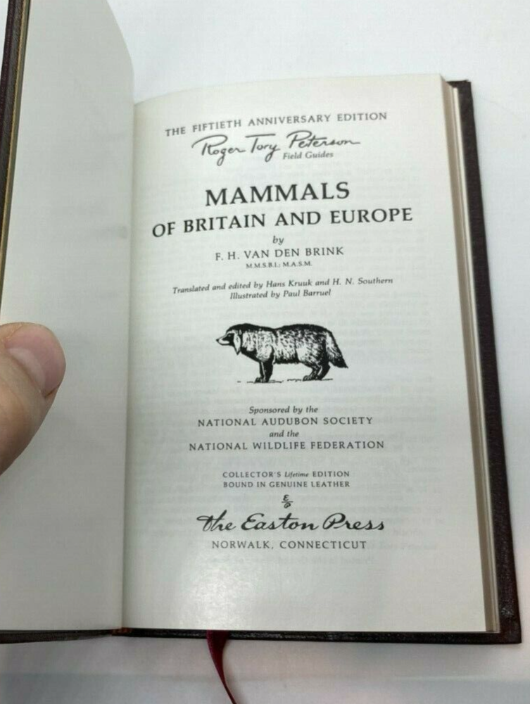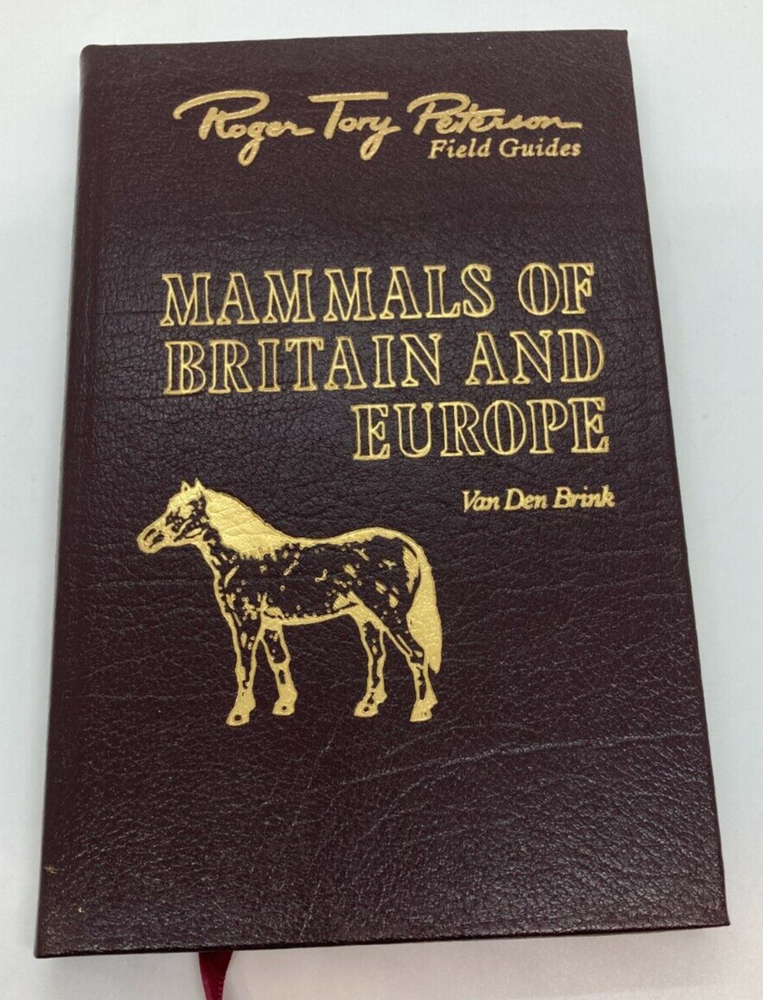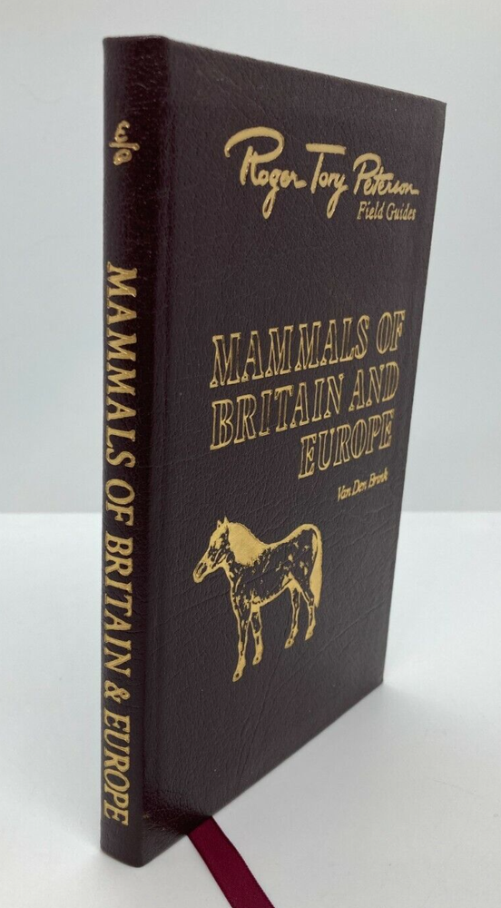 Up for sale is a beautiful 1986 Easton Press 50th Anniversary Edition copy of "ROGER TORY PETERSON FIELD GUIDES: MAMMALS OF BRITAIN AND EUROPE" by F.H. Van Den Brink . Gold Gilding to the boards and along the spine as well as gilded page ends. A beautiful copy of this classic field guide. A clear and comprehensive guide to mammal identification covering the British Isles, Iceland, Continental Europe West of 30° E. Longitude and the Mediterranean Islands. Identifying features, color patterns, size estimates, footprints, habitats and distribution are described, and 177 species are illustrated. Distribution maps provide the range of all species except the Whales. This book is in very good condition. Boards are straight and clean with four good corners. Internally the book is in excellent condition. Spine and pages are extremely tight. No marks, book plates, tears, or writing anywhere in this book. Please review all photos for your best idea of the condition. Shipping on this item will be $5.25. Thank You and Good Luck!!