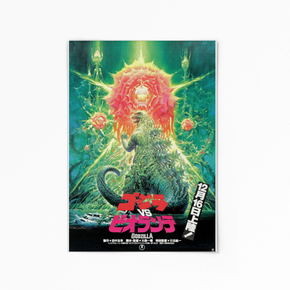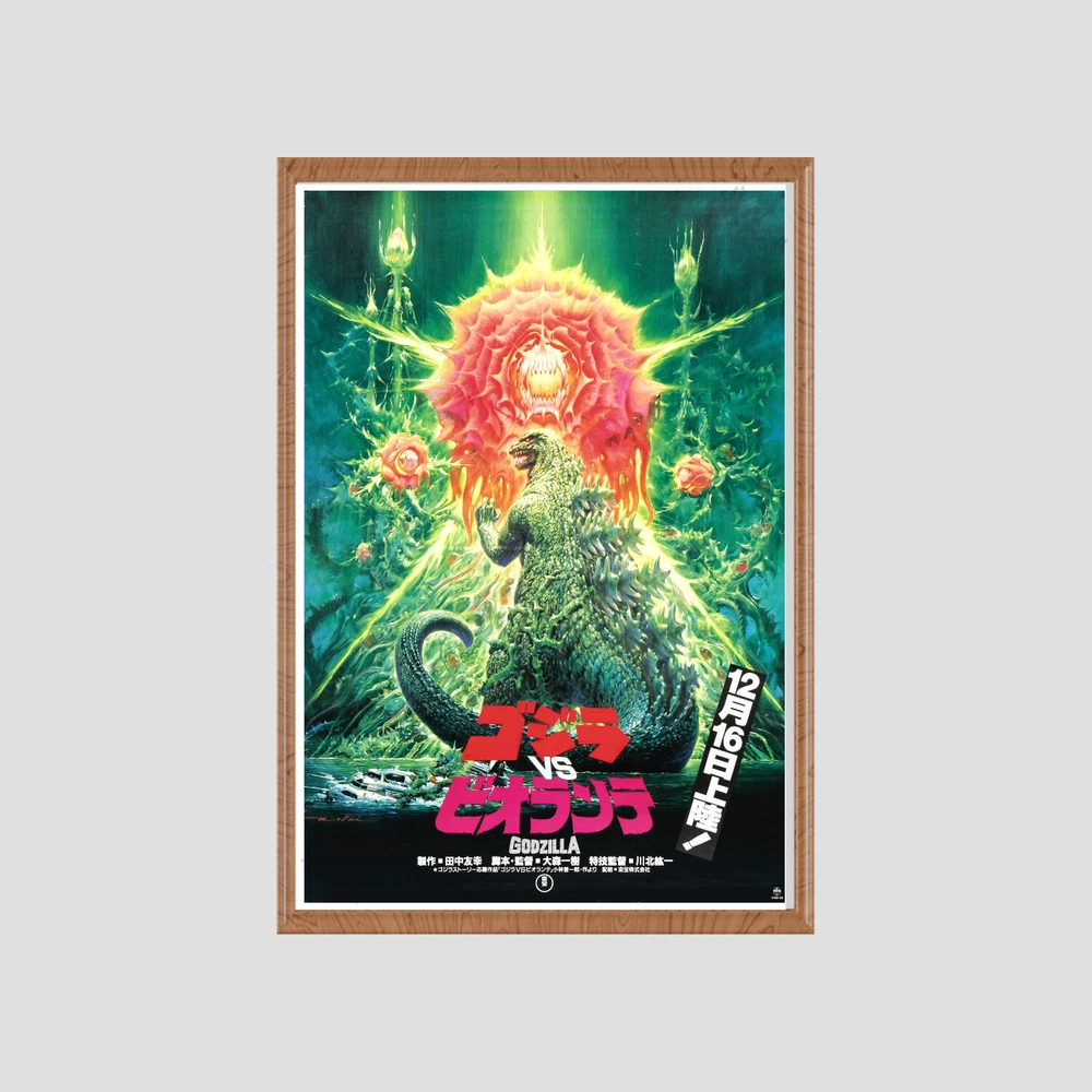 The artwork on this vibrantly colored canvas poster is based on the 1989 movie Godzilla V Biollante and has been painstakingly restored. Where applicable scratches, creases, and digital artifacts have been removed and text may have been replaced to present the original visual intent of the poster. In this Godzilla franchise movie, corporations struggle for control over samples of Godzilla's cells, while the monster itself battles a creature born from a combination of Godzilla's cells, the cells of a plant, and the cells of a woman. The idea originated from a public story-writing contest, and set a trend common to all Heisei era movies, in which Godzilla faces off against opponents capable of metamorphosing into new, progressively more powerful forms 24x36 Inches Printed on Museum Quality Cotton Canvas Ready To Frame Printed Using Archival Quality Pigmented Inks At Retroactives.com all orders qualify for free 2 to 3 day shipping!