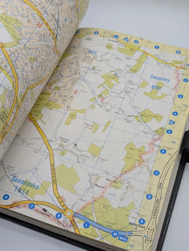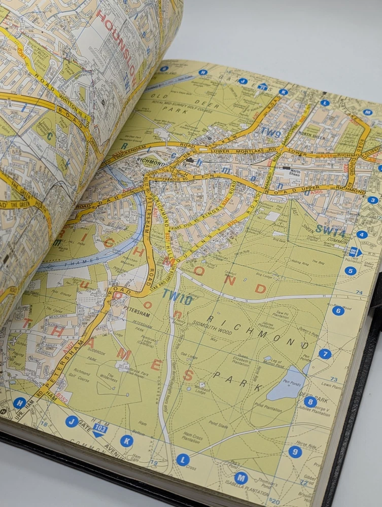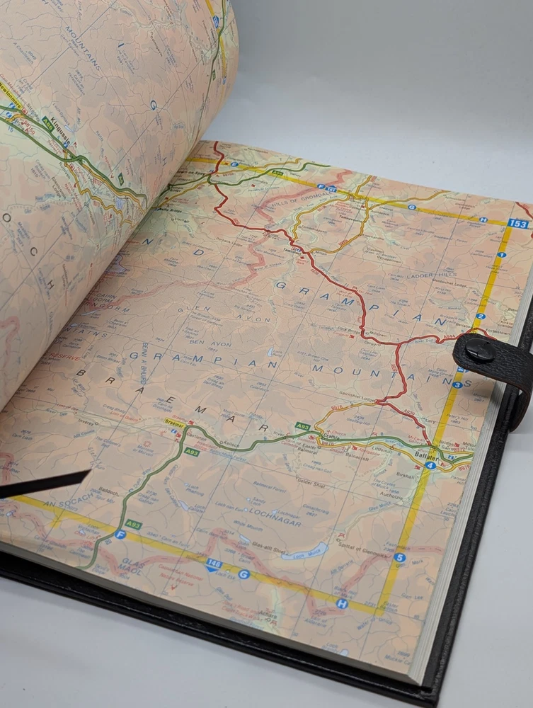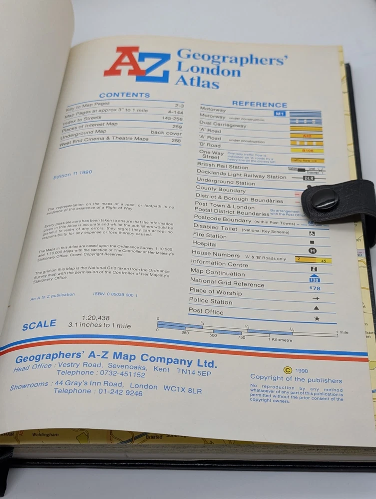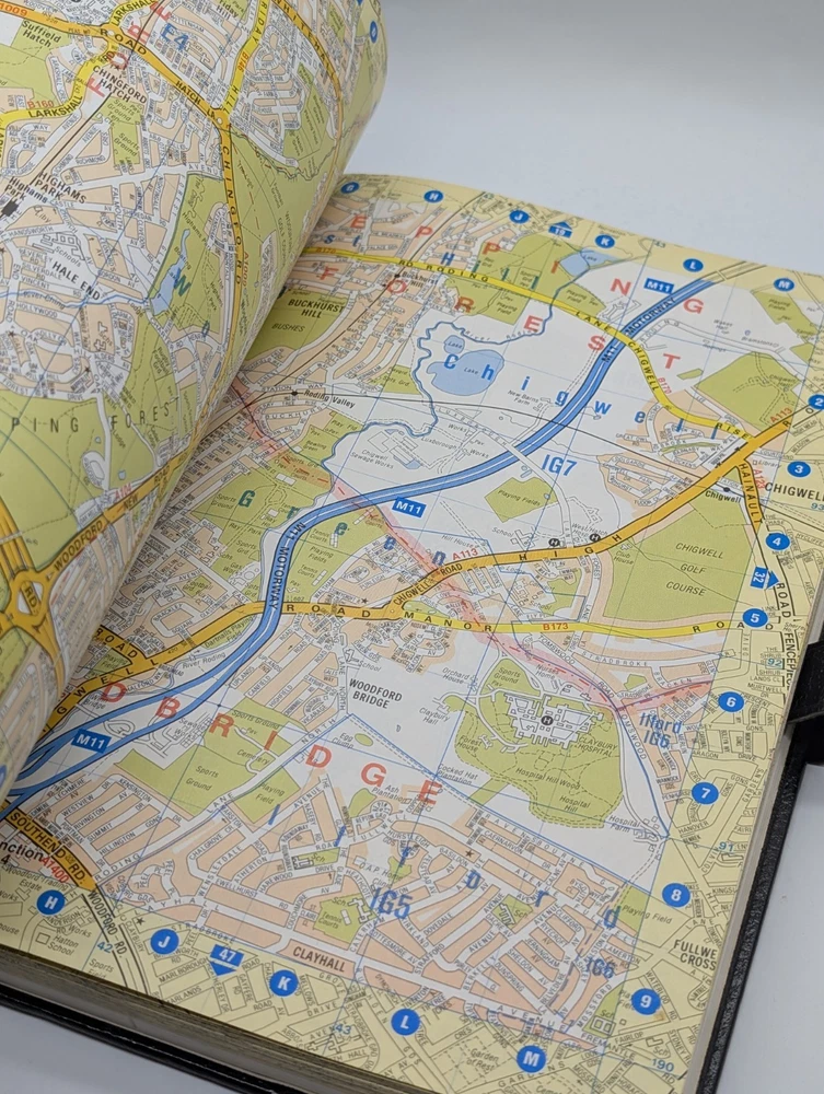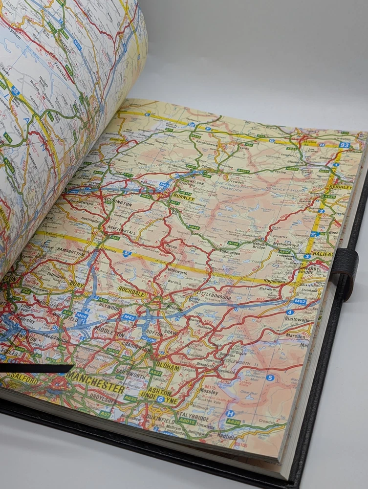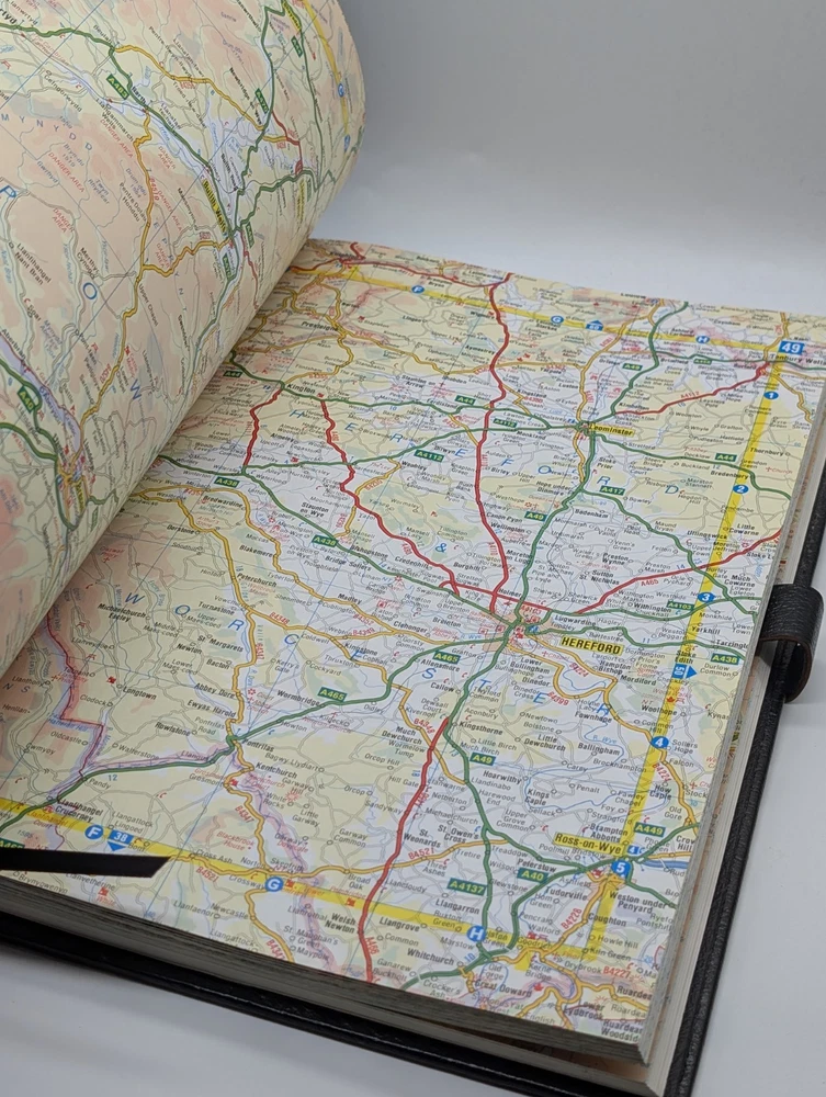 A rare pair of leather bound Atlas's from 1990 - these are Harrods branded as stamped on the rear of each, and have popper closures. Both in excellent condition as pictured. The Great Britain atlas is approximately 305 x 220mm and the London atlas approximately 255 x 175mm
