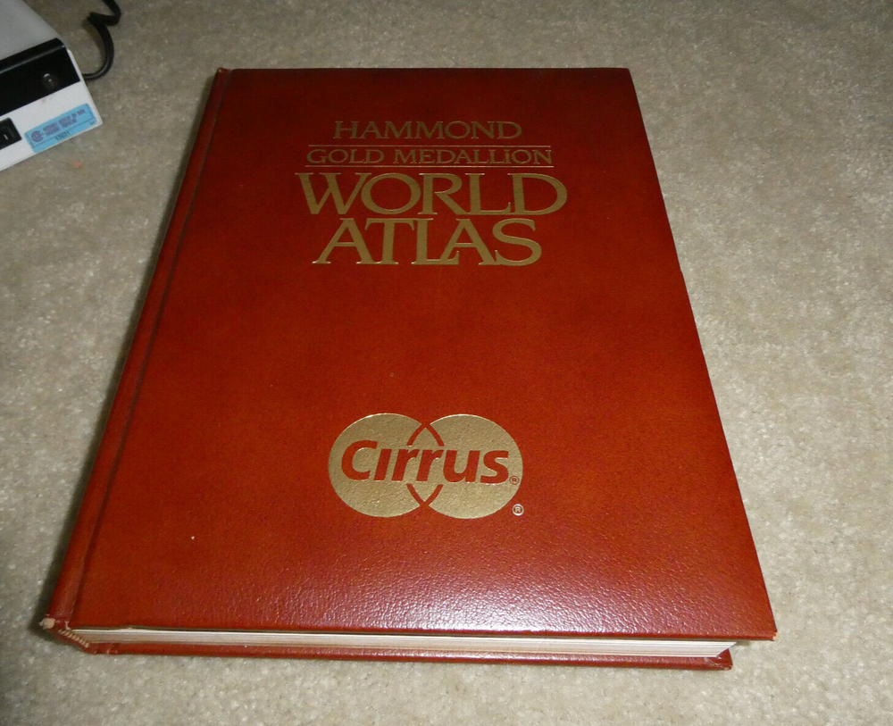 WELCOME TO OUR BOOK AUCTIONS. This is a very nice larger size book. A 1992 dated, leather hardcover book titled: Gold Medallion World Atlas by Hammond. Tons of pictures in here. Published by Hammond Incorporated. About 12 1/2 inches tall, 9 1/2 inches wide. Over 500 pages. Nice looking book, some light wear to the few corners, pages are in great shape. Zoom in for details. Winner agrees to add $9.99 to cover shipping by media mail with delivery confirmation.