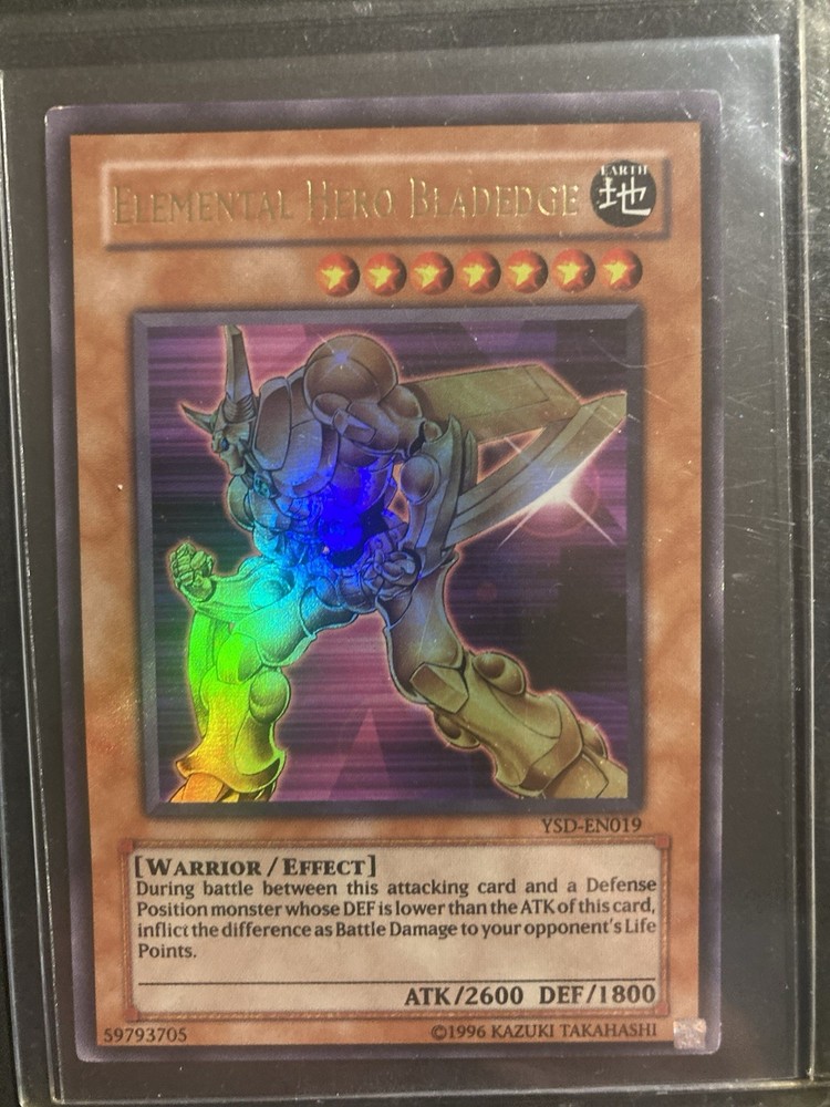 The 1996 Yu-Gi-Oh Elemental Hero Bladedge is a super rare 1st edition card from the Elemental Energy set. This Warrior card has a high defense of 2200 and an attack power of 2600, making it a formidable addition to any Yu-Gi-Oh! TCG collection. Manufactured by Konami, this English-language card is in near mint condition or better, featuring the iconic Elemental Hero design that collectors and players alike treasure. With its Earth attribute and Normal card type, this Bladedge card is a sought-after gem for any fan of the game.