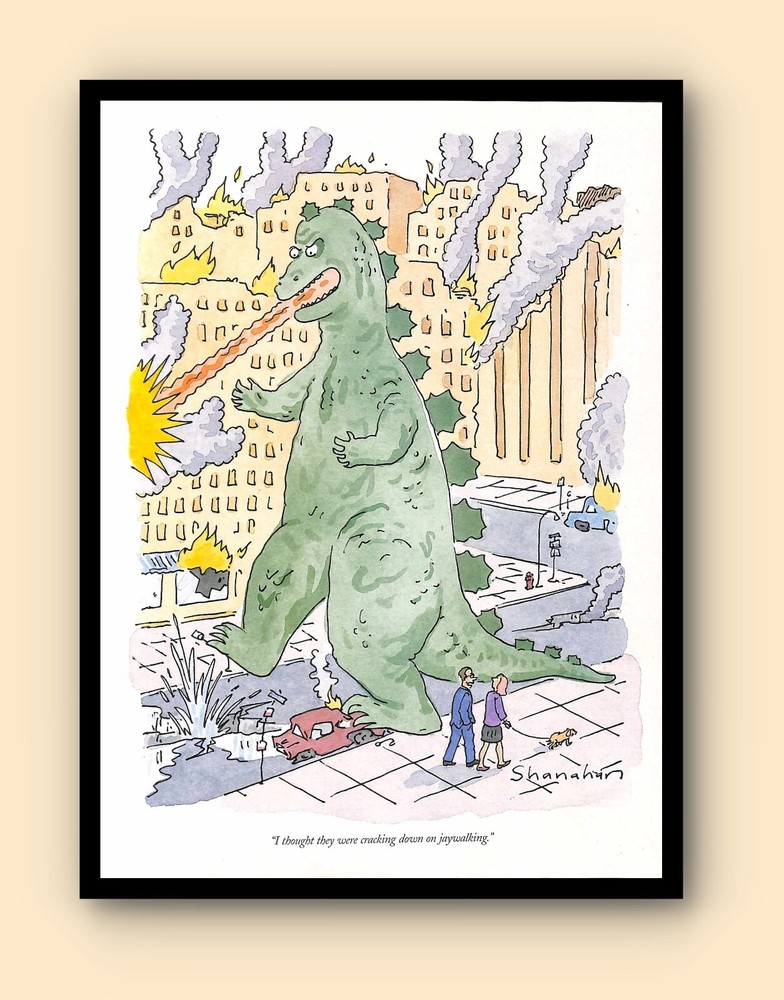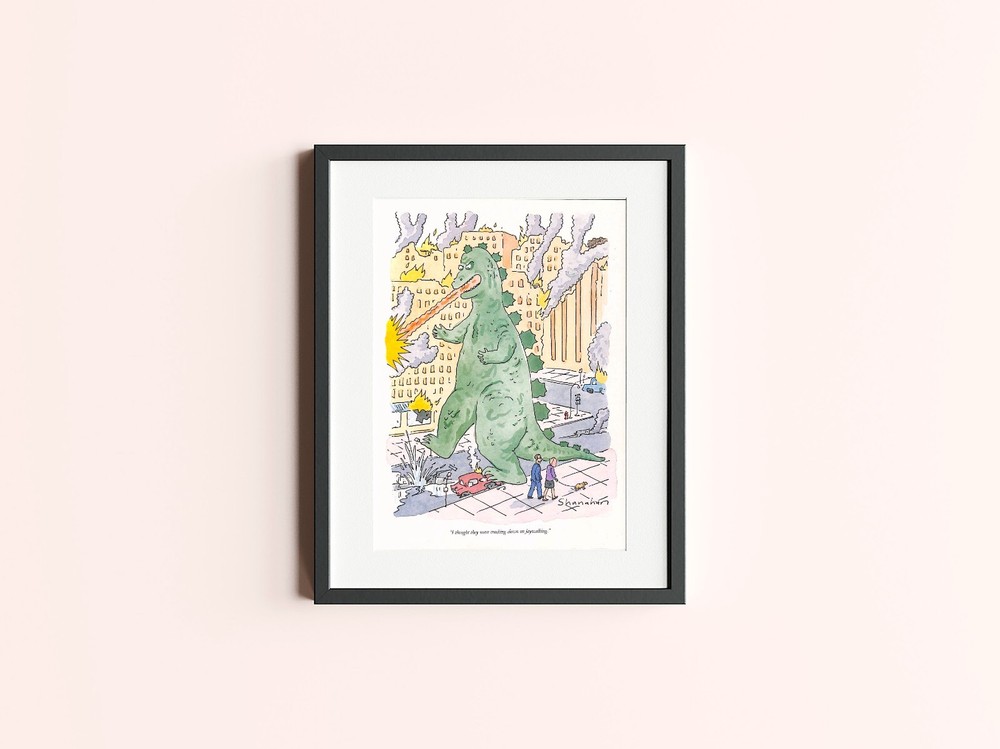 Original 1998 Danny Shanahan PRINT ART New York Godzilla Cartoon Humor Single page size: 7 3/4 " x 10 3/4" or 19,6 x 27 cm Item Condition : Excellent. Note : This is a print image taken from a vintage magazine. The black border or frame you see is for display purposes only, the actual ads don't contain frames. Vintage print ad is perfect for framing and creatively adding to your kitchen,living room or bedroom as an artistic and unique element of home decor.A relevant framed ad can significantly enhance the design of your business place interior such as a shop, bar, restaurant or a beauty salon. It can also make a good present, both original and inexpensive, to your friend or family member. Vintage advertisements might be purchased for your private collection of memorabilia as something evoking nostalgic memories and bringing you back to your youth or childhood time. All the ads and art we're selling are original and taken from vintage magazines, we don't sell reproductions. For combined shipping cost, please, add all the items you want to purchase into the shopping cart before checking out. The items are put i n paper protecting sleeves, sandwiched between two stiff pieces of cardboard to prevent bending, and shipped in a poly water-resistant mailer. If you have any questions about the item or problem with your order, please, contact us!