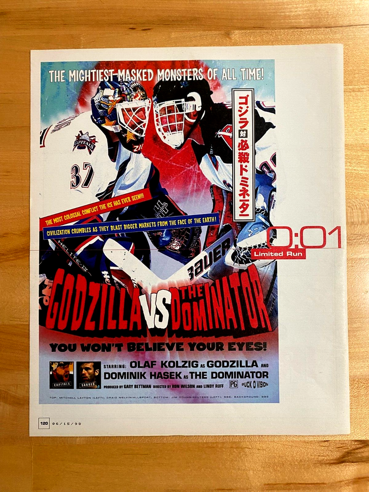 1998 Vintage Print Ad Godzilla vs The Dominator Capitals vs Sabres 10"x12" Hockey This would make, a great picture when framed for any garage, man cave, office, business, sports bar game room media room or shop. This is an ORIGINAL ad NOT A COPY OR A REPRINT. Perfect Gift for Birthday, Christmas or? Fond memories or wishful thinking. Fun pictures to bring smiles and happiness. Approximately 10" x 12" each page NOTE: There may be some slight yellowing or wear due to age. Also, pages may have some slight curling on one edge (inside edge where the magazine was stapled together) that should lay flat when framed. 2 page ads may not line up exactly when put together due to glue in the binding, on some magazines, that has to be cut away. They can still be framed together or with a slight space between and look GREAT! We try to keep as much of the picture as possible! The photos in the listing of the ads are taken with an iphone so I do adjust the color of the photos ONLY to make them reflect, as closely as possible, the REAL picture so there are no surprises when you receive your ad. I want your repeat business! Please look closely at the pic. I only ship within the US 48 States. (unless arrangements are made for extra shipping costs) Shipped in acid free, archival safe sleeve with cardboard protection and marked DO NOT BEND on both sides I WILL COMBINE SHIPPING ON MULTIPLE ITEMS HOW TO GET COMBINED SHIPPING 1) Add all items you want to purchase from our store to your CART (DO NOT PURCHASE YET) 2) Go to your cart and click on "request total from seller" (above the item price) 3) Wait for our reply with your invoice total with combined shipping If buying from your phone these options may not be available. NOT TO WORRY, I will gladly refund any extra shipping costs you may have paid when buying more than one item. If you have a question or a concern with your purchase, please message and let me know. I would love the opportunity to help solve any issues you may have. I work hard to maintain a 100% positive feedback rating. Thank you so much Tim TAKE A LOOK AND FOLLOW US at our store for more automobilia. TAYLORCO