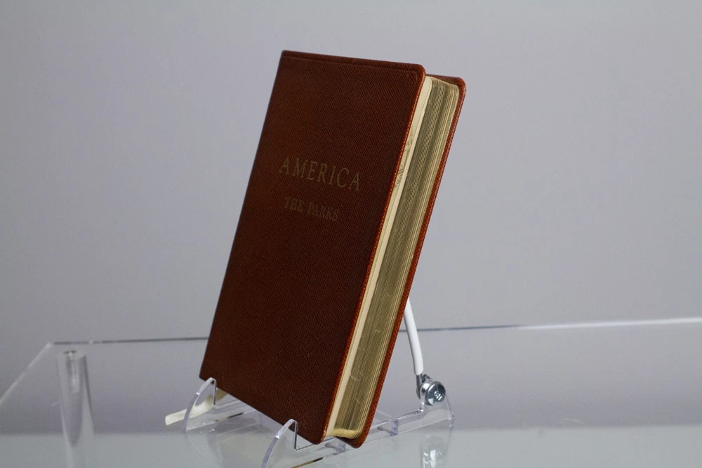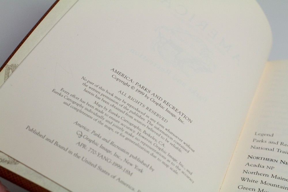 Explore the beauty of America's national parks with this vintage 1999 gold-lined cartography map guide book. Detailed with 320 pages of maps and geography, travel, and recreation topics, this leather-bound book is a must-have for any nature or outdoor enthusiast. Published by Graphic Image, Inc. and written in English, this book is perfect for anyone looking to discover the wonders of America's parks and recreation. From the stunning landscapes to the exciting vacation activities, this book is sure to inspire and inform. Get your hands on this amazing piece of history today! Like new condition. No noticeable tears, marks, or scratches. Measures 6" x 4.25". See photos for details and condition. Display stands not included.