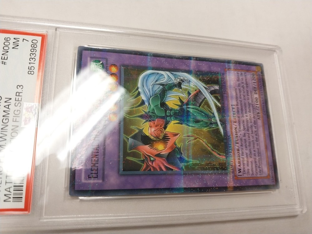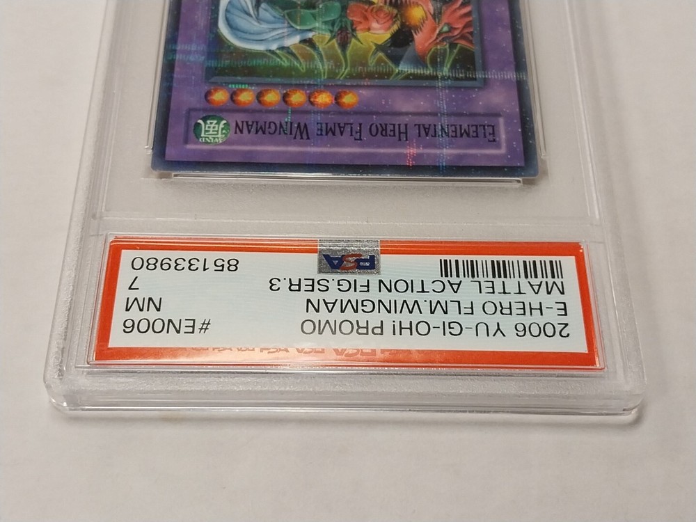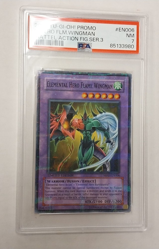This Yu-Gi-Oh! TCG card is a rare parallel rare from the - Yugi - set. The Elemental HERO Flame Wingman card features a flame creature/monster type and has been professionally graded by the Professional Sports Authenticator (PSA) with a grade of 7. Manufactured by Action, this card is a highly sought-after collectible item for fans of the game. The card name, Flame Wingman, adds to its appeal among collectors. Don't miss out on the chance to own this rare parallèle rare card!