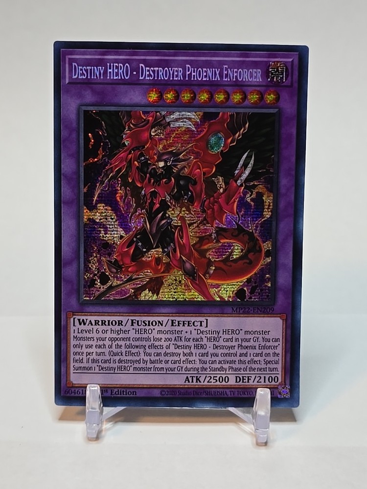 Elevate your Yu-Gi-Oh! TCG collection with the formidable Destiny HERO - Destroyer Phoenix Enforcer. This card, featuring the majestic Phoenix, is a must-have for enthusiasts seeking to enhance their gameplay with powerful spellcaster creatures. As a 1st Edition MP22-EN209, it stands as a unique piece in any collector's trove. Crafted by Konami, this card is a testament to the rich lore and strategic depth of the Yu-Gi-Oh! universe. The Phoenix Enforcer is not just a card but a gateway to unlocking new strategies and synergies within your deck. Whether for competitive play or simply as a treasured collectible, this card is a Phoenix rising from the ashes of your previous game.