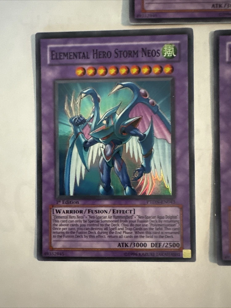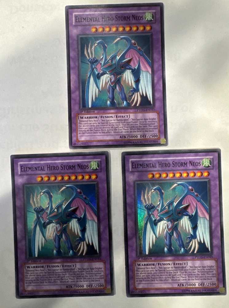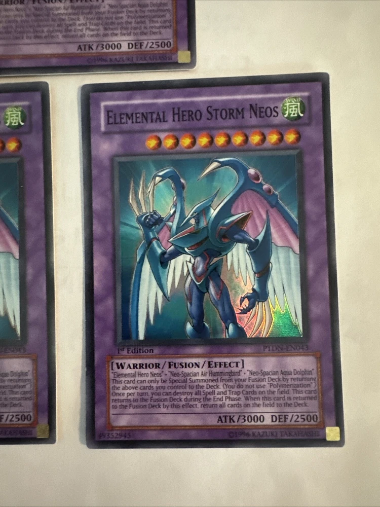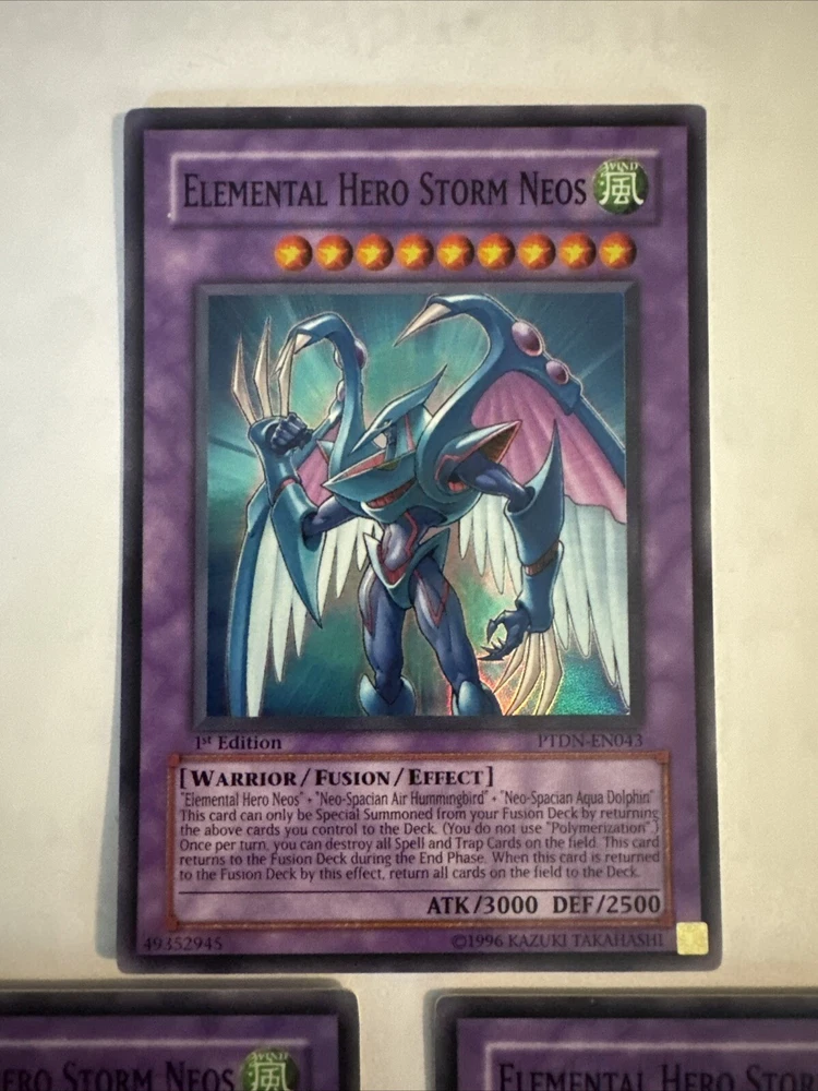 Yugioh Elemental HERO Storm Neos PTDN-EN043 Super Rare 1st Edition. Very light play. Few very small scuffs on the back. You receive ONE card per purchase. ***I will consider REASONABLE offers. If you offer 50% off or more I will not consider that a reasonable offer, and will be less likely to consider a lower price. Please do not ask me for a best price and counter with something way lower. I do combine shipping but do not ask for a shipping discount on a single item. We calculate shipping based on weight, size, and location.