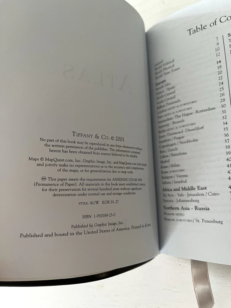 This vintage book from Tiffany & Co is a must-have for any collector or lover of antique maps. This green full grain hide leather bound book contains color maps of the world's continents, countries, and regions, along with detailed illustrations and descriptions; gold gilded pages and is a Tiffany & Co original. Published in 2001 by Graphic Image Inc in New York, this original book is a rare find that will make a great addition to any collection. Leather has a couple of little lines on cover, but overall it is in very good condition. Has never been used. Secure Same Day/Next Day Shipping.