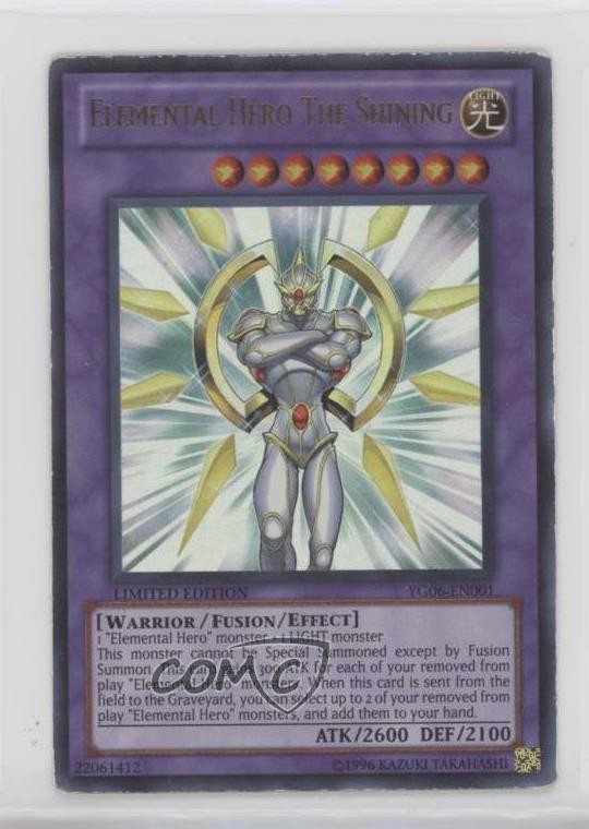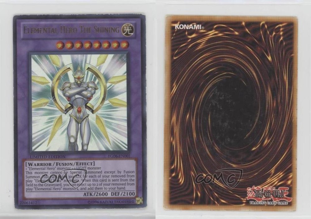 2002-Now Yu-Gi-Oh! - Miscellaneous Promos #YG06-EN001 Elemental HERO The Shining (Yu-Gi-Oh! GX Manga - Vol. 6) COMC Item: 224703410 - YuGiOh Card - Featuring Elemental HERO The Shining Search for more: 2002-Now Yu-Gi-Oh! Search for more: 2002-Now Yu-Gi-Oh! - Miscellaneous Promos View all of our Listings Auctions Buy It Now About Us Located in the beautiful Pacific Northwest, COMC (Check Out My Cards) is the world's largest consignment service for trading card singles. More than 10,000 people have used our consignment service to list over 50 million trading cards. Find out how we can help you consign your items on eBay by contacting us through eBay messaging. COMC -- "The Safe & Easy Way to Buy & Sell" Raw Condition for Modern Cards Unless otherwise noted, raw modern cards are listed in Near Mint-Mint condition or better. A NM-MT card appears to be Mint at first glance, but upon closer inspection, may exhibit some of the following: minor print defects (e.g. roller marks, print line, dimple), minor scratches, slight edge wear, and slight corner wear. Centering is clearly visible in the images provided and does not factor into our condition assessment. Raw Condition for Vintage Cards Unless otherwise noted, raw vintage cards are listed in Excellent condition or better. An EX card may exhibit some of the following: minor rounding of corners, surface wear, print defects, light scratches, and slight edge wear/chipping. Centering is clearly visible in the images provided and does not factor into our condition assessment. Domestic Shipping Combined shipping for multiple items is available. To receive combined shipping, please ensure all desired items are in your eBay shopping cart before proceeding to checkout. eBay limits orders to 40 items per order. We automatically combine multiple orders placed on the same day. If you place multiple orders on the same day, please contact us to request a refund of applicable shipping costs. Signature confirmation may be required on invoices over $400. All cards are protected and shipped securely. International Shipping COMC offers eBay's International Shipping (EIS) for international orders under $2,500* (see country exceptions below). All duties and import fees are paid at checkout; in the rare event that there are additional import fees upon delivery, these are borne by the buyer. EIS packages route through a shipping hub in Erlanger, KY before shipping to their final destination. Please note that EIS does not allow for combined shipments. The shipping rates are determined by eBay and cannot be adjusted. *Maximum sale price exceptions: Colombia, Kuwait ($2,000); Taiwan ($1,539); Chile, Costa Rica, Guatemala, Honduras, Trinidad and Tobago ($1,000); Antigua and Barbuda, Aruba, Belize, Dominica, Grenada, Philippines, Saint Kitts and Nevis, Saint Lucia, Montserrat, Turks and Caicos Islands ($500); Dominican Republic, El Salvador ($200). Please request a shipping quote through eBay messaging for orders that exceed the maximum sale price supported by eBay's International Shipping. You will be responsible for all duties and import fees for international orders shipped outside the EIS. All cards are protected and shipped securely. Payment COMC does not accept offers on our cards through our eBay storefront. COMC utilizes eBay’s managed payments system. If you are experiencing difficulties making a payment, please contact eBay for assistance. Return Policy Returns are only accepted on the rare occasion the item is not as described. If you are making a return, please initiate the return process through eBay so a mailing label can be provided for you. Prior to listing, our expert team carefully assessed this item to represent it accurately. Please review the description and high-definition images prior to purchasing to ensure this item meets your satisfaction. We welcome you to contact us if you have further questions about this item. Trust and Integrity COMC carefully assesses each item consigned to us to prevent fraudulent items from entering the marketplace. If you believe an item offered on COMC may be fraudulent, please contact us with details so we can investigate the issue. Items we determine are outside our supported items policy may be removed. Last Modified: 6/11/2025 12:09:01 AM PDT