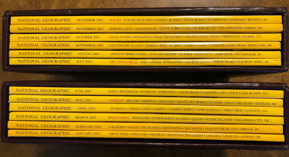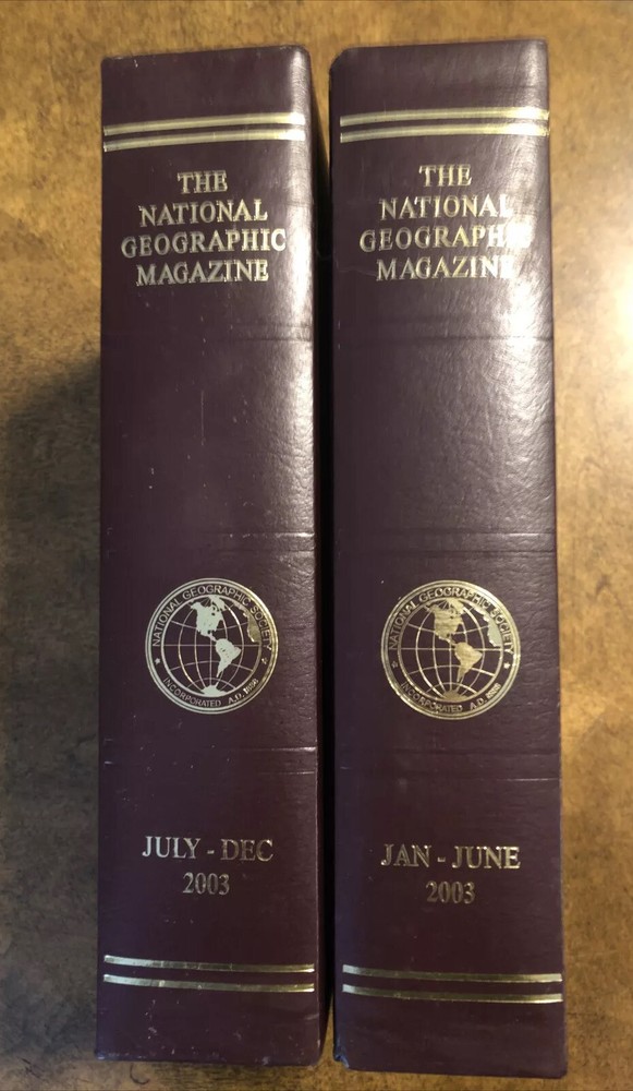 This complete set of National Geographic magazines from the year 2003, comes with leather case covers and maps. The pages are filled with striking images, fascinating articles, and captivating stories from around the world. Whether you are an avid collector or just starting out, this set is the perfect addition to any bookshelf. The magazines are published by National Geographic and written by their team of experienced staff. They are in English and are perfect for anyone interested in travel, science, culture, and nature. Don't miss out on the chance to own this incredible collection. SEE MY OTHER ITEMS