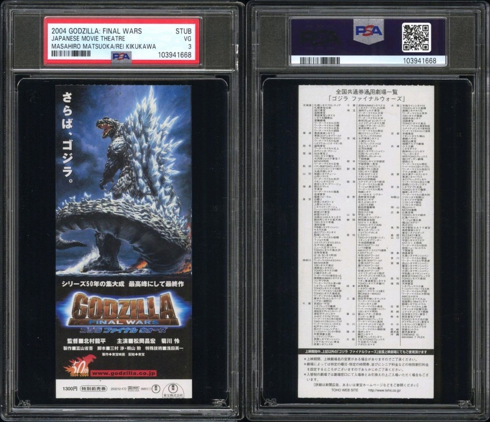 The product is a ticket stub from the 2004 Godzilla Final Wars movie, which was released in Japan. This original piece of memorabilia is a collectible item for fans of the Godzilla franchise and movie enthusiasts. The ticket stub holds historical significance as a piece of pop culture from that era, showcasing an iconic piece of cinematic history.