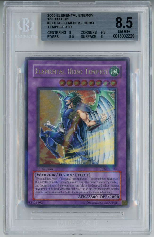 Description Condition: BGS 8.5 NM-MT Availability: In Stock You are Purchasing 2005 YUGIOH 1ST EEN-EN034 ELEMENTAL HERO TEMPEST ULTIMATE BGS 8.5 NM #0015982229 Professionally graded by BECKETT GRADING SERVICES (BGS) *PLEASE REVIEW PHOTO(S) BEFORE PURCHASING >>CHECK OUT OUR OTHER POKEMON<< >>PSA CARDS ON AUCTION<< IG: CARD_RUSH_INC Payment Options Payment is expected within 2 weeks of your purchase date. We accept all forms of payments through Paypal. Shipping and Handling We ship to all U.S. states, U.S. territories, APO/FPO locations and any international countries listed under our "ship to" heading. Shipping and Handling is calculated based on the combined shipping weight of your item(s). Please use the shipping calculator to estimate your shipping and handling charges. In order to qualify for combined shipping terms, all items must be paid for in one payment; please do not pay until you are done bidding/shopping. Please contact us if you have any questions regarding our shipping and handling terms. Shipping and Delivery Packages are shipped out every Monday, Wednesday, and Friday. Domestic Packages take approximately 2-7 days to arrive. International packages may take a little longer to arrive, typically 1-4 weeks. Please allow ample transit times before inquiring about your package, thank you. Sales Tax Sales tax will be automatically collected by Ebay. Customer Service We will make every effort to get your purchase is mailed in a timely manner. Please contact us if you have any questions or concerns; we would love to hear any suggestions you have on how we can improve your eBay experience. Thank you for visiting us today.