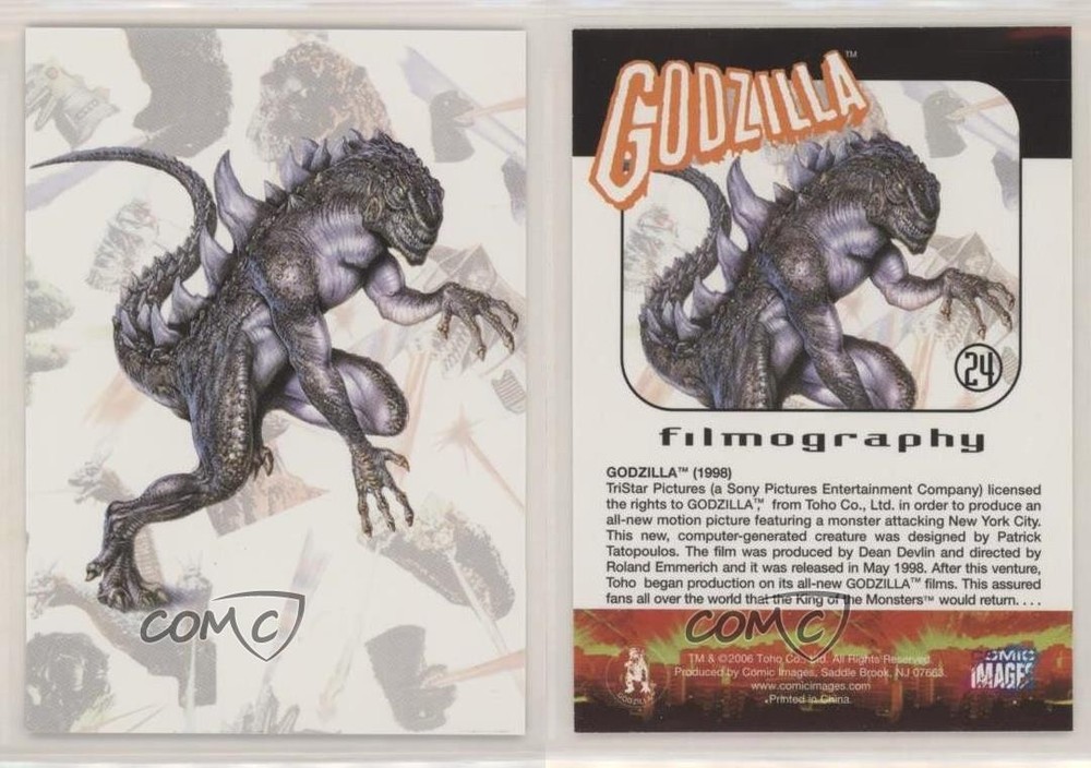 2006 Comic Images Godzilla: King of the Monsters - [Base] #24 Filmography - Godzilla COMC Item: 106111909 - Non-Sports Card - Featuring Godzilla Search for more: 2006 Comic Images Godzilla: King of the Monsters Search for more: 2006 Comic Images Godzilla: King of the Monsters - [Base] View all of our Listings Auctions Buy It Now About Us Located in the beautiful Pacific Northwest, COMC (Check Out My Cards) is the world's largest consignment service for trading card singles. More than 10,000 people have used our consignment service to list over 50 million trading cards. Find out how we can help you consign your items on eBay by contacting us through eBay messaging. COMC -- "The Safe & Easy Way to Buy & Sell" Raw Condition for Modern Cards Unless otherwise noted, raw modern cards are listed in Near Mint-Mint condition or better. A NM-MT card appears to be Mint at first glance, but upon closer inspection, may exhibit some of the following: minor print defects (e.g. roller marks, print line, dimple), minor scratches, slight edge wear, and slight corner wear. Centering is clearly visible in the images provided and does not factor into our condition assessment. Raw Condition for Vintage Cards Unless otherwise noted, raw vintage cards are listed in Excellent condition or better. An EX card may exhibit some of the following: minor rounding of corners, surface wear, print defects, light scratches, and slight edge wear/chipping. Centering is clearly visible in the images provided and does not factor into our condition assessment. Domestic Shipping Combined shipping for multiple items is available. To receive combined shipping, please ensure all desired items are in your eBay shopping cart before proceeding to checkout. eBay limits orders to 40 items per order. We automatically combine multiple orders placed on the same day. If you place multiple orders on the same day, please contact us to request a refund of applicable shipping costs. Signature confirmation may be required on invoices over $400. All cards are protected and shipped securely. International Shipping COMC offers eBay's International Shipping (EIS) for international orders under $2,500* (see country exceptions below). All duties and import fees are paid at checkout; in the rare event that there are additional import fees upon delivery, these are borne by the buyer. EIS packages route through a shipping hub in Erlanger, KY before shipping to their final destination. Please note that EIS does not allow for combined shipments. The shipping rates are determined by eBay and cannot be adjusted. *Maximum sale price exceptions: Colombia, Kuwait ($2,000); Taiwan ($1,539); Chile, Costa Rica, Guatemala, Honduras, Trinidad and Tobago ($1,000); Antigua and Barbuda, Aruba, Belize, Dominica, Grenada, Philippines, Saint Kitts and Nevis, Saint Lucia, Montserrat, Turks and Caicos Islands ($500); Dominican Republic, El Salvador ($200). Please request a shipping quote through eBay messaging for orders that exceed the maximum sale price supported by eBay's International Shipping. You will be responsible for all duties and import fees for international orders shipped outside the EIS. All cards are protected and shipped securely. Payment COMC does not accept offers on our cards through our eBay storefront. COMC utilizes eBay’s managed payments system. If you are experiencing difficulties making a payment, please contact eBay for assistance. Return Policy Returns are only accepted on the rare occasion the item is not as described. If you are making a return, please initiate the return process through eBay so a mailing label can be provided for you. Prior to listing, our expert team carefully assessed this item to represent it accurately. Please review the description and high-definition images prior to purchasing to ensure this item meets your satisfaction. We welcome you to contact us if you have further questions about this item. Trust and Integrity COMC carefully assesses each item consigned to us to prevent fraudulent items from entering the marketplace. If you believe an item offered on COMC may be fraudulent, please contact us with details so we can investigate the issue. Items we determine are outside our supported items policy may be removed. Last Modified: 6/6/2025 7:01:22 PM PDT