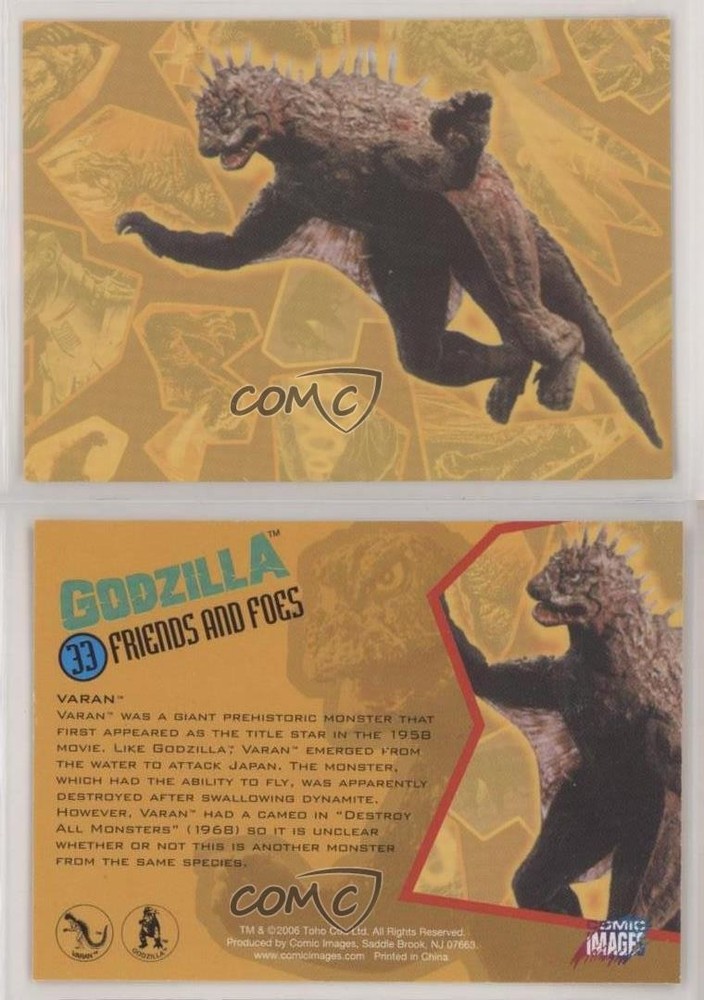 This Varan card is a must-have for any Godzilla fan! The artwork is vibrant, capturing the monster's unique design perfectly. It's a great addition to the Friends and Foes set, and the quality is solid for a 2006 release. Love the nostalgic feel—definitely worth adding to your collection!
