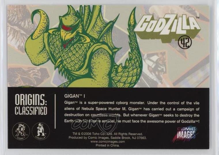 2006 Comic Images Godzilla: King of the Monsters - [Base] #42 Origins: Classified - Gigan COMC Item: 255862157 - Non-Sports Card - Featuring Gigan Search for more: 2006 Comic Images Godzilla: King of the Monsters Search for more: 2006 Comic Images Godzilla: King of the Monsters - [Base] View all of our Listings Auctions Buy It Now About Us Located in the beautiful Pacific Northwest, COMC (Check Out My Cards) is the world's largest consignment service for trading card singles. More than 10,000 people have used our consignment service to list over 50 million trading cards. Find out how we can help you consign your items on eBay by contacting us through eBay messaging. COMC -- "The Safe & Easy Way to Buy & Sell" Raw Condition for Modern Cards Unless otherwise noted, raw modern cards are listed in Near Mint-Mint condition or better. A NM-MT card appears to be Mint at first glance, but upon closer inspection, may exhibit some of the following: minor print defects (e.g. roller marks, print line, dimple), minor scratches, slight edge wear, and slight corner wear. Centering is clearly visible in the images provided and does not factor into our condition assessment. Raw Condition for Vintage Cards Unless otherwise noted, raw vintage cards are listed in Excellent condition or better. An EX card may exhibit some of the following: minor rounding of corners, surface wear, print defects, light scratches, and slight edge wear/chipping. Centering is clearly visible in the images provided and does not factor into our condition assessment. Domestic Shipping Combined shipping for multiple items is available. To receive combined shipping, please ensure all desired items are in your eBay shopping cart before proceeding to checkout. eBay limits orders to 40 items per order. We automatically combine multiple orders placed on the same day. If you place multiple orders on the same day, please contact us to request a refund of applicable shipping costs. Signature confirmation may be required on invoices over $400. All cards are protected and shipped securely. International Shipping COMC offers eBay's International Shipping (EIS) for international orders under $2,500* (see country exceptions below). All duties and import fees are paid at checkout; in the rare event that there are additional import fees upon delivery, these are borne by the buyer. EIS packages route through a shipping hub in Erlanger, KY before shipping to their final destination. Please note that EIS does not allow for combined shipments. The shipping rates are determined by eBay and cannot be adjusted. *Maximum sale price exceptions: Colombia, Kuwait ($2,000); Taiwan ($1,539); Chile, Costa Rica, Guatemala, Honduras, Trinidad and Tobago ($1,000); Antigua and Barbuda, Aruba, Belize, Dominica, Grenada, Philippines, Saint Kitts and Nevis, Saint Lucia, Montserrat, Turks and Caicos Islands ($500); Dominican Republic, El Salvador ($200). Please request a shipping quote through eBay messaging for orders that exceed the maximum sale price supported by eBay's International Shipping. You will be responsible for all duties and import fees for international orders shipped outside the EIS. All cards are protected and shipped securely. Payment COMC does not accept offers on our cards through our eBay storefront. COMC utilizes eBay’s managed payments system. If you are experiencing difficulties making a payment, please contact eBay for assistance. Return Policy Returns are only accepted on the rare occasion the item is not as described. If you are making a return, please initiate the return process through eBay so a mailing label can be provided for you. Prior to listing, our expert team carefully assessed this item to represent it accurately. Please review the description and high-definition images prior to purchasing to ensure this item meets your satisfaction. We welcome you to contact us if you have further questions about this item. Trust and Integrity COMC carefully assesses each item consigned to us to prevent fraudulent items from entering the marketplace. If you believe an item offered on COMC may be fraudulent, please contact us with details so we can investigate the issue. Items we determine are outside our supported items policy may be removed. Last Modified: 5/7/2025 6:04:44 AM PDT