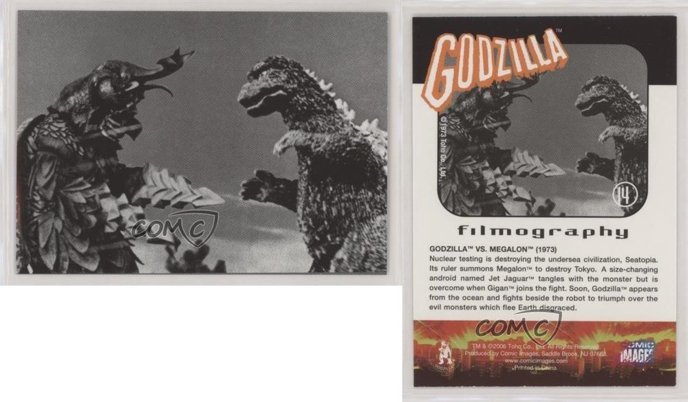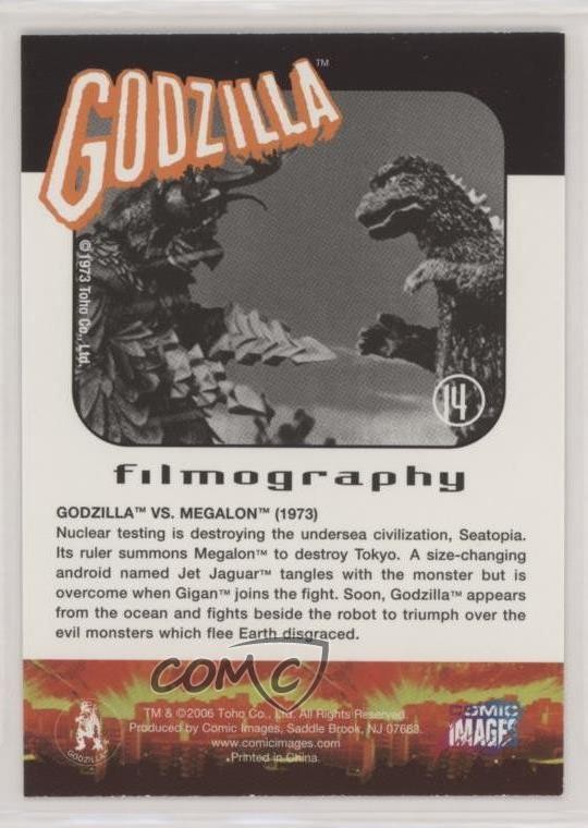 2006 Comic Images Godzilla: King of the Monsters - [Base] #14 Filmography - Godzilla Vs. Megalon (1973) COMC Item: 105243385 - Non-Sports Card Search for more: 2006 Comic Images Godzilla: King of the Monsters Search for more: 2006 Comic Images Godzilla: King of the Monsters - [Base] View all of our Listings Auctions Buy It Now About Us Located in the beautiful Pacific Northwest, COMC (Check Out My Cards) is the world's largest consignment service for trading card singles. More than 10,000 people have used our consignment service to list over 50 million trading cards. Find out how we can help you consign your items on eBay by contacting us through eBay messaging. COMC -- "The Safe & Easy Way to Buy & Sell" Raw Condition for Modern Cards Unless otherwise noted, raw modern cards are listed in Near Mint-Mint condition or better. A NM-MT card appears to be Mint at first glance, but upon closer inspection, may exhibit some of the following: minor print defects (e.g. roller marks, print line, dimple), minor scratches, slight edge wear, and slight corner wear. Centering is clearly visible in the images provided and does not factor into our condition assessment. Raw Condition for Vintage Cards Unless otherwise noted, raw vintage cards are listed in Excellent condition or better. An EX card may exhibit some of the following: minor rounding of corners, surface wear, print defects, light scratches, and slight edge wear/chipping. Centering is clearly visible in the images provided and does not factor into our condition assessment. Domestic Shipping Combined shipping for multiple items is available. To receive combined shipping, please ensure all desired items are in your eBay shopping cart before proceeding to checkout. eBay limits orders to 40 items per order. We automatically combine multiple orders placed on the same day. If you place multiple orders on the same day, please contact us to request a refund of applicable shipping costs. Signature confirmation may be required on invoices over $400. All cards are protected and shipped securely. International Shipping COMC offers eBay's International Shipping (EIS) for international orders under $2,500* (see country exceptions below). All duties and import fees are paid at checkout; in the rare event that there are additional import fees upon delivery, these are borne by the buyer. EIS packages route through a shipping hub in Erlanger, KY before shipping to their final destination. Please note that EIS does not allow for combined shipments. The shipping rates are determined by eBay and cannot be adjusted. *Maximum sale price exceptions: Colombia, Kuwait ($2,000); Taiwan ($1,539); Chile, Costa Rica, Guatemala, Honduras, Trinidad and Tobago ($1,000); Antigua and Barbuda, Aruba, Belize, Dominica, Grenada, Philippines, Saint Kitts and Nevis, Saint Lucia, Montserrat, Turks and Caicos Islands ($500); Dominican Republic, El Salvador ($200). Please request a shipping quote through eBay messaging for orders that exceed the maximum sale price supported by eBay's International Shipping. You will be responsible for all duties and import fees for international orders shipped outside the EIS. All cards are protected and shipped securely. Payment COMC does not accept offers on our cards through our eBay storefront. COMC utilizes eBay’s managed payments system. If you are experiencing difficulties making a payment, please contact eBay for assistance. Return Policy Returns are only accepted on the rare occasion the item is not as described. If you are making a return, please initiate the return process through eBay so a mailing label can be provided for you. Prior to listing, our expert team carefully assessed this item to represent it accurately. Please review the description and high-definition images prior to purchasing to ensure this item meets your satisfaction. We welcome you to contact us if you have further questions about this item. Trust and Integrity COMC carefully assesses each item consigned to us to prevent fraudulent items from entering the marketplace. If you believe an item offered on COMC may be fraudulent, please contact us with details so we can investigate the issue. Items we determine are outside our supported items policy may be removed. Last Modified: 5/17/2025 7:27:32 PM PDT