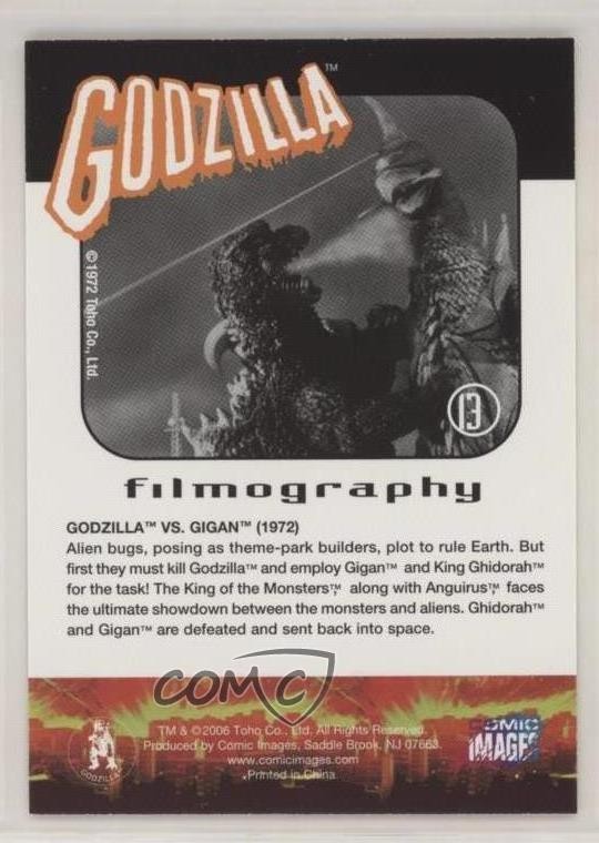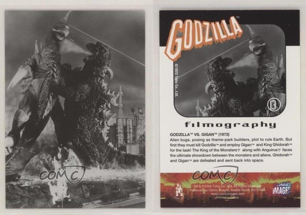 2006 Comic Images Godzilla: King of the Monsters - [Base] #13 Filmography - Godzilla vs. Gigan COMC Item: 106111886 - Non-Sports Card - Featuring Godzilla and Gigan Search for more: 2006 Comic Images Godzilla: King of the Monsters Search for more: 2006 Comic Images Godzilla: King of the Monsters - [Base] View all of our Listings Auctions Buy It Now About Us Located in the beautiful Pacific Northwest, COMC (Check Out My Cards) is the world's largest consignment service for trading card singles. More than 10,000 people have used our consignment service to list over 50 million trading cards. Find out how we can help you consign your items on eBay by contacting us through eBay messaging. COMC -- "The Safe & Easy Way to Buy & Sell" Raw Condition for Modern Cards Unless otherwise noted, raw modern cards are listed in Near Mint-Mint condition or better. A NM-MT card appears to be Mint at first glance, but upon closer inspection, may exhibit some of the following: minor print defects (e.g. roller marks, print line, dimple), minor scratches, slight edge wear, and slight corner wear. Centering is clearly visible in the images provided and does not factor into our condition assessment. Raw Condition for Vintage Cards Unless otherwise noted, raw vintage cards are listed in Excellent condition or better. An EX card may exhibit some of the following: minor rounding of corners, surface wear, print defects, light scratches, and slight edge wear/chipping. Centering is clearly visible in the images provided and does not factor into our condition assessment. Domestic Shipping Combined shipping for multiple items is available. To receive combined shipping, please ensure all desired items are in your eBay shopping cart before proceeding to checkout. eBay limits orders to 40 items per order. We automatically combine multiple orders placed on the same day. If you place multiple orders on the same day, please contact us to request a refund of applicable shipping costs. Signature confirmation may be required on invoices over $400. All cards are protected and shipped securely. International Shipping COMC offers eBay's International Shipping (EIS) for international orders under $2,500* (see country exceptions below). All duties and import fees are paid at checkout; in the rare event that there are additional import fees upon delivery, these are borne by the buyer. EIS packages route through a shipping hub in Erlanger, KY before shipping to their final destination. Please note that EIS does not allow for combined shipments. The shipping rates are determined by eBay and cannot be adjusted. *Maximum sale price exceptions: Colombia, Kuwait ($2,000); Taiwan ($1,539); Chile, Costa Rica, Guatemala, Honduras, Trinidad and Tobago ($1,000); Antigua and Barbuda, Aruba, Belize, Dominica, Grenada, Philippines, Saint Kitts and Nevis, Saint Lucia, Montserrat, Turks and Caicos Islands ($500); Dominican Republic, El Salvador ($200). Please request a shipping quote through eBay messaging for orders that exceed the maximum sale price supported by eBay's International Shipping. You will be responsible for all duties and import fees for international orders shipped outside the EIS. All cards are protected and shipped securely. Payment COMC does not accept offers on our cards through our eBay storefront. COMC utilizes eBay’s managed payments system. If you are experiencing difficulties making a payment, please contact eBay for assistance. Return Policy Returns are only accepted on the rare occasion the item is not as described. If you are making a return, please initiate the return process through eBay so a mailing label can be provided for you. Prior to listing, our expert team carefully assessed this item to represent it accurately. Please review the description and high-definition images prior to purchasing to ensure this item meets your satisfaction. We welcome you to contact us if you have further questions about this item. Trust and Integrity COMC carefully assesses each item consigned to us to prevent fraudulent items from entering the marketplace. If you believe an item offered on COMC may be fraudulent, please contact us with details so we can investigate the issue. Items we determine are outside our supported items policy may be removed. Last Modified: 6/6/2025 7:01:04 PM PDT