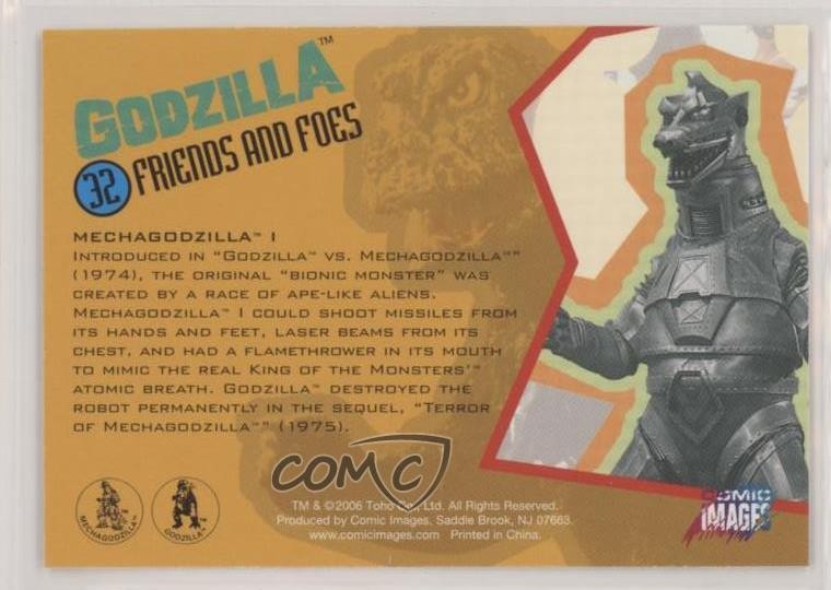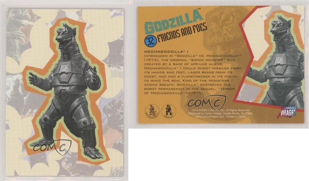 2006 Comic Images Godzilla: King of the Monsters - [Base] #32 Friends And Foes - Mechagodzilla COMC Item: 105240662 - Non-Sports Card - Featuring Mechagodzilla Search for more: 2006 Comic Images Godzilla: King of the Monsters Search for more: 2006 Comic Images Godzilla: King of the Monsters - [Base] View all of our Listings Auctions Buy It Now About Us Located in the beautiful Pacific Northwest, COMC (Check Out My Cards) is the world's largest consignment service for trading card singles. More than 10,000 people have used our consignment service to list over 50 million trading cards. Find out how we can help you consign your items on eBay by contacting us through eBay messaging. COMC -- "The Safe & Easy Way to Buy & Sell" Raw Condition for Modern Cards Unless otherwise noted, raw modern cards are listed in Near Mint-Mint condition or better. A NM-MT card appears to be Mint at first glance, but upon closer inspection, may exhibit some of the following: minor print defects (e.g. roller marks, print line, dimple), minor scratches, slight edge wear, and slight corner wear. Centering is clearly visible in the images provided and does not factor into our condition assessment. Raw Condition for Vintage Cards Unless otherwise noted, raw vintage cards are listed in Excellent condition or better. An EX card may exhibit some of the following: minor rounding of corners, surface wear, print defects, light scratches, and slight edge wear/chipping. Centering is clearly visible in the images provided and does not factor into our condition assessment. Domestic Shipping Combined shipping for multiple items is available. To receive combined shipping, please ensure all desired items are in your eBay shopping cart before proceeding to checkout. eBay limits orders to 40 items per order. We automatically combine multiple orders placed on the same day. If you place multiple orders on the same day, please contact us to request a refund of applicable shipping costs. Signature confirmation may be required on invoices over $400. All cards are protected and shipped securely. International Shipping COMC offers eBay's International Shipping (EIS) for international orders under $2,500* (see country exceptions below). All duties and import fees are paid at checkout; in the rare event that there are additional import fees upon delivery, these are borne by the buyer. EIS packages route through a shipping hub in Erlanger, KY before shipping to their final destination. Please note that EIS does not allow for combined shipments. The shipping rates are determined by eBay and cannot be adjusted. *Maximum sale price exceptions: Colombia, Kuwait ($2,000); Taiwan ($1,539); Chile, Costa Rica, Guatemala, Honduras, Trinidad and Tobago ($1,000); Antigua and Barbuda, Aruba, Belize, Dominica, Grenada, Philippines, Saint Kitts and Nevis, Saint Lucia, Montserrat, Turks and Caicos Islands ($500); Dominican Republic, El Salvador ($200). Please request a shipping quote through eBay messaging for orders that exceed the maximum sale price supported by eBay's International Shipping. You will be responsible for all duties and import fees for international orders shipped outside the EIS. All cards are protected and shipped securely. Payment COMC does not accept offers on our cards through our eBay storefront. COMC utilizes eBay’s managed payments system. If you are experiencing difficulties making a payment, please contact eBay for assistance. Return Policy Returns are only accepted on the rare occasion the item is not as described. If you are making a return, please initiate the return process through eBay so a mailing label can be provided for you. Prior to listing, our expert team carefully assessed this item to represent it accurately. Please review the description and high-definition images prior to purchasing to ensure this item meets your satisfaction. We welcome you to contact us if you have further questions about this item. Trust and Integrity COMC carefully assesses each item consigned to us to prevent fraudulent items from entering the marketplace. If you believe an item offered on COMC may be fraudulent, please contact us with details so we can investigate the issue. Items we determine are outside our supported items policy may be removed. Last Modified: 5/17/2025 6:39:30 PM PDT