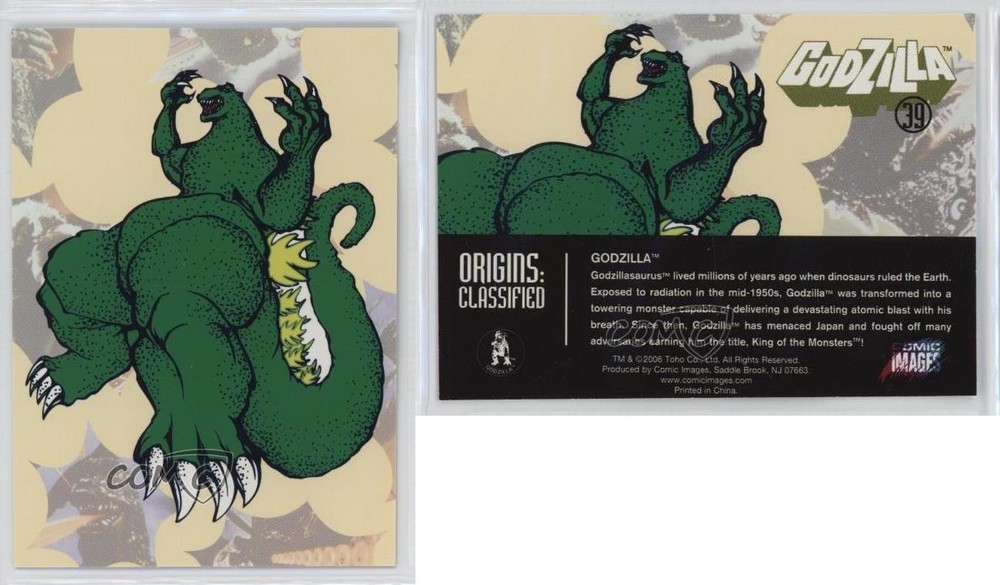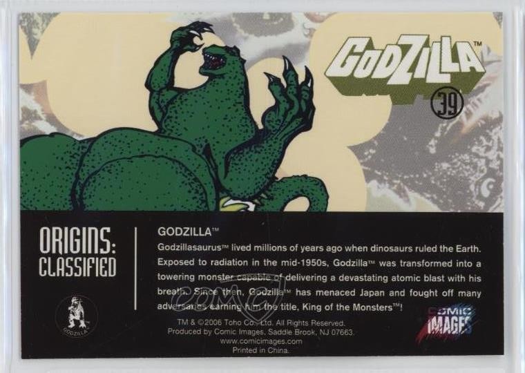 2006 Comic Images Godzilla: King of the Monsters - [Base] #39 Origins: Classified - Godzilla COMC Item: 257350284 - Non-Sports Card - Featuring Godzilla Search for more: 2006 Comic Images Godzilla: King of the Monsters Search for more: 2006 Comic Images Godzilla: King of the Monsters - [Base] View all of our Listings Auctions Buy It Now About Us Located in the beautiful Pacific Northwest, COMC (Check Out My Cards) is the world's largest consignment service for trading card singles. More than 10,000 people have used our consignment service to list over 50 million trading cards. Find out how we can help you consign your items on eBay by contacting us through eBay messaging. COMC -- "The Safe & Easy Way to Buy & Sell" Raw Condition for Modern Cards Unless otherwise noted, raw modern cards are listed in Near Mint-Mint condition or better. A NM-MT card appears to be Mint at first glance, but upon closer inspection, may exhibit some of the following: minor print defects (e.g. roller marks, print line, dimple), minor scratches, slight edge wear, and slight corner wear. Centering is clearly visible in the images provided and does not factor into our condition assessment. Raw Condition for Vintage Cards Unless otherwise noted, raw vintage cards are listed in Excellent condition or better. An EX card may exhibit some of the following: minor rounding of corners, surface wear, print defects, light scratches, and slight edge wear/chipping. Centering is clearly visible in the images provided and does not factor into our condition assessment. Domestic Shipping Combined shipping for multiple items is available. To receive combined shipping, please ensure all desired items are in your eBay shopping cart before proceeding to checkout. eBay limits orders to 40 items per order. We automatically combine multiple orders placed on the same day. If you place multiple orders on the same day, please contact us to request a refund of applicable shipping costs. Signature confirmation may be required on invoices over $400. All cards are protected and shipped securely. International Shipping COMC offers eBay's International Shipping (EIS) for international orders under $2,500* (see country exceptions below). All duties and import fees are paid at checkout; in the rare event that there are additional import fees upon delivery, these are borne by the buyer. EIS packages route through a shipping hub in Erlanger, KY before shipping to their final destination. Please note that EIS does not allow for combined shipments. The shipping rates are determined by eBay and cannot be adjusted. *Maximum sale price exceptions: Colombia, Kuwait ($2,000); Taiwan ($1,539); Chile, Costa Rica, Guatemala, Honduras, Trinidad and Tobago ($1,000); Antigua and Barbuda, Aruba, Belize, Dominica, Grenada, Philippines, Saint Kitts and Nevis, Saint Lucia, Montserrat, Turks and Caicos Islands ($500); Dominican Republic, El Salvador ($200). Please request a shipping quote through eBay messaging for orders that exceed the maximum sale price supported by eBay's International Shipping. You will be responsible for all duties and import fees for international orders shipped outside the EIS. All cards are protected and shipped securely. Payment COMC does not accept offers on our cards through our eBay storefront. COMC utilizes eBay’s managed payments system. If you are experiencing difficulties making a payment, please contact eBay for assistance. Return Policy Returns are only accepted on the rare occasion the item is not as described. If you are making a return, please initiate the return process through eBay so a mailing label can be provided for you. Prior to listing, our expert team carefully assessed this item to represent it accurately. Please review the description and high-definition images prior to purchasing to ensure this item meets your satisfaction. We welcome you to contact us if you have further questions about this item. Trust and Integrity COMC carefully assesses each item consigned to us to prevent fraudulent items from entering the marketplace. If you believe an item offered on COMC may be fraudulent, please contact us with details so we can investigate the issue. Items we determine are outside our supported items policy may be removed. Last Modified: 5/18/2025 9:19:39 PM PDT