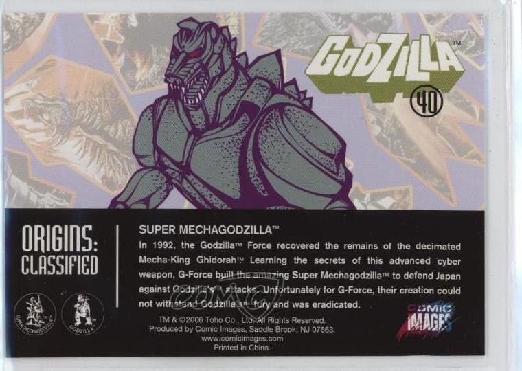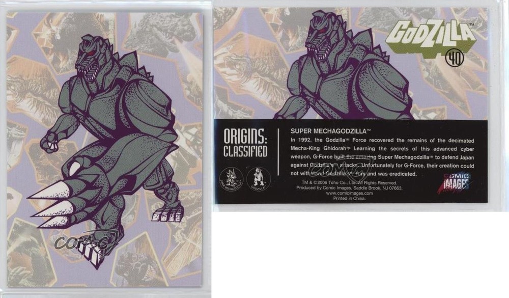 2006 Comic Images Godzilla: King of the Monsters - [Base] #40 Origins: Classified - Super Mechagodzilla COMC Item: 257350288 - Non-Sports Card - Featuring Super Mechagodzilla Search for more: 2006 Comic Images Godzilla: King of the Monsters Search for more: 2006 Comic Images Godzilla: King of the Monsters - [Base] View all of our Listings Auctions Buy It Now About Us Located in the beautiful Pacific Northwest, COMC (Check Out My Cards) is the world's largest consignment service for trading card singles. More than 10,000 people have used our consignment service to list over 50 million trading cards. Find out how we can help you consign your items on eBay by contacting us through eBay messaging. COMC -- "The Safe & Easy Way to Buy & Sell" Raw Condition for Modern Cards Unless otherwise noted, raw modern cards are listed in Near Mint-Mint condition or better. A NM-MT card appears to be Mint at first glance, but upon closer inspection, may exhibit some of the following: minor print defects (e.g. roller marks, print line, dimple), minor scratches, slight edge wear, and slight corner wear. Centering is clearly visible in the images provided and does not factor into our condition assessment. Raw Condition for Vintage Cards Unless otherwise noted, raw vintage cards are listed in Excellent condition or better. An EX card may exhibit some of the following: minor rounding of corners, surface wear, print defects, light scratches, and slight edge wear/chipping. Centering is clearly visible in the images provided and does not factor into our condition assessment. Domestic Shipping Combined shipping for multiple items is available. To receive combined shipping, please ensure all desired items are in your eBay shopping cart before proceeding to checkout. eBay limits orders to 40 items per order. We automatically combine multiple orders placed on the same day. If you place multiple orders on the same day, please contact us to request a refund of applicable shipping costs. Signature confirmation may be required on invoices over $400. All cards are protected and shipped securely. International Shipping COMC offers eBay's International Shipping (EIS) for international orders under $2,500* (see country exceptions below). All duties and import fees are paid at checkout; in the rare event that there are additional import fees upon delivery, these are borne by the buyer. EIS packages route through a shipping hub in Erlanger, KY before shipping to their final destination. Please note that EIS does not allow for combined shipments. The shipping rates are determined by eBay and cannot be adjusted. *Maximum sale price exceptions: Colombia, Kuwait ($2,000); Taiwan ($1,539); Chile, Costa Rica, Guatemala, Honduras, Trinidad and Tobago ($1,000); Antigua and Barbuda, Aruba, Belize, Dominica, Grenada, Philippines, Saint Kitts and Nevis, Saint Lucia, Montserrat, Turks and Caicos Islands ($500); Dominican Republic, El Salvador ($200). Please request a shipping quote through eBay messaging for orders that exceed the maximum sale price supported by eBay's International Shipping. You will be responsible for all duties and import fees for international orders shipped outside the EIS. All cards are protected and shipped securely. Payment COMC does not accept offers on our cards through our eBay storefront. COMC utilizes eBay’s managed payments system. If you are experiencing difficulties making a payment, please contact eBay for assistance. Return Policy Returns are only accepted on the rare occasion the item is not as described. If you are making a return, please initiate the return process through eBay so a mailing label can be provided for you. Prior to listing, our expert team carefully assessed this item to represent it accurately. Please review the description and high-definition images prior to purchasing to ensure this item meets your satisfaction. We welcome you to contact us if you have further questions about this item. Trust and Integrity COMC carefully assesses each item consigned to us to prevent fraudulent items from entering the marketplace. If you believe an item offered on COMC may be fraudulent, please contact us with details so we can investigate the issue. Items we determine are outside our supported items policy may be removed. Last Modified: 5/22/2025 3:25:19 AM PDT
