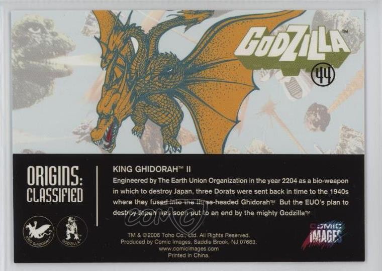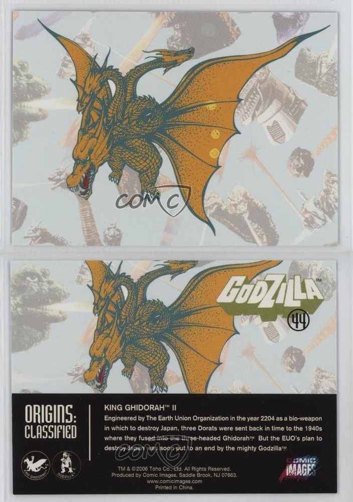 2006 Comic Images Godzilla: King of the Monsters - [Base] #44 Origins: Classified - King Ghidorah II COMC Item: 257350274 - Non-Sports Card - Featuring King Ghidorah II Search for more: 2006 Comic Images Godzilla: King of the Monsters Search for more: 2006 Comic Images Godzilla: King of the Monsters - [Base] View all of our Listings Auctions Buy It Now About Us Located in the beautiful Pacific Northwest, COMC (Check Out My Cards) is the world's largest consignment service for trading card singles. More than 10,000 people have used our consignment service to list over 50 million trading cards. Find out how we can help you consign your items on eBay by contacting us through eBay messaging. COMC -- "The Safe & Easy Way to Buy & Sell" Raw Condition for Modern Cards Unless otherwise noted, raw modern cards are listed in Near Mint-Mint condition or better. A NM-MT card appears to be Mint at first glance, but upon closer inspection, may exhibit some of the following: minor print defects (e.g. roller marks, print line, dimple), minor scratches, slight edge wear, and slight corner wear. Centering is clearly visible in the images provided and does not factor into our condition assessment. Raw Condition for Vintage Cards Unless otherwise noted, raw vintage cards are listed in Excellent condition or better. An EX card may exhibit some of the following: minor rounding of corners, surface wear, print defects, light scratches, and slight edge wear/chipping. Centering is clearly visible in the images provided and does not factor into our condition assessment. Domestic Shipping Combined shipping for multiple items is available. To receive combined shipping, please ensure all desired items are in your eBay shopping cart before proceeding to checkout. eBay limits orders to 40 items per order. We automatically combine multiple orders placed on the same day. If you place multiple orders on the same day, please contact us to request a refund of applicable shipping costs. Signature confirmation may be required on invoices over $400. All cards are protected and shipped securely. International Shipping COMC offers eBay's International Shipping (EIS) for international orders under $2,500* (see country exceptions below). All duties and import fees are paid at checkout; in the rare event that there are additional import fees upon delivery, these are borne by the buyer. EIS packages route through a shipping hub in Erlanger, KY before shipping to their final destination. Please note that EIS does not allow for combined shipments. The shipping rates are determined by eBay and cannot be adjusted. *Maximum sale price exceptions: Colombia, Kuwait ($2,000); Taiwan ($1,539); Chile, Costa Rica, Guatemala, Honduras, Trinidad and Tobago ($1,000); Antigua and Barbuda, Aruba, Belize, Dominica, Grenada, Philippines, Saint Kitts and Nevis, Saint Lucia, Montserrat, Turks and Caicos Islands ($500); Dominican Republic, El Salvador ($200). Please request a shipping quote through eBay messaging for orders that exceed the maximum sale price supported by eBay's International Shipping. You will be responsible for all duties and import fees for international orders shipped outside the EIS. All cards are protected and shipped securely. Payment COMC does not accept offers on our cards through our eBay storefront. COMC utilizes eBay’s managed payments system. If you are experiencing difficulties making a payment, please contact eBay for assistance. Return Policy Returns are only accepted on the rare occasion the item is not as described. If you are making a return, please initiate the return process through eBay so a mailing label can be provided for you. Prior to listing, our expert team carefully assessed this item to represent it accurately. Please review the description and high-definition images prior to purchasing to ensure this item meets your satisfaction. We welcome you to contact us if you have further questions about this item. Trust and Integrity COMC carefully assesses each item consigned to us to prevent fraudulent items from entering the marketplace. If you believe an item offered on COMC may be fraudulent, please contact us with details so we can investigate the issue. Items we determine are outside our supported items policy may be removed. Last Modified: 5/18/2025 9:19:34 PM PDT