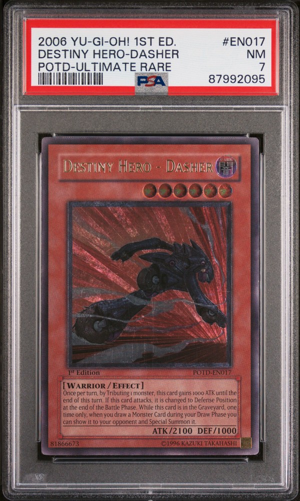 Description Condition: PSA 7 NM Availability: In Stock You are Purchasing 2006 YUGIOH 1ST ED POTD-EN017 DESTINY HERO-DASHER ULTIMATE PSA 7 NM #87992095 Professionally graded by Professional Sports Authenticator (PSA) *PLEASE REVIEW PHOTO(S) BEFORE BIDDING/BUYING. >>MORE GRADED YUGIOH CARDS<< IG: CARD_RUSH_INC Payment Options Payment is expected within 7 days of your purchase date. We accept all forms of payments through Paypal. Shipping and Handling We ship to all U.S. states, U.S. territories, APO/FPO locations and any international countries listed under our "ship to" heading. Shipping and Handling is calculated based on the combined shipping weight of your item(s). Please use the shipping calculator to estimate your shipping and handling charges. In order to qualify for combined shipping terms, all items must be paid for in one payment; please do not pay until you are done bidding/shopping. Please contact us if you have any questions regarding our shipping and handling terms. Shipping and Delivery Packages are shipped out every Monday, Wednesday, and Friday. Domestic Packages take approximately 2-7 days to arrive. International packages may take a little longer to arrive, typically 1-4 weeks. Please allow ample transit times before inquiring about your package, thank you. Sales Tax Sales tax will be automatically collected by Ebay. Customer Service We will make every effort to get your purchase is mailed in a timely manner. Please contact us if you have any questions or concerns; we would love to hear any suggestions you have on how we can improve your eBay experience. Thank you for visiting us today.
