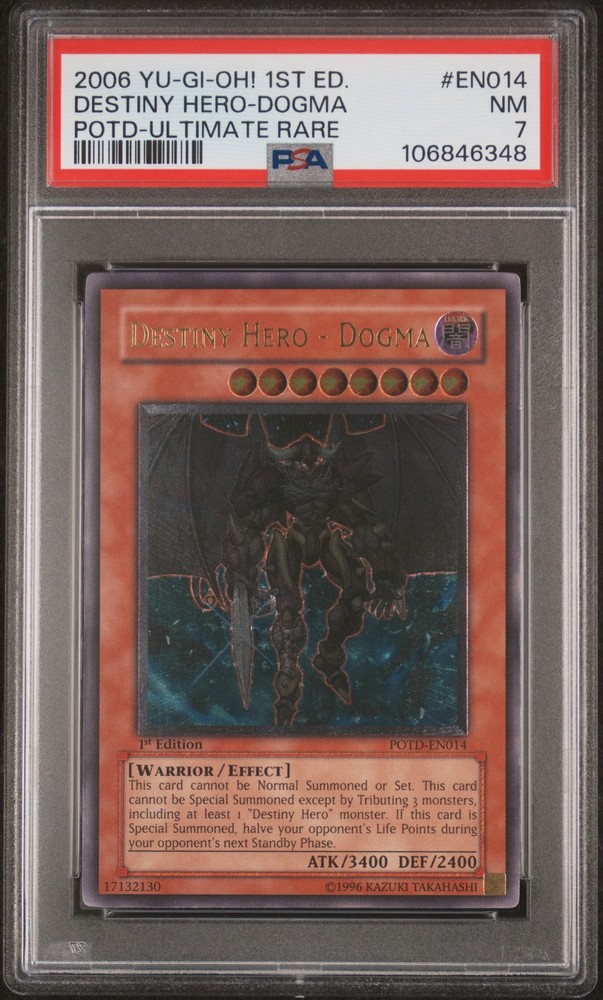2006 YU-GI-OH! POTD-POWER OF THE DUELIST 1ST EDITION-ULTIMATE RARE #EN014 DESTINY HERO-DOGMA PSA 7 2006 YU-GI-OH! POTD-POWER OF THE DUELIST 1ST EDITION-ULTIMATE RARE #EN014 DESTINY HERO-DOGMA PSA 7 Purchase Info Thank you for your interest in this item consigned with PSA! By purchasing or making an offer on this item, you acknowledge and agree to the following terms: All sales are final. Returns not accepted. Payment must be made upon purchase of the item. All items are sold "as is" and without warranty of Collectors Universe, Inc. (d/b/a PSA), and ANY AND ALL IMPLIED WARRANTIES ARE DISCLAIMED AND EXCLUDED. Sales tax may apply depending on shipping address. PSA does not guarantee that another third-party grading company's authentication or certification of an item as genuine is correct or accurate. Neither a difference of opinion between third-party grading companies about authenticity, nor a company's subsequent reversal of its earlier authentication or certification of an item, will be a basis for rescinding a sale. Any dispute with another third-party grading company relating to the authenticity of an item must be resolved directly with that other company. Collectors' maximum liability in the event of loss or damage to an item during shipping will be the lesser of (a) the price paid for the item and (b) the change in fair market value of the item. You release Collectors from all other liability including for any claims of punitive damages, emotional distress, consequential damages, lost profits, or lost interest, except as prohibited by law. Shipping Purchased Items will be shipped directly from PSA Vault. You stay hands-free. PSA Vault When you purchase this item, you can save on sales tax and selling fees by keeping it in the PSA Vault, official Vault of eBay. Items already in PSA Vault and will be sent to PSA Vault will have no shipping charge Storage of any items with the PSA Vault will be subject to the PSA Vault Terms of Service. Consignment PSA has competitive rates on the world's largest collectibles marketplace with the option to list from the PSA Vault or immediately after PSA authentication and grading. Sale Price Under $100 $100 - $499 $500 - $999 $1,000 - $2,499 $2,500 - $4,999 $5,000+ Seller Fee 16% 14% 13% 10% 9% 7% Sellers pay a single fee as reflected above; no additional eBay fees are incurred. There is a $5 minimum fee on sold items.