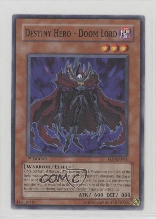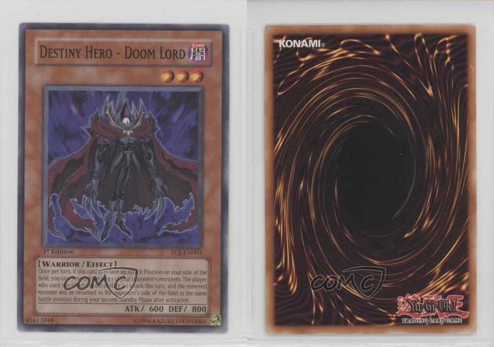 2006 Yu-Gi-Oh! - Enemy of Justice - [Base] - 1st Edition #EOJ-EN001 Destiny Hero - Doom Lord COMC Item: 195877257 - YuGiOh Card Search for more: 2006 Yu-Gi-Oh! - Enemy of Justice Search for more: 2006 Yu-Gi-Oh! - Enemy of Justice - [Base] - 1st Edition View all of our Listings Auctions Buy It Now About Us Located in the beautiful Pacific Northwest, COMC (Check Out My Cards) is the world's largest consignment service for trading card singles. More than 10,000 people have used our consignment service to list over 50 million trading cards. Find out how we can help you consign your items on eBay by contacting us through eBay messaging. COMC -- "The Safe & Easy Way to Buy & Sell" Raw Condition for Modern Cards Unless otherwise noted, raw modern cards are listed in Near Mint-Mint condition or better. A NM-MT card appears to be Mint at first glance, but upon closer inspection, may exhibit some of the following: minor print defects (e.g. roller marks, print line, dimple), minor scratches, slight edge wear, and slight corner wear. Centering is clearly visible in the images provided and does not factor into our condition assessment. Raw Condition for Vintage Cards Unless otherwise noted, raw vintage cards are listed in Excellent condition or better. An EX card may exhibit some of the following: minor rounding of corners, surface wear, print defects, light scratches, and slight edge wear/chipping. Centering is clearly visible in the images provided and does not factor into our condition assessment. Domestic Shipping Combined shipping for multiple items is available. To receive combined shipping, please ensure all desired items are in your eBay shopping cart before proceeding to checkout. eBay limits orders to 40 items per order. We automatically combine multiple orders placed on the same day. If you place multiple orders on the same day, please contact us to request a refund of applicable shipping costs. Signature confirmation may be required on invoices over $400. All cards are protected and shipped securely. International Shipping COMC offers eBay's International Shipping (EIS) for international orders under $2,500* (see country exceptions below). All duties and import fees are paid at checkout; in the rare event that there are additional import fees upon delivery, these are borne by the buyer. EIS packages route through a shipping hub in Erlanger, KY before shipping to their final destination. Please note that EIS does not allow for combined shipments. The shipping rates are determined by eBay and cannot be adjusted. *Maximum sale price exceptions: Colombia, Kuwait ($2,000); Taiwan ($1,539); Chile, Costa Rica, Guatemala, Honduras, Trinidad and Tobago ($1,000); Antigua and Barbuda, Aruba, Belize, Dominica, Grenada, Philippines, Saint Kitts and Nevis, Saint Lucia, Montserrat, Turks and Caicos Islands ($500); Dominican Republic, El Salvador ($200). Please request a shipping quote through eBay messaging for orders that exceed the maximum sale price supported by eBay's International Shipping. You will be responsible for all duties and import fees for international orders shipped outside the EIS. All cards are protected and shipped securely. Payment COMC does not accept offers on our cards through our eBay storefront. COMC utilizes eBay’s managed payments system. If you are experiencing difficulties making a payment, please contact eBay for assistance. Return Policy Returns are only accepted on the rare occasion the item is not as described. If you are making a return, please initiate the return process through eBay so a mailing label can be provided for you. Prior to listing, our expert team carefully assessed this item to represent it accurately. Please review the description and high-definition images prior to purchasing to ensure this item meets your satisfaction. We welcome you to contact us if you have further questions about this item. Trust and Integrity COMC carefully assesses each item consigned to us to prevent fraudulent items from entering the marketplace. If you believe an item offered on COMC may be fraudulent, please contact us with details so we can investigate the issue. Items we determine are outside our supported items policy may be removed. Last Modified: 6/19/2025 2:19:42 AM PDT