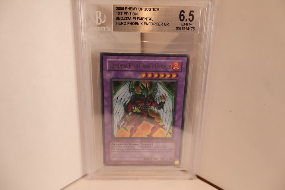 Unleash the power of the Elemental HERO Phoenix Enforcer from the Enemy of Justice set, a must-have for any Yu-Gi-Oh! TCG enthusiast. This Ultra Rare Fusion card, EOJ-EN032, is a standout with its fiery attribute, boasting an impressive 1200 defense and 2100 attack capabilities. Konami's craftsmanship shines through in this 1st Edition piece, dating back to a fiery 2006 release.The card comes professionally graded, ensuring its quality and authenticity. With the certification number 0017914175 and a grade of 6.5, the Elemental HERO Phoenix Enforcer is poised to be a beacon in your collection, ready to summon the might of its warrior type in both English and fiery duel scenes alike.