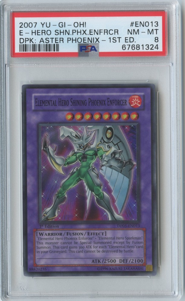 2007 Yu-Gi-Oh! Elemental Hero Shining Phoenix Enforcer - 1st Edition - Super Rare - #DP05-EN013 - PSA 8 . Picture in the description is the exact card you will receive! International Buyers – Please Note: Import duties, taxes, and charges are not included in the item price or shipping cost. These charges are the buyer's responsibility. Please check with your country's customs office to determine what these additional costs will be prior to bidding or buying.