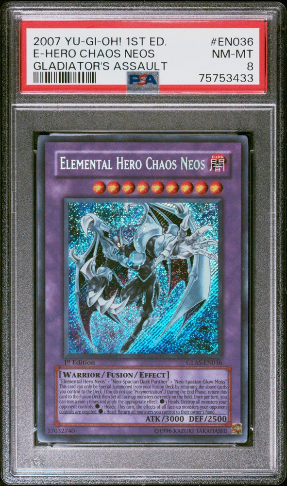 Description Condition: PSA 8 NM-MT Availability: In Stock You are Purchasing 2007 YUGIOH 1ST GLAS-EN036 ELEMENTAL HERO CHAOS NEOS SECRET PSA 8 NM #75753433 Professionally graded by Professional Sports Authenticator (PSA) *PLEASE REVIEW PHOTO(S) BEFORE BIDDING/BUYING. >>MORE GRADED YUGIOH CARDS<< IG: CARD_RUSH_INC Payment Options Payment is expected within 7 days of your purchase date. We accept all forms of payments through Paypal. Shipping and Handling We ship to all U.S. states, U.S. territories, APO/FPO locations and any international countries listed under our "ship to" heading. Shipping and Handling is calculated based on the combined shipping weight of your item(s). Please use the shipping calculator to estimate your shipping and handling charges. In order to qualify for combined shipping terms, all items must be paid for in one payment; please do not pay until you are done bidding/shopping. Please contact us if you have any questions regarding our shipping and handling terms. Shipping and Delivery Packages are shipped out every Monday, Wednesday, and Friday. Domestic Packages take approximately 2-7 days to arrive. International packages may take a little longer to arrive, typically 1-4 weeks. Please allow ample transit times before inquiring about your package, thank you. Sales Tax Sales tax will be automatically collected by Ebay. Customer Service We will make every effort to get your purchase is mailed in a timely manner. Please contact us if you have any questions or concerns; we would love to hear any suggestions you have on how we can improve your eBay experience. Thank you for visiting us today.