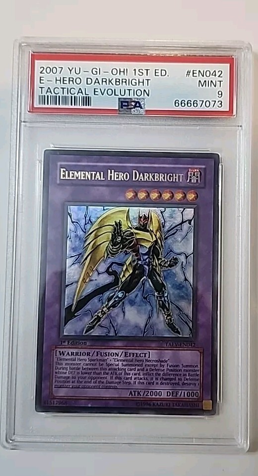 This is a rare 2007 Yu-Gi-Oh! 1st edition Elemental Hero Dark Bright holo card, numbered #TAEV-EN042. It has been professionally graded by PSA and received a grade of 9. This non-sport trading card features the beloved Yu-Gi-Oh! franchise and is a must-have for any collector. The card is from the year 2007 and is an ultra-rare find. Don't miss your chance to own this incredible piece of Yu-Gi-Oh! history.