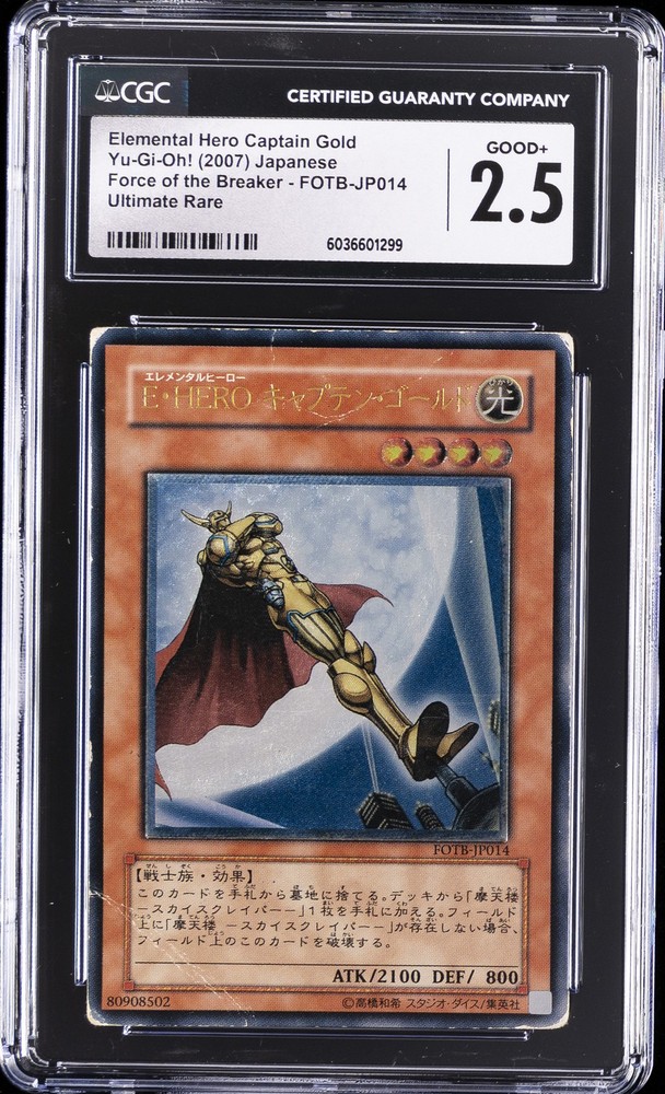 2007 YU-GI-OH! JAPANESE FORCE OF THE BREAKER - ULTIMATE RARE #FOTB-JP014 ELEMENTAL HERO CAPTAIN GOLD CGC 2.5 2007 YU-GI-OH! JAPANESE FORCE OF THE BREAKER - ULTIMATE RARE #FOTB-JP014 ELEMENTAL HERO CAPTAIN GOLD CGC 2.5 Purchase Info Thank you for your interest in bidding on this item consigned with PSA! By bidding on this item, you acknowledge and agree to the following terms: All sales are final. Returns not accepted. Payment must be made within 7 days of auction close. All items are sold "as is" and without warranty of Collectors Universe, Inc. (d/b/a PSA), and ANY AND ALL IMPLIED WARRANTIES ARE DISCLAIMED AND EXCLUDED. Sales tax may apply depending on shipping address. PSA does not guarantee that another third-party grading company's authentication or certification of an item as genuine is correct or accurate. Neither a difference of opinion between third-party grading companies about authenticity, nor a company's subsequent reversal of its earlier authentication or certification of an item, will be a basis for rescinding a sale. Any dispute with another third-party grading company relating to the authenticity of an item must be resolved directly with that other company. Collectors' maximum liability in the event of loss or damage to an item during shipping will be the lesser of (a) the price paid for the item and (b) the change in fair market value of the item. You release Collectors from all other liability including for any claims of punitive damages, emotional distress, consequential damages, lost profits, or lost interest, except as prohibited by law. Shipping Purchased Items will be shipped directly from PSA Vault. You stay hands-free. PSA Vault When you purchase this item, you can save on sales tax and selling fees by keeping it in the PSA Vault, official Vault of eBay. Items already in PSA Vault and will be sent to PSA Vault will have no shipping charge Storage of any items with the PSA Vault will be subject to the PSA Vault Terms of Service. Consignment PSA has competitive auction rates on the world's largest collectibles marketplace with the option to list from the PSA Vault or immediately after PSA authentication and grading. Sale Price Under $100 $100 - $499 $500 - $999 $1,000 - $2,499 $2,500 - $4,999 $5,000+ Seller Fee 13% + $3 flat 13% 12% 10% 9% 7% Sellers pay a single fee as reflected above; no additional eBay fees are incurred.
