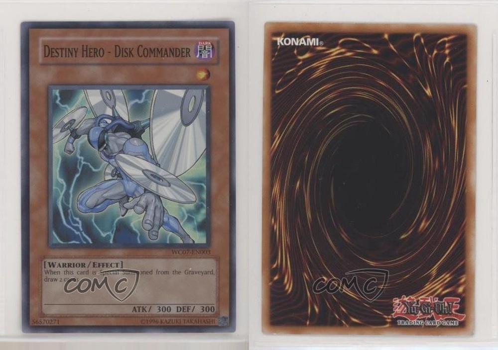 2007 Yu-Gi-Oh! World Championship Tournament 2007 - Gameboy Advance Promos #WC07-EN003 Destiny HERO - Disk Commander COMC Item: 71007998 - YuGiOh Card - Featuring Destiny HERO - Disk Commander Search for more: 2007 Yu-Gi-Oh! World Championship Tournament 2007 Search for more: 2007 Yu-Gi-Oh! World Championship Tournament 2007 - Gameboy Advance Promos View all of our Listings Auctions Buy It Now About Us Located in the beautiful Pacific Northwest, COMC (Check Out My Cards) is the world's largest consignment service for trading card singles. More than 10,000 people have used our consignment service to list over 50 million trading cards. Find out how we can help you consign your items on eBay by contacting us through eBay messaging. COMC -- "The Safe & Easy Way to Buy & Sell" Raw Condition for Modern Cards Unless otherwise noted, raw modern cards are listed in Near Mint-Mint condition or better. A NM-MT card appears to be Mint at first glance, but upon closer inspection, may exhibit some of the following: minor print defects (e.g. roller marks, print line, dimple), minor scratches, slight edge wear, and slight corner wear. Centering is clearly visible in the images provided and does not factor into our condition assessment. Raw Condition for Vintage Cards Unless otherwise noted, raw vintage cards are listed in Excellent condition or better. An EX card may exhibit some of the following: minor rounding of corners, surface wear, print defects, light scratches, and slight edge wear/chipping. Centering is clearly visible in the images provided and does not factor into our condition assessment. Domestic Shipping Combined shipping for multiple items is available. To receive combined shipping, please ensure all desired items are in your eBay shopping cart before proceeding to checkout. eBay limits orders to 40 items per order. We automatically combine multiple orders placed on the same day. If you place multiple orders on the same day, please contact us to request a refund of applicable shipping costs. Signature confirmation may be required on invoices over $400. All cards are protected and shipped securely. International Shipping COMC offers eBay's International Shipping (EIS) for international orders under $2,500* (see country exceptions below). All duties and import fees are paid at checkout; in the rare event that there are additional import fees upon delivery, these are borne by the buyer. EIS packages route through a shipping hub in Erlanger, KY before shipping to their final destination. Please note that EIS does not allow for combined shipments. The shipping rates are determined by eBay and cannot be adjusted. *Maximum sale price exceptions: Colombia, Kuwait ($2,000); Taiwan ($1,539); Chile, Costa Rica, Guatemala, Honduras, Trinidad and Tobago ($1,000); Antigua and Barbuda, Aruba, Belize, Dominica, Grenada, Philippines, Saint Kitts and Nevis, Saint Lucia, Montserrat, Turks and Caicos Islands ($500); Dominican Republic, El Salvador ($200). Please request a shipping quote through eBay messaging for orders that exceed the maximum sale price supported by eBay's International Shipping. You will be responsible for all duties and import fees for international orders shipped outside the EIS. All cards are protected and shipped securely. Payment COMC does not accept offers on our cards through our eBay storefront. COMC utilizes eBay’s managed payments system. If you are experiencing difficulties making a payment, please contact eBay for assistance. Return Policy Returns are only accepted on the rare occasion the item is not as described. If you are making a return, please initiate the return process through eBay so a mailing label can be provided for you. Prior to listing, our expert team carefully assessed this item to represent it accurately. Please review the description and high-definition images prior to purchasing to ensure this item meets your satisfaction. We welcome you to contact us if you have further questions about this item. Trust and Integrity COMC carefully assesses each item consigned to us to prevent fraudulent items from entering the marketplace. If you believe an item offered on COMC may be fraudulent, please contact us with details so we can investigate the issue. Items we determine are outside our supported items policy may be removed. Last Modified: 6/25/2025 12:24:13 AM PDT